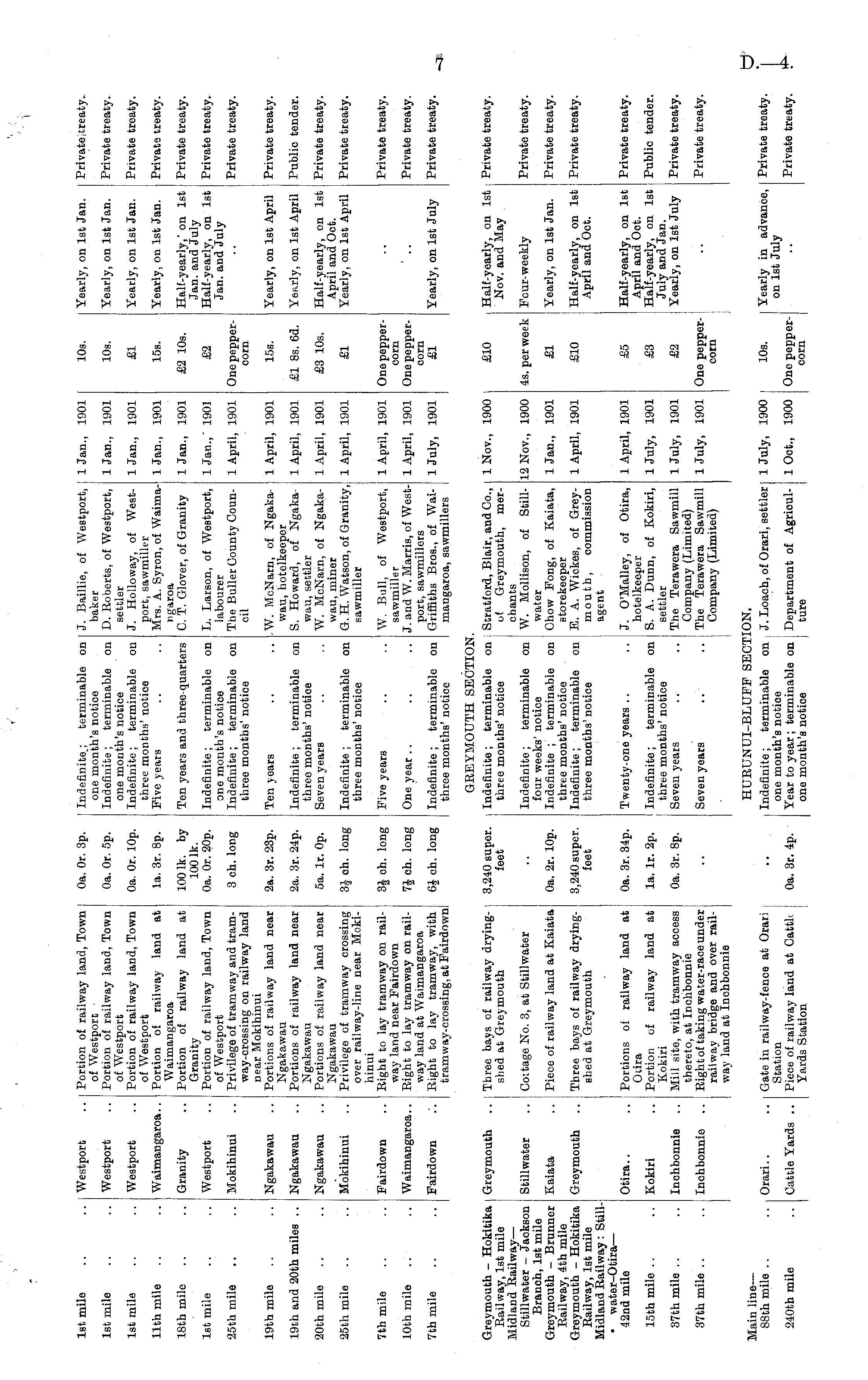 1st mile Westport Portion of railway land, Town of Westport • Portion of railway land, Town of Westport Portion of railway land, Town of Westport Portion of railway land at Waimangaroa Portion of railway land at Granity Portion of railway land, Town of Westport Privilege of tramway and tram-way-crossing on railway land near Mokihinui Portions of railway land near Ngakawau Portions of railway land near Ngakawau Portions of railway land near Ngakawau Privilege of tramway crossing over railway-line near Mokihinui Right to lay tramway on railway land near Fairdown Right to lay tramway on railway land at Waimangaroa Right to lay tramway, with tramway-crossing, at Fairdown 0a. Or. 3p. Indefinite; terminable on J. Baillie, of Westport, one month's notice baker Indefinite ; terminable on D. Roberts, of Weatport, one month's notice settler Indefinite; terminable on J. Holloway, of Westthree months' notice port, sawmiller Five years .. .. Mrs. A. Syron, of Waima1 Jan., 1901 10s. Yearly, on 1st Jan. Private.treaty. 1st mile Westport 0a. Or. 5p. 1 Jan., 1901 10s. Yearly, on 1st Jan. Private treaty. 1st mile Westport 0a. Or. 10p. 1 Jan., 1901 £1 Yearly, on 1st Jan. Private treaty. 11th mile Waimangaroa.. la. 3r. 8p. 1 Jan., 1901 15s. Yearly, on 1st Jan. Private treaty. 18th mile Granity 100 Ik. by 100 Ik. 0a. Or. 20p. ngaroa Ten years and three-quarters C. T. Glover, of Granity 1 Jan., 1901 £2 10s. Half-yearly,' on 1st Private treaty. Jan. and July £2 Half-yearly, on 1st Private treaty. Jan. and July 1st mile Westport Indefinite; terminable on L. Larson, of Westport, one month's notice labourer Indefinite; terminable on The Buller County Counthree months' notice cil 1 Jan., 1901 25th mile Mokihinui 3 ch. long 1 April, 1901 One pepper- .. Private treaty, corn 19th mile Ngakawau 2a. 3r. 23p. Ten years .. .. W. McNarn, of Ngakawau, hotelkeeper Indefinite; terminable on S. Howard, of Ngakathree months' notioe wau, settler Seven years .. .. W. McNarn, of Ngakawau, miner Indefinite ; terminable on G. H. Watson, of Granity, three months' notice sawmiller 1 April, 1901 15s. Yearly, on 1st April Private treaty. 19th and 20th miles .. Ngakawau 2a. 3r. 24p. 1 April, 1901 £1 8s. 6d. yearly, on 1st April Public tender. 20th mile Ngakawau 5a. lr. Op. 1 April, 1901 £3 10s. Half-yearly, on 1st Private treaty. April and Oct. £1 Yearly, on 1st April Private treaty. 25 th mile Mokihinui 3 J oh. long 1 April, 1901 7th mile Fairdown 3 J ch. long Five years .. .. W. Bull, of Westport, sawmiller One year .. .. .. J. and W. Marris, of Westport, sawmillers Indefinite ; terminable on Griffiths Bros., of Waithree months' notice mangaroa, sawmillers 1 April, 1901 One pepper- .. Private treaty. corn One pepper- ' .. Private treaty. corn £1 Yearly, on 1st July Private treaty. 10th mile Waimangaroa.. 7J ch. long 1 April, 1901 7th mile Fairdown 6J ch. long 1 July, 1901 Greymouth - Hokitika Eailway, 1st mile Midland Railway — Stillwater - Jackson Branch, 1st mile Greymouth - Brunner Railway, 4th mile Greymouth - Hokitika Railway, 1st mile Midland Railway: Still- • water-Otira — 42nd mile Greymouth Three bays of railway drying- i shed at Greymouth 3,240 super, feet GREYMOUTH SECTION. INov., 1900 £10 Half-yearly, on 1st Private treaty. Nov. and May Stillwater Kaiata Cottage No. 3, at Stillwater Piece of railway land at Kaiata 0a. 2r. 10p. Indefinite ; terminable on Stratford, Blair, and Co., three mouths' notice ] of Greymouth, meri chants Indefinite; terminable on W. Mollison, of Stillfour weeks' notice water Indefinite ; terminable on Chow Fong, of Kaiata, three months' notice storekeeper Indefinite; terminable on B. A. Wiokes, of Greythree months' notice mouth, commission agent 12 Nov., 1900 1 Jan., 1901 4s. per week Four- weekly Private treaty. £1 Yearly, on 1st Jan. Private treaty. Greymouth Three bays of railway dryingshed at Greymouth 3,240 super, feet 1 April, 1901 £10 Half-yearly, on 1st Private treaty. April and Oct. Otira.. Portions of railway land at Odra Portion of railway land at Kokiri Mill site, with tramway access thereto, at Inchbonnie Right of taking water-race under railway bridge and over railway land at Inchbonnie 0a. 3r. 34p. Twenty-one years .. .. J. O'Malley, of Otira, hotelkeeper Indefinite; terminable on S. A. Dunn, of Kokiri, three months' notice settler Seven years .. .. The Terawera Sawmill Company (Limited) Seven years .. .. The Terawera Sawmill Company (Limited) 1 April, 1901 £5 Half-yearly, on 1st Private treaty. April and Oot. £3 Half-yearly, on 1st Public tender. July and Jan. £2 Yearly, on 1st July Private treaty. 15th mile Kokiri la. lr. 2p. 1 July, 1901 37th mile Inchbonnie 0a. 3r. 8p. 1 July, 1901 37th mile Inchbonnie .. 1 July, 1901 One pepper- .. Private treaty, corn Main line — 88th mile .. .. , Orari Gate in railway-fence at Orari I Station Piece of railway land at Cattli Yards Station HURUNUI-BLUFF SECTION. 1 July, 1900 10s. Yearly in advance, Private treaty. on 1st July One pepper- .. Private treaty, corn 240th mile Cattle Yards .. 0a. 3r. 4p. Indefinite ; terminable on , J. Loach, of Orari, settler one month's notioe Year to year ; terminable on Department of Agrioulone month's notice ture 1 Oct., 1900
