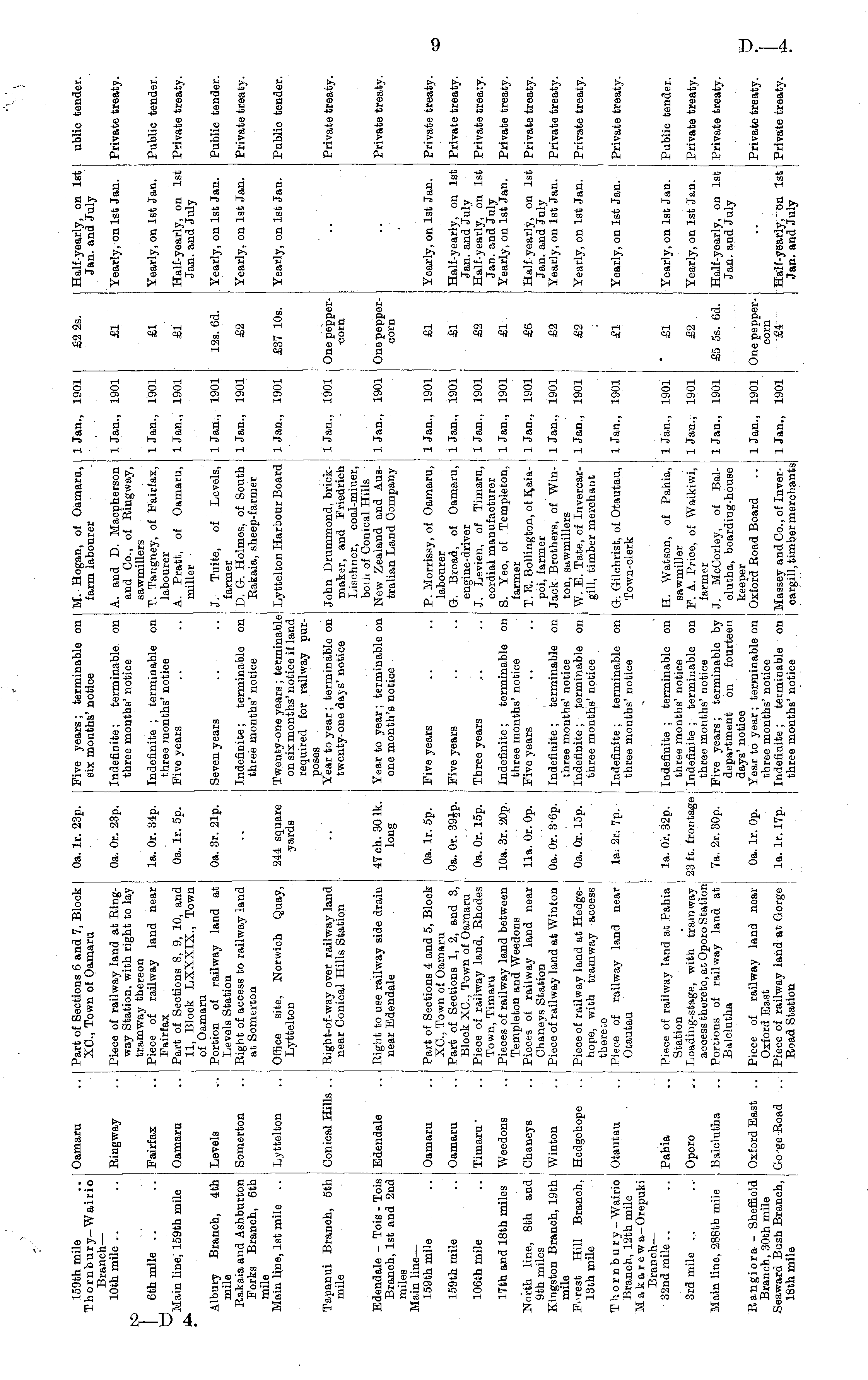 159th mile Thornbury-Wairio Branch — 10th mile .. Oamaru Part of Sections 6 and 7, Block XC, Town of Oamaru 0a. lr. 23p. Five years; terminable on six months' notice M. Hogan, of Oamaru, farm labourer 1 Jan., 1901 £2 2s. Half-yearly, on 1st Jan. and July ublic tender. Bingway Piece of railway land at Bingway Station, with right to lay tramway thereon Piece of railway land near Fairfax Part of Sections 8, 9, 10, and 11, Block LXXXIX., Town of Oamaru Portion of railway land at Levels Station Right of access to railway land at Somerton 0a. Or. 23p. Indefinite; terminable on three months' notice A. and D. Maopherson and Co., of Ringway, sawmillers T. Tangney, of Fairfax, labourer A. Pratt, of Oamaru, miller 1 Jan., 1901 £1 Yearly, on 1st Jan. Private treaty. 6th mile .. Main line, 159th mile Fairfax la. Or. 34p. Indefinite ; terminable on three months' notice Five years 1 Jan., 1901 £1 Yearly, on let Jan. Public tender. Oamaru 0a. lr. 5p. 1 Jan., 1901 £1 Half-yearly, on 1st Jan. and July Private treaty. Albury Branch, 4th mile Rakaia and Ashburton Forks Branoh, 6tb mile Main line, 1st mile Levels 0a. 3r. 21p. Seven years J. Tuite, of Levels, farmer D. G. Holmes, of South Rakaia, sheep-farmer 1 Jan., 1901 12s. 6d. Yearly, on 1st Jan. Public tender. Somerfcon Indefinite; terminable on three months' notice 1 Jan., 1901 £2 Yearly, on lat Jan. Private treaty. Lyttelton Office site, Norwich Quay, Lyttelton 244 square yards Twenty-one years; terminable on six months' notice if land required for railway purposes Year to year ; terminable on twenty- one days' notice Lyttelton Harbour Board 1 Jan., 1901 £37 10s. Yearly, on 1st Jan. Public tender. Tapanui Branch, 5th mile Conical Hills .. Edendale Right-of-way over railway land near Conical Hills Station 47 ch. 301k. long John Drummond, brickmaker, and Friedrich Lischner, coal-miner, both of Conical Hills New Zealand and Australian Land Company Uan., 1901 One pepper«om Private treaty. Private treaty. Edendale - Tois - Tois Branch, 1st and 2nd miles Main line — 159th mile Bight to use railway side drain near Edendale Year to year ; terminable on one month's notice 1 Jan., 1901 One peppercorn Oamaru Part of Sections 4 and 5, Block XC, Town of Oamaru Part of Sections 1, 2, and 3, Block XC, Town of Oamaru Piece of railway land, Rhodes Town, Timaru Pieces of railway land between Templeton and Weedons Pieces of railway land near Chaneys Station Piece of railway land at Winton 0a. lr. 5p. Five years P. Morrissy, ot Oamaru, labourer G. Broad, of Oamaru, engine-driver J. Levien, of Timaru, cordial manufacturer S. Yeo, of Templeton, farmer T. E. Bollington, of I^aiapoi, farmer Jack Brothers, of Winton, sawmillers W. E. Tate, of Invercargill, timber merchant 1 Jan., 1901 £1 Yearly, on 1st Jan. Private treaty. 159 th mile Oamaru 0a. Or. 39Jp. Five years 1 Jan., 1901 £1 Half-yearly, on 1st Jan. and July Half-yearly, on 1st Jan. and July Yearly, on 1st Jan. Private treaty. 106th mile Timaru' 0a. Or. 15p. Three years 1 Jan., 1901 £2 Private treaty. 17th and 18th miles Weedons 10a. 3r. 20p. Indefinite; terminable on three months' notice Five years 1 Jan., 1901 £1 Private treaty. North line, 8th and 9th miles Kingston Branoh, 19th mile Forest Hill Branch. 13th mile Chaneys Winton lla. Or. Op. 0a. Or. 3-6p. Indefinite; terminable on three months' notice Indefinite; terminable on three months' notice 1 Jan., 1901 1 Jan., 1901 £6 £2 Half-yearly, on 1st Jan. and July Yearly, on 1st Jan. Private treaty. Private treaty. Hedgehope Piece of railway land at Hedgehope, with tramway access thereoo Piece of railway land near Otautau 0a. Or. 15p. 1 Jan., 1901 £2 Yearly, on 1st Jan. Private treaty. Thornbury- Wairio Branch, 12th mile M a k a r e w a- Orepuki Branoh — 32nd mile Otautau la. 2r. 7p. Indefinite; terminable on three months' notice G. Gilchrist, of Otautau, Town- clerk 1 Jan., 1901 £1 Yearly, on 1st Jan. Private treaty. Pahia Piece of railway land at Pahia Station Loading-stage, with tramway access thereto, at Oporo Station Portions of railway land at Balclutha la. Or. 32p. Indefinite ; terminable on three months' notice Indefinite ; terminable on three months' notice Five years; terminable by department on fourteen days' notice Year to year; terminable on three months' notice Indefinite; terminable on three months' notice H. Watson, of Pahia, sawmiller F. A. Price, of Waikiwi, farmer J. McCorley, of Balclutha, boarding-house keeper Oxford Road Board 1 Jan., 1901 ' £1 Yearly, on 1st Jan. Public tender. 3rd mile Oporo 23 ft. frontage 1 Jan., 1901 £2 Yearly, on 1st Jan. Private treaty. Main line, 288th mile Balclutha 7a. 2r. 30p. 1 Jan., 1901 £5 5s. 6d. Half-yearly, on 1st Jan. and July Private treaty. Rangiora - Sheffield Branch, 30th mile Seaward Bash Branch, 18 th mile Oxford Bast .. Piece of railway land near Oxford East Piece of railway land at Gorge Road Station 0a. lr. Op. 1 Jan., 1901 One peppercorn £4 Private treaty. Go'ge Road la. lr. 17p. Massey and Co., of Inveroargill, timber merchants 1 Jan., 1901 Half-yearly, on' 1st Jan. and July Private treaty.
