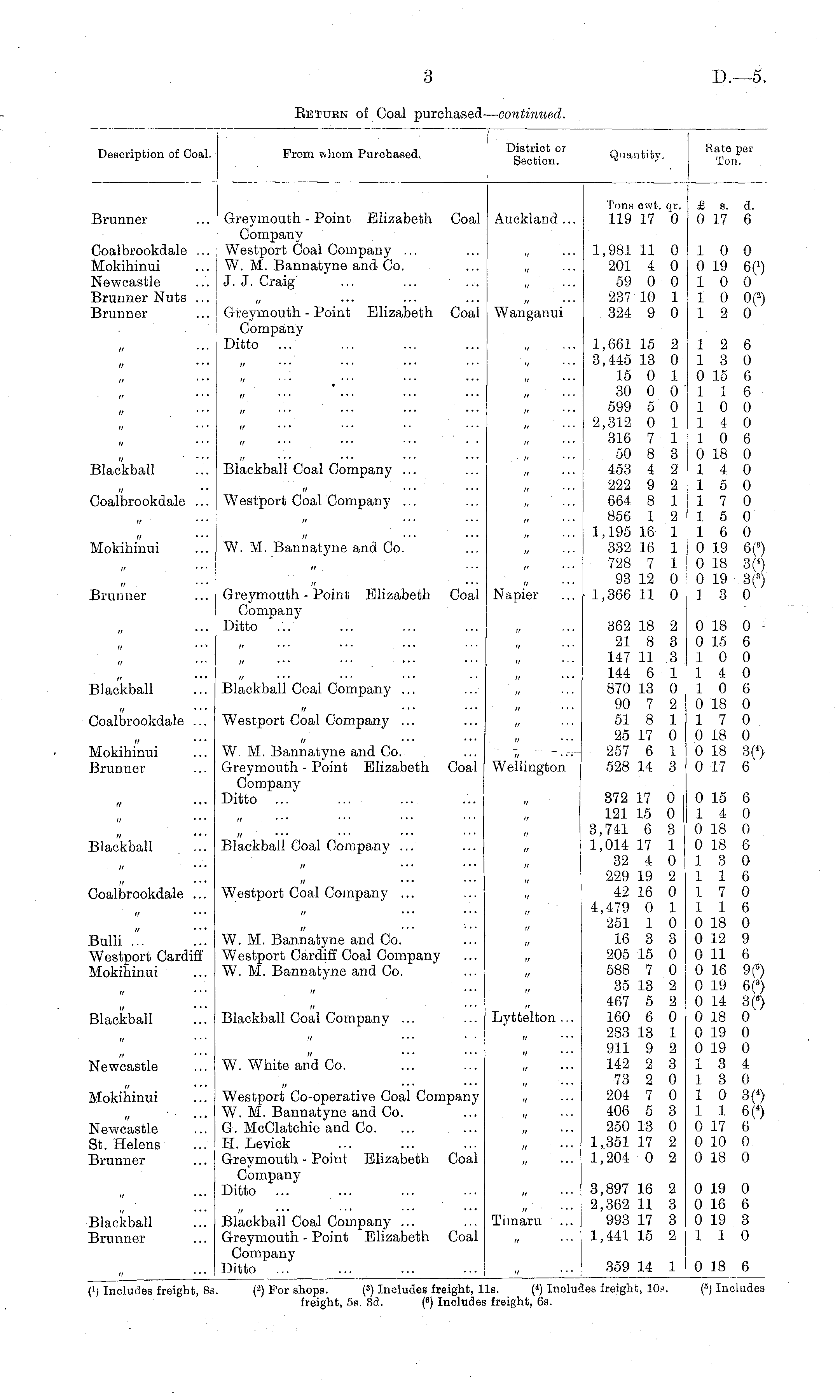 Description of Coal. From whom Purchased. )istnct or Section. Quantity. iate per Ton. Brunner Greymouth - Point Elizabeth Coal Company Westport Coal Company ... W. M. Bannatyne and-Co. J. J. Craig Auckland ... Tons owt. qr. 119 17 0 £ s. 0 17 d. 6 Coalbrookdale ... Mokihinui Newcastle Brunner Nuts ... Brunner 1,981 11 0 201 4 0 59 0 0 237 10 1 324 9 0 1 0 0 19 1 0 1 0 1 2 0 60 0 oo 0 Greymouth - Point Elizabeth Coal Company Ditto ..." Wanganui it if it tt Blackball Blackball Coal Company ... tt a 1,661 15 2 3,445 13 0 15 0 1 30 0 0 599 5 0 2,312 0 1 316 7 1 50 8 3 453 4 2 222 9 2 664 8 1 856 1 2 1,195 16 1 332 16 1 728 7 1 93 12 0 1,366 11 0 1 2 1 3 0 15 1 1 1 0 1 4 1 0 0 18 1 4 1 5 1 7 1 5 1 6 0 19 0 18 0 19 1 3 6 0 6 6 0 0 6 0 0 0 0 0 0 6( 3 ) 3( 4 ) 3( 3 ) 0 Coalbrookdale ... a ■ ■ ■ Westport Coal Company ... a ... Mokihinui W. M. Bannatyne and Co. a tt • • • Brunner Greymouth - Point Elizabeth Coal Company Ditto ... Napier „ Blackball Blackball Coal Company ... a ... a ... 362 18 2 21 8 3 147 11 3 144 6 1 870 13 0 90 7 2 51 8 1 25 17 0 257 6 1 528 14 3 0 18 0 15 1 0 1 4 1 0 0 18 1 7 0 18 0 18 0 17 0 6 0 0 6 0 0 0 3( 4 ) 6 if Coalbrookdale ... // • • • Westport Coal Company ... a ••• Mokihinui Brunner W. M. Bannatyne and Co. Greymouth - Point Elizabeth Coal Company Ditto ... tt Wellington „ ... Blackball . ... It Coalbrookdale ... , f ... Bulli Westport Cardiff Mokihinui Blackball Coal Company ... ,, ... ... Westport Coal Company ... a • • • W. M. Bannatyne and Co. Westport Cardiff Coal Company W. M. Bannatyne and Co. a a a a a 372 17 0 121 15 0 3,741 6 3 1,014 17 1 32 4 0 229 19 2 42 16 0 4,479 0 1 251 1 0 16 3 3 205 15 0 588 7 0 35 13 2 467 5 2 160 6 0 283 13 1 911 9 2 142 2 3 73 2 0 204 7 0 406 5 3 250 13 0 1,351 17 2 1,204 0 2 0 15 1 4 0 18 0 18 1 3 1 1 1 7 1 1 0 18 0 12 0 11 0 16 0 19 0 14 0 18 0 19 0 19 1 3 1 3 1 0 1 1 0 17 0 10 0 18 6 0 0 6 0 6 0 6 0 9 6 9( 5 ) 6( 3 ) 30 0 0 0 4 0 3( 4 ) 60 6 0 0 „ I! a Blackball II Blackball Coal Company ... Lyttelton ... // • • • Newcastle W. White and Co. ,, ... Mokihinui Newcastle St. Helens n •' • '' • Westport Co-operative Coal Company W. M. Bannatyne and Co. G. McClatchie and Co. H. Levick Greymouth - Point Elizabeth Coal Company Ditto ... a a it tt ... Brunner Blackball Blackball Coal Company ... Greymouth - Point Elizabeth Coal Company Ditto ... Timaru 3,897 16 2 2,362 11 3 993 17 3 1,441 15 2 0 19 0 16 0 19 1 1 0 6 3 0 Brunner „ ... 359 14 1 0 18 6 I 1 ) Includes freight, 8s. ( 2 ) For shops. ( 3 ) Includes freight, 1 freight, 5s. 3d. ( 6 ) Include: Is. ( 4 ) Includes freight, 10>». s freight, 6s. ( s ) Includes