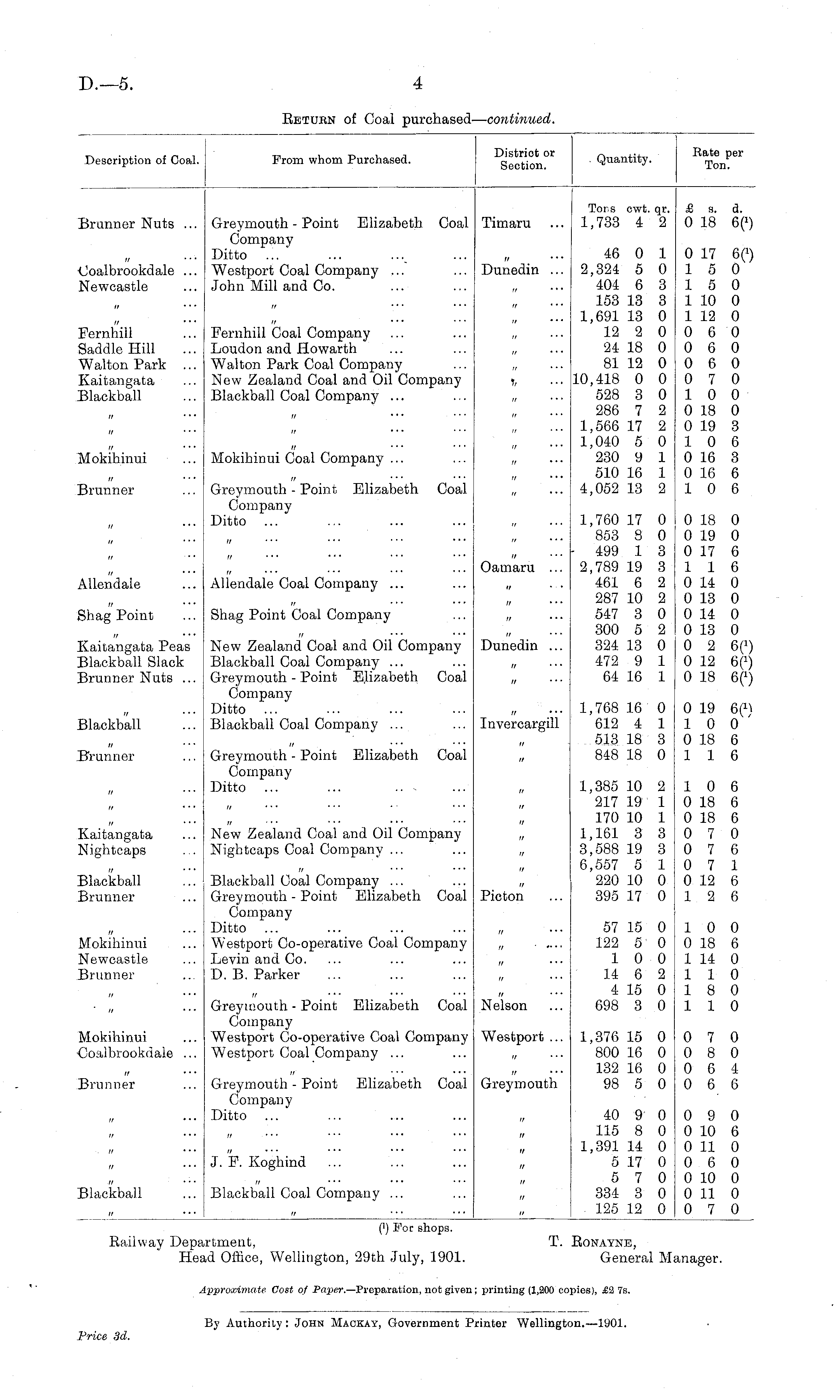 Description of Coal. Prom whom Purchased. District or Section. . Quantity. Kate per Ton. Brunner Nuts ... Greymouth - Point Elizabeth Coal Company Ditto ... Westport Coal Company ... John Mill and Co. Timaru Tors cwfc. qr. 1,733 4 2 £ s. d. 0 18 6( x ) Coalbrookdale ... Newcastle Fernhill Saddle Hill Walton Park ... Kaitangata Blackball Fernhill Coal Company Loudon and Howarth ... Walton Park Coal Company New Zealand Coal and Oil Company Blackball Coal Company ... it Dunedin ... 46 0 1 2,324 5 0 404 6 3 153 13 3 1,691 13 0 12 2 0 24 18 0 81 12 0 10,418 0 0 528 3 0 286 7 2 1,566 17 2 1,040 5 0 230 9 1 510 16 1 4,052 13 2 0 17 6( J ) 15 0 15 0 1 10 0 1 12 0 0 6 0 0 6 0 0 6 0 0 7 0 10 0 0 18 0 0 19 3 10 6 0 16 3 0 16 6 10 6 it it it it Mokihinui Mokihinui Coal Company ... if ... Brunner tr • • • Greymouth - Point Elizabeth Coal Company Ditto ... „ ... AUendale it Shag Point AUendale Coal Company ... Shag Point Coal Company Oamaru ... // ' * it 1,760 17 0 853 8 0 - 499 1 3 2,789 19 3 461 6 2 287 10 2 547 3 0 300 5 2 324 13 0 472 9 1 64 16 1 0 18 0 0 19 0 0 17 6 116 0 14 0 0 13 0 0 14 0 0 13 0 0 2 60 0 12 6( J ) 0 18 e^ 1 ) it ''' Kaitangafca Peas Blackball Slack Brunner Nuts ... New Zealand Coal and Oil Company Blackball Coal Company ... Greymouth - Point Elizabeth Coal Company Ditto ... Blackball Coal Company ... Dunedin ... lr ... Blackball Invercargill 1,768 16 0 612 4 1 513 18 3 848 18 0 0 19 6(*) 1 0 0 ' 0 18 6 1 1 6 » Brunner Greymouth - Point Elizabeth Coal Company Ditto ... ... it it Kaitangata Nightcaps New Zealand Coal and Oil Company Nightcaps Coal Company ... tt a 1,385 10 2 217 19 1 170 10 1 1,161 3 3 3,588 19 3 6,557 5 1 220 10 0 395 17 0 10 6 0 18 6 0 18 6 0 7 0 0 7 6 0 7 1 0 12 6 12 6 Blackball Brunner it Mokihinui Newcastle Brunner // • ■ ■ Blackball Coal Company ... Greymouth - Point Elizabeth Coal Company Ditto ... Westport Co-operative Coal Company Levin and Co. D. B. Parker Picton 57 15 0 122 5 0 10 0 14 6 2 4 15 0 698 3 0 10 0 0 18 6 1 14 0 110 18 0 110 Mokihinui Coalbrookdale ... Greymouth - Point Elizabeth Coal Company Westport Co-operative Coal Company Westport Coal Company ... Nelson Westport ... 1,376 15 0 800 16 0 132 16 0 98 5 0 0 7 0 0 8 0 0 6 4 0 6 6 it a Greymouth - Point Elizabeth Coal Company Ditto ... Greymouth Brunner it ''' J. P. Koghind ... a it a 40 9 0 115 8 0 1,391 14 0 5 17 0 5 7 0 334 3 0 125 12 0 0 9 0 0 10 6 0 11 0 0 6 0 0 10 0 0 11 0 0 7 0 a Blackball Blackball Coal Company ... a