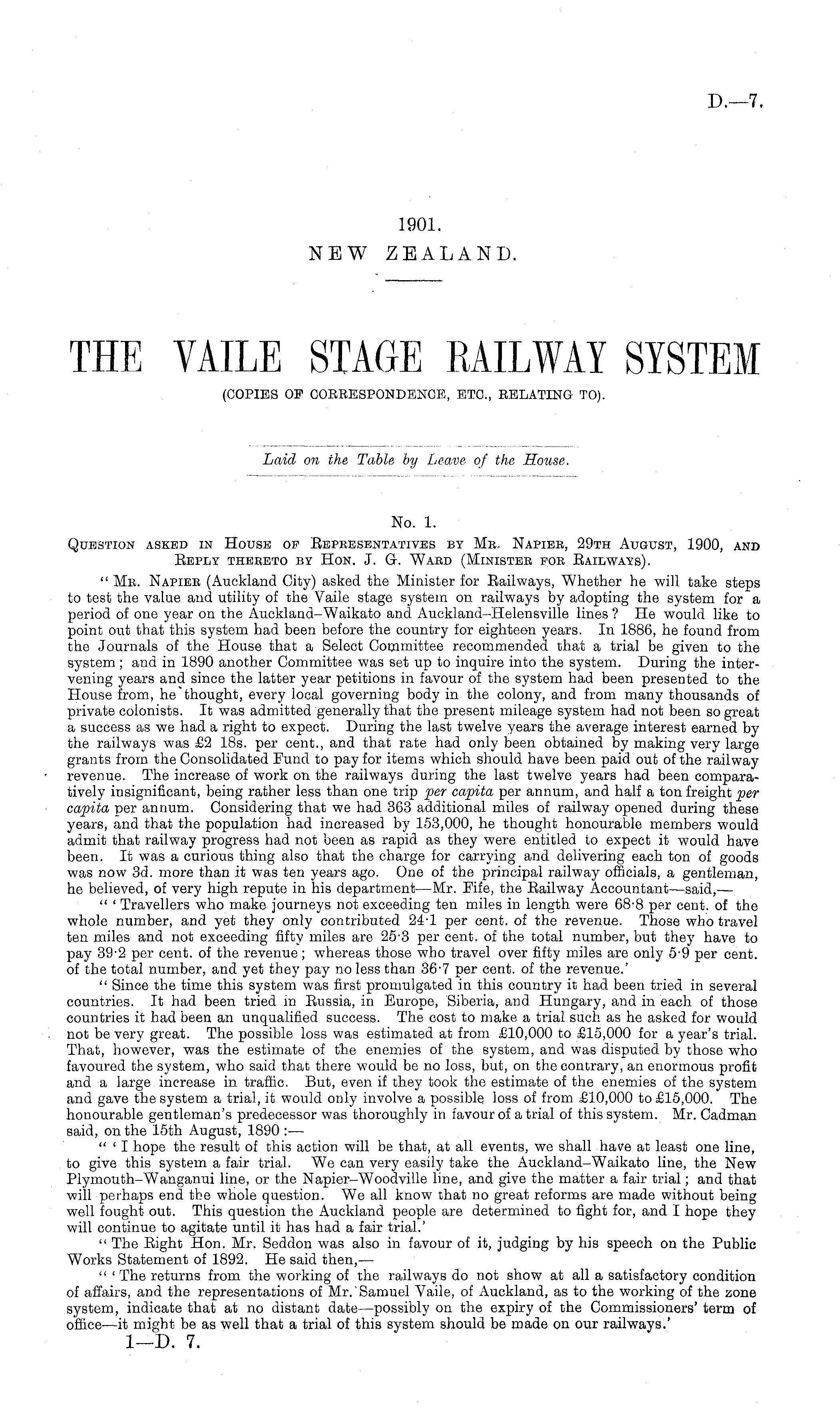 No. 1. Question asked in House op Bepresentatives by Mr. Napiee, 29th August, 1900, and Beply thereto by Hon. J. G. Ward (Minister for Eailways). " Mr. Napier (Auckland City) asked the Minister for Eailways, Whether he will take steps to test the value and utility of the Vaile stage system on railways by adopting the system for a period of one year on the Auckland-Waikato and Auokland-Helensville lines ? He would like to point out that this system had been before the country for eighteen years. In 1886, he found from the Journals of the House that a Select Committee recommended that a trial be given to the system; and in 1890 another Committee was set up to inquire into the system. During the intervening years and since the latter year petitions in favour of the system had been presented to the House from, he "thought, every local governing body in the colony, and from many thousands of private colonists. It was admitted generally that the present mileage system had not been so great a success as we had a right to expect. During the last twelve years the average interest earned by the railways was £2 18s. per cent., and that rate had only been obtained by making very large grants from the Consolidated Fund to pay for items which should have been paid out of the railway revenue. The increase of work on the railways during the last twelve years had been comparatively insignificant, being rather less than one trip per capita per annum, and half a ton freight per capita per annum. Considering that we had 363 additional miles of railway opened during these years, and that the population had increased by 153,000, he thought honourable members would admit that railway progress had not been as rapid as they were entitled to expect it would have been. It was a curious thing also that the charge for carrying and delivering each ton of goods was now 3d. more than it was ten years ago. One of the principal railway officials, a gentleman, he believed, of very high repute in his department—Mr. Fife, the Eailway Accountant—said, — " ' Travellers who make journeys not exceeding ten miles in length were 68-8 per cent, of the whole number, and yet they only contributed 24-1 per cent, of the revenue. Those who travel ten miles and not exceeding fifty miles are 253 per cent, of the total number, but they have to pay 39-2 per cent, of the revenue; whereas those who travel over fifty miles are only 5-9 per cent, of the total number, and yet they pay no less than 367 per cent, of the revenue.' " Since the time this system was first promulgated in this country it had been tried in several countries. It had been tried in Eussia, in Europe, Siberia, and Hungary, and in each of those countries it had been an unqualified success. The cost to make a trial such as he asked for would not be very great. The possible loss was estimated at from £10,000 to £15,000 for a year's trial. That, however, was the estimate of the enemies of the system, and was disputed by those who favoured the system, who said that there would be no loss, but, on the contrary, an enormous profit and a large increase in traffic. But, even if they took the estimate of the enemies of the system and gave the system a trial, it would only involve a possible loss of from £10,000 to £15,000. The honourable gentleman's predecessor was thoroughly in favour of a trial of this system. Mr. Cadman said, on the 15th August, 1890 : — " ' I hope the result of this action will be that, at all events, we shall have at least one line, to give this system a fair trial. We can very easily take the Auckland-Waikato line, the New Plymouth-Wanganui line, or the Napier-Woodville line, and give the matter a fair trial; and that will perhaps end the whole question. We all know that no great reforms are made without being well fought out. This question the Auckland people are determined to fight for, and I hope they will continue to agitate until it has had a fair trial.' " The Eight Hon. Mr. Seddon was also in favour of it, judging by his speech on the Public Works Statement of 1892. He said then, — " 'The returns from the working of the railways do not show at all a satisfactory condition of affairs, and the representations of Mr."Samuel Vaile, of Auckland, as to the working of the zone system, indicate that at no distant date —possibly on the expiry of the Commissioners' term of office —it might be as well that a trial of this system should be made on our railways.'