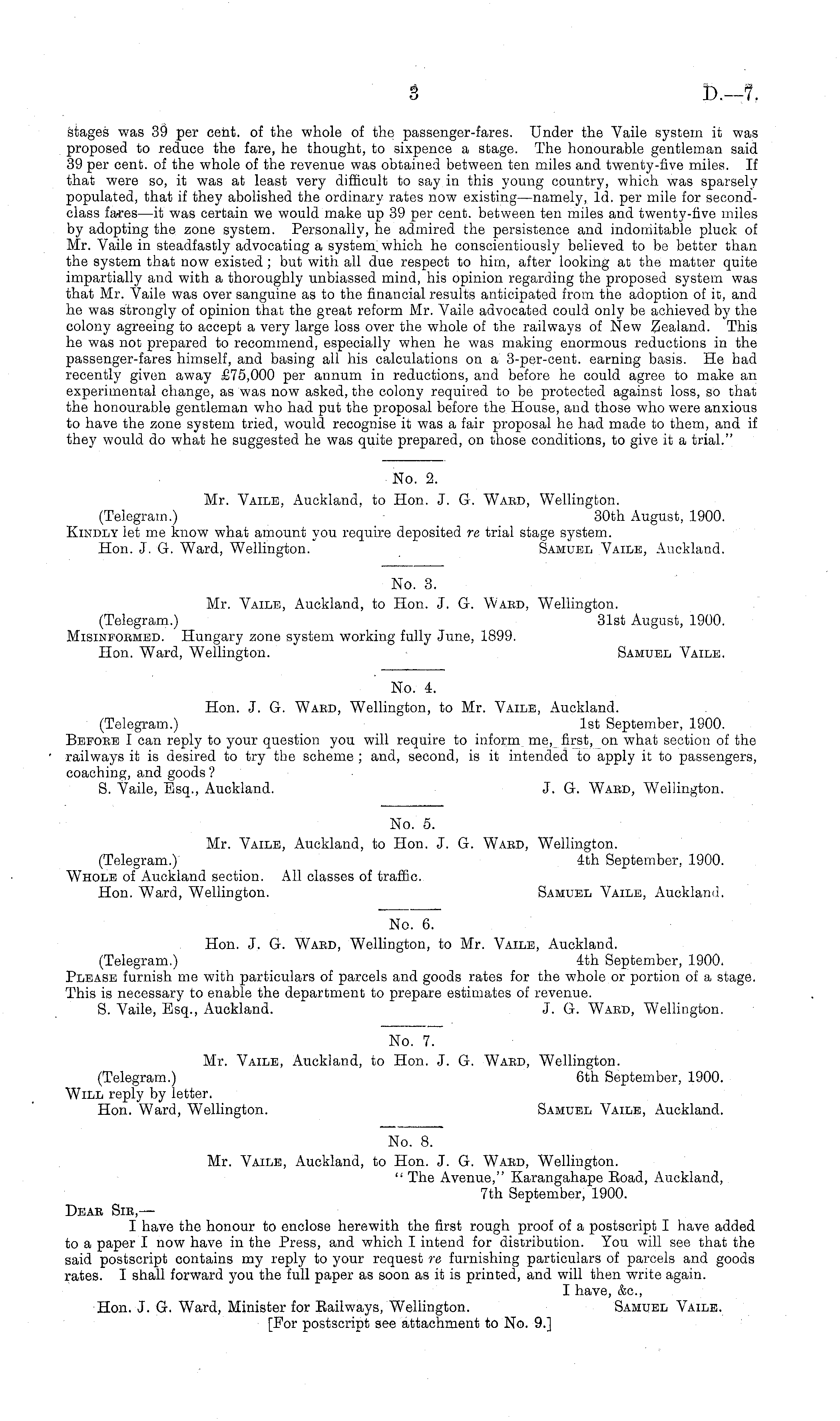 No. 8. Mr. Vaile, Auckland, to Hon. J. G. Ward, Wellington. " The Avenue," Karangahape Eoad, Auckland, 7th September, 1900. Dear Sir,— I have the honour to enclose herewith the first rough proof of a postscript I have added to a paper I now have in the Press, and which I intend for distribution. You will see that the said postscript contains my reply to your request re furnishing particulars of parcels and goods rates. I shall forward you the full paper as soon as it is printed, and will then write again. I have, &c, Hon. J. G. Ward, Minister for Eailways, Wellington. Samuel Vaile. [For postscript see attachment to No. 9.]