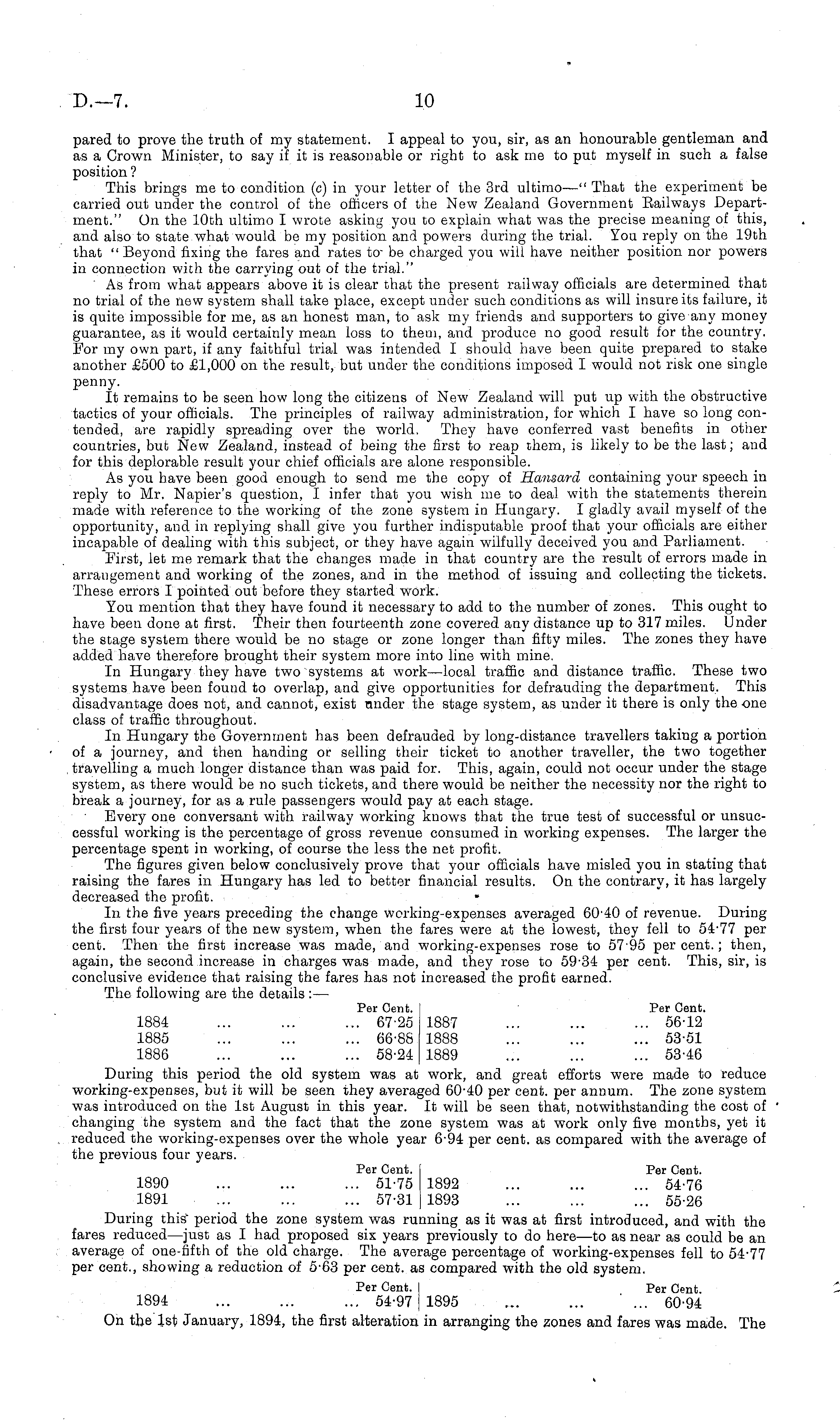pared to prove the truth of my statement. I appeal to you, sir, as an honourable gentleman and as a Crown Minister, to say if it is reasonable or right to ask me to put myself in such a false position ? This brings me to condition (c) in your letter of the 3rd ultimo —" That the experiment be carried out under the control of the officers of the New Zealand Government Eailways Department." On the 10th ultimo I wrote asking you to explain what was the precise meaning of this, and also to state what would be my position and powers during the trial. You reply on the 19th that " Beyond fixing the fares and rates to- be charged you will have neither position nor powers in connection with the carrying out of the trial." As from what appears above it is clear that the present railway officials are determined that no trial of the new system shall take place, except under such conditions as will insure its failure, it is quite impossible for me, as an honest man, to ask my friends and supporters to give any money guarantee, as it would certainly mean loss to them, and produce no good result for the country. For my own part, if any faithful trial was intended I should have been quite prepared to stake another £500 to £1,000 on the result, but under the conditions imposed I would not risk one single penny. It remains to be seen how long the citizens of New Zealand will put up with the obstructive tactics of your officials. The principles of railway administration, for which I have so long contended, are rapidly spreading over the world. They have conferred vast benefits in other countries, but New Zealand, instead of being the first to reap them, is likely to be the last; and for this deplorable result your chief officials are alone responsible. As you have been good enough to send me the copy of Hansard containing your speech in reply to Mr. Napier's question, I infer that you wish me to deal with the statements therein made with reference to the working of the zone system in Hungary. I gladly avail myself of the opportunity, and in replying shall give you further indisputable proof that your officials are either incapable of dealing with this subject, or they have again wilfully deceived you and Parliament. First, let me remark that the changes made in that country are the result of errors made in arrangement and working of the zones, and in the method of issuing and collecting the tickets. These errors I pointed out before they started work. You mention that they have found it necessary to add to the number of zones. This ought to have been done at first. Their then fourteenth zone covered any distance up to 317 miles. Under the stage system there would be no stage or zone longer than fifty miles. The zones they have added have therefore brought their system more into line with mine. In Hungary they have two systems at work —local traffic and distance traffic. These two systems have been found to overlap, and give opportunities for defrauding the department. This disadvantage does not, and cannot, exist under the stage system, as under it there is only the one class of traffic throughout. In Hungary the Government has been defrauded by long-distance travellers taking a portion of a journey, and then handing or selling their ticket to another traveller, the two together travelling a much longer distance than was paid for. This, again, could not occur under the stage system, as there would be no such tickets, and there would be neither the necessity nor the right to break a journey, for as a rule passengers would pay at each stage. Every one conversant with railway working knows that the true test of successful or unsuccessful working is the percentage of gross revenue consumed in working expenses. The larger the percentage spent in working, of course the less the net profit. The figures given below conclusively prove that your officials have misled you in stating that raising the fares in Hungary has led to better financial results. On the contrary, it has largely decreased the profit. • In the five years preceding the change working-expenses averaged 60-40 of revenue. During the first four years of the new system, when the fares were at the lowest, they fell to 54-77 per cent. Then the first increase was made, and working-expenses rose to 5795 percent.; then, again, the second increase in charges was made, and they rose to 59-34 per cent. This, sir, is conclusive evidence that raising the fares has not increased the profit earned. The following are the details : — Per Cent. Per Cent. 1884 ... ... ... 67-25 1887 ... ... ... 56-12 1885 ... ... ... 66-88 1888 ... ... ... 53-51 1886 ... ... ... 58-24 1889 ... ... ... 53-46 During this period the old system was at work, and great efforts were made to reduce working-expenses, but it will be seen they averaged 60-40 per cent, per annum. The zone system was introduced on the Ist August in this year. It will be seen that, notwithstanding the cost of changing the system and the fact that the zone system was at work only five months, yet it reduced the working-expenses over the whole year 6-94 per cent, as compared with the average of the previous four years. Per Gent. Per Cent. 1890 ... ... ... 51-75 1892 ... ... ... 54-76 1891 57-31 1893 55-26 During this" period the zone system was running as it was at first introduced, and with the fares reduced—just as I had proposed six years previously to do here—to as near as could be an average of one-fifth of the old charge. The average percentage of working-expenses fell to 54-77 per cent., showing a reduction of 5-63 per cent, as compared with the old system. Per Cent, j Per Cent. 1894 ... ... ... 54-97 I 1895 ... ... ' ... 60-94 On the Ist January, 1894, the first alteration in arranging the zones and fares was made. The