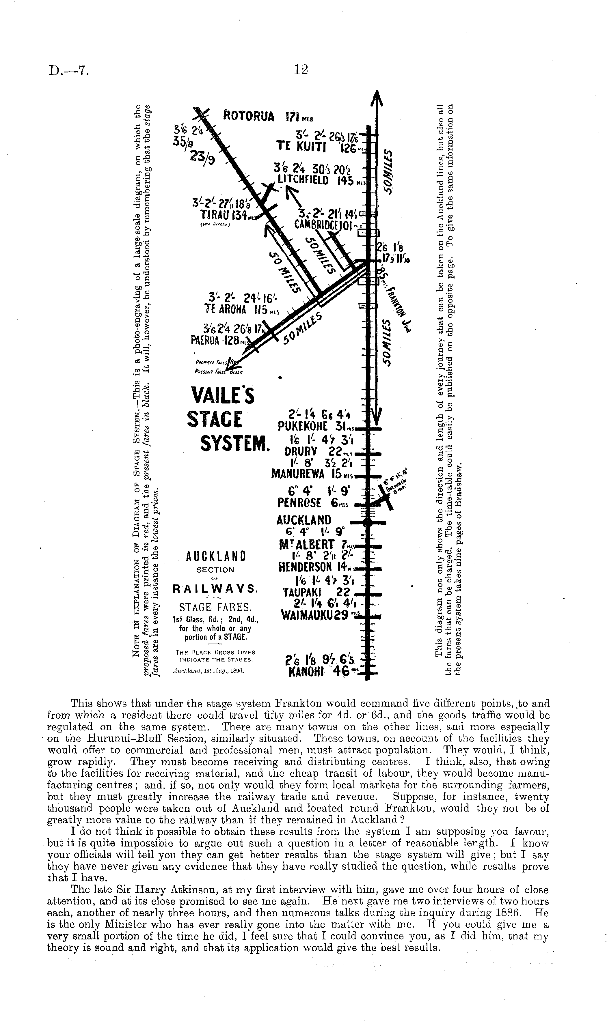 This shows that under the stage system Frankton would command five different points, .to and from which a resident there could travel fifty miles for 4d. or 6d., and the goods traffic would be regulated on the same system. There are many towns on the other lines, and more especially on the Hurunui-Bluff Section, similarly situated. These towns, on account of the facilities they would offer to commercial and professional men, must attract population. They would, I think, grow rapidly. They must become receiving and distributing centres. I think, also, that owing to the facilities for receiving material, and the cheap transit of labour, they would become manufacturing centres; and, if so, not only would they form local markets for the surrounding farmers, but they must greatly increase the railway trade and revenue. Suppose, for instance, twenty thousand people were taken out of Auckland and located round Frankton, would they not be of greatly more value to the railway than if they remained in Auckland ? I do not think it possible to obtain these results from the system I am supposing you favour, but it is quite impossible to argue out such a question in a letter of reasonable length. I know your officials will tell you they can get better results than the stage system will give; but I say they have never given any evidence that they have really studied the question, while results prove that I have. The late Sir Harry Atkinson, at my first interview with him, gave me over four hours of close attention, and at its close promised to see me again. He next gave me two interviews of two hours each, another of nearly three hours, and then numerous talks during the inquiry during 1886. He is the only Minister who has ever really gone into the matter with me. If you could give me a very small portion of the time he did, I feel sure that I could convince you, as I did him, that my theory is sound and right, and that its application would give the best results.