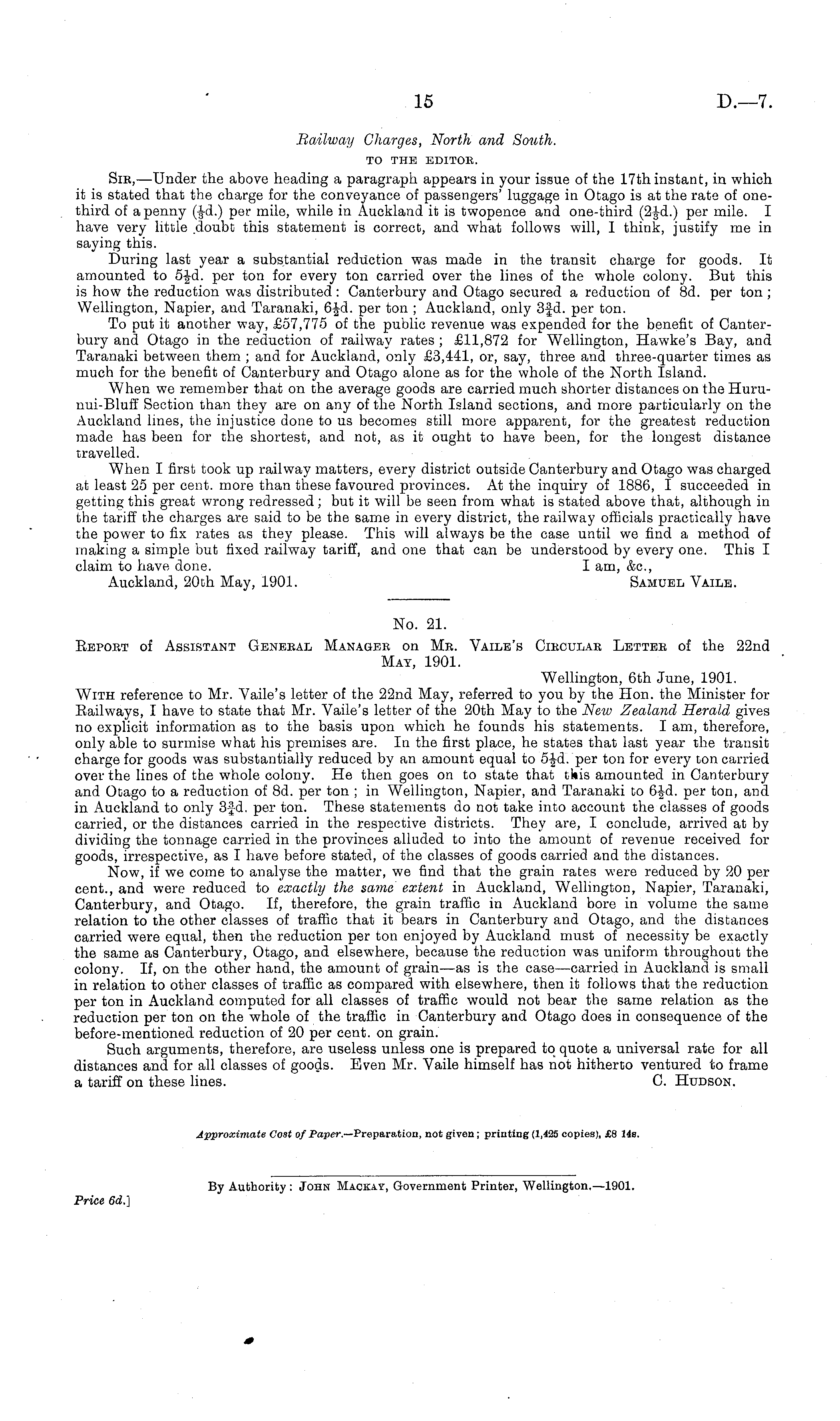 No. 21. Report of Assistant General Manager on Mr. Vaile's Circular Letter of the 22nd May, 1901. Wellington, 6th June, 1901. With reference to Mr. Vaile's letter of the 22nd May, referred to you by the Hon. the Minister for Railways, I have to state that Mr. Vaile's letter of the 20th May to the Neiv Zealand Herald gives no explicit information as to the basis upon which he founds his statements. I am, therefore, only able to surmise what his premises are. In the first place, he states that last year the transit charge for goods was substantially reduced by an amount equal to 5-|d. per ton for every ton carried over the lines of the whole colony. He then goes on to state that tkis amounted in Canterbury and Otago to a reduction of Bd. per ton ; in Wellington, Napier, and Taranaki to 6sd. per ton, and in Auckland to only 3|-d. per ton. These statements do not take into account the classes of goods carried, or the distances carried in the respective districts. They are, I conclude, arrived at by dividing the tonnage carried in the provinces alluded to into the amount of revenue received for goods, irrespective, as I have before stated, of the classes of goods carried and the distances. Now, if we come to analyse the matter, we find that the grain rates were reduced by 20 per cent., and were reduced to exactly the same extent in Auckland, Wellington, Napier, Taranaki, Canterbury, and Otago. If, therefore, the grain traffic in Auckland bore in volume the same relation to the other classes of traffic that it bears in Canterbury and Otago, and the distances carried were equal, then the reduction per ton enjoyed by Auckland must of necessity be exactly the same as Canterbury, Otago, and elsewhere, because the reduction was uniform throughout the colony. If, on the other hand, the amount of grain—as is the case—carried in Auckland is small in relation to other classes of traffic as compared with elsewhere, then it follows that the reduction per ton in Auckland computed for all classes of traffic would not bear the same relation as the reduction per ton on the whole of the traffic in Canterbury and Otago does in consequence of the before-mentioned reduction of 20 per cent, on grain. Such arguments, therefore, are useless unless one is prepared to quote a universal rate for all distances and for all classes of goods. Even Mr. Vaile himself has not hitherto ventured to frame a tariff on these lines. C. Hudson. Approximate Cost of Paper. —Preparation, not given; printing (1,425 copies), £8 14b.