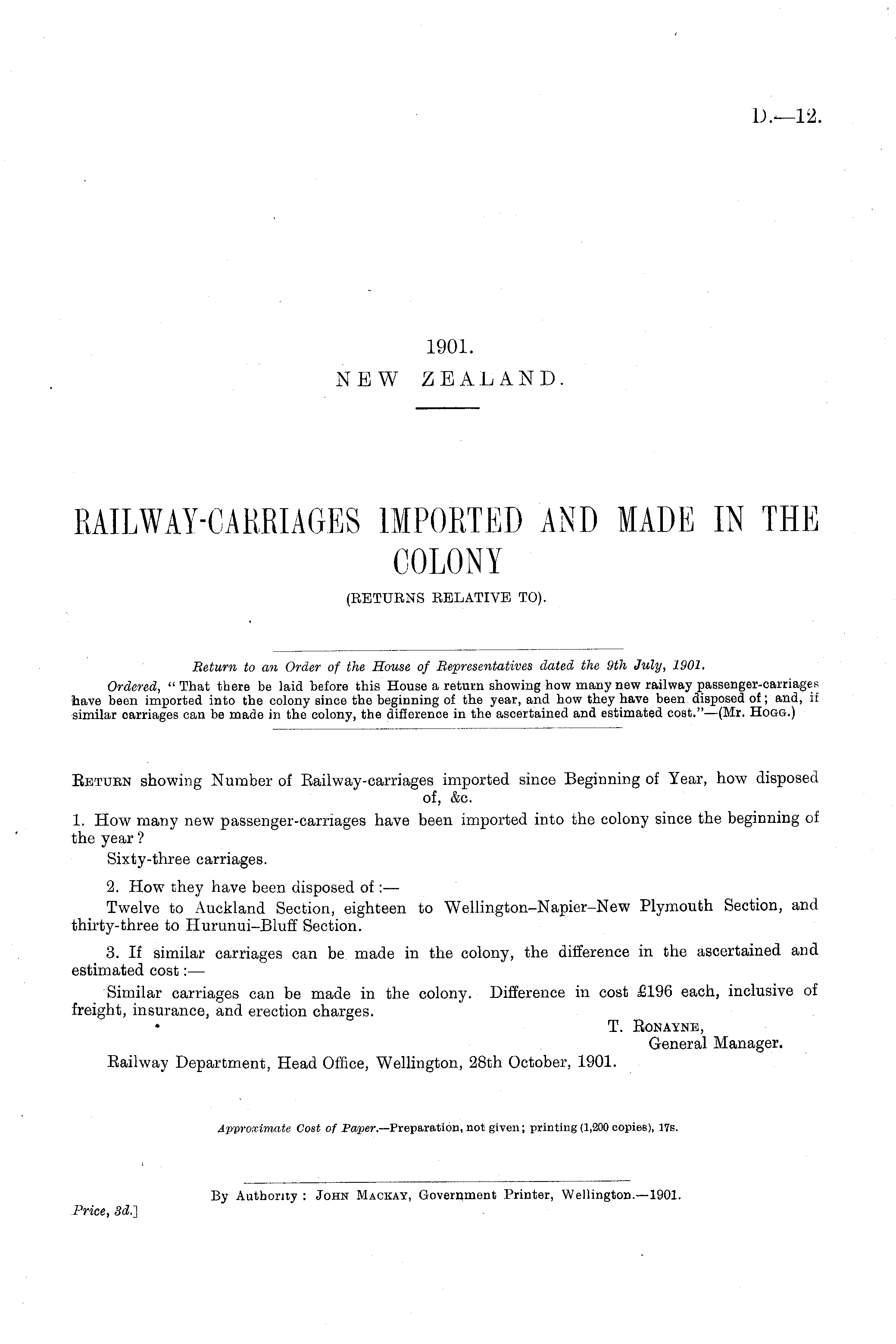 Beturn showing Number of Bailway-carriages imported since Beginning of Year, how disposed of, &c. 1. How many new passenger-carriages have been imported into the colony since the beginning of the year ? Sixty-three carriages. 2. How they have been disposed of: — Twelve to Auckland Section, eighteen to Wellington-Napier-New Plymouth Section, and thirty-three to Hurunui-Bluff Section. 3. If similar carriages can be made in the colony, the difference in the ascertained and estimated cost:— Similar carriages can be made in the colony. Difference in cost £196 each, inclusive of freight, insurance, and erection charges. T. Bonayne, General Manager. Bailway Department, Head Office, Wellington, 28th October, 1901.