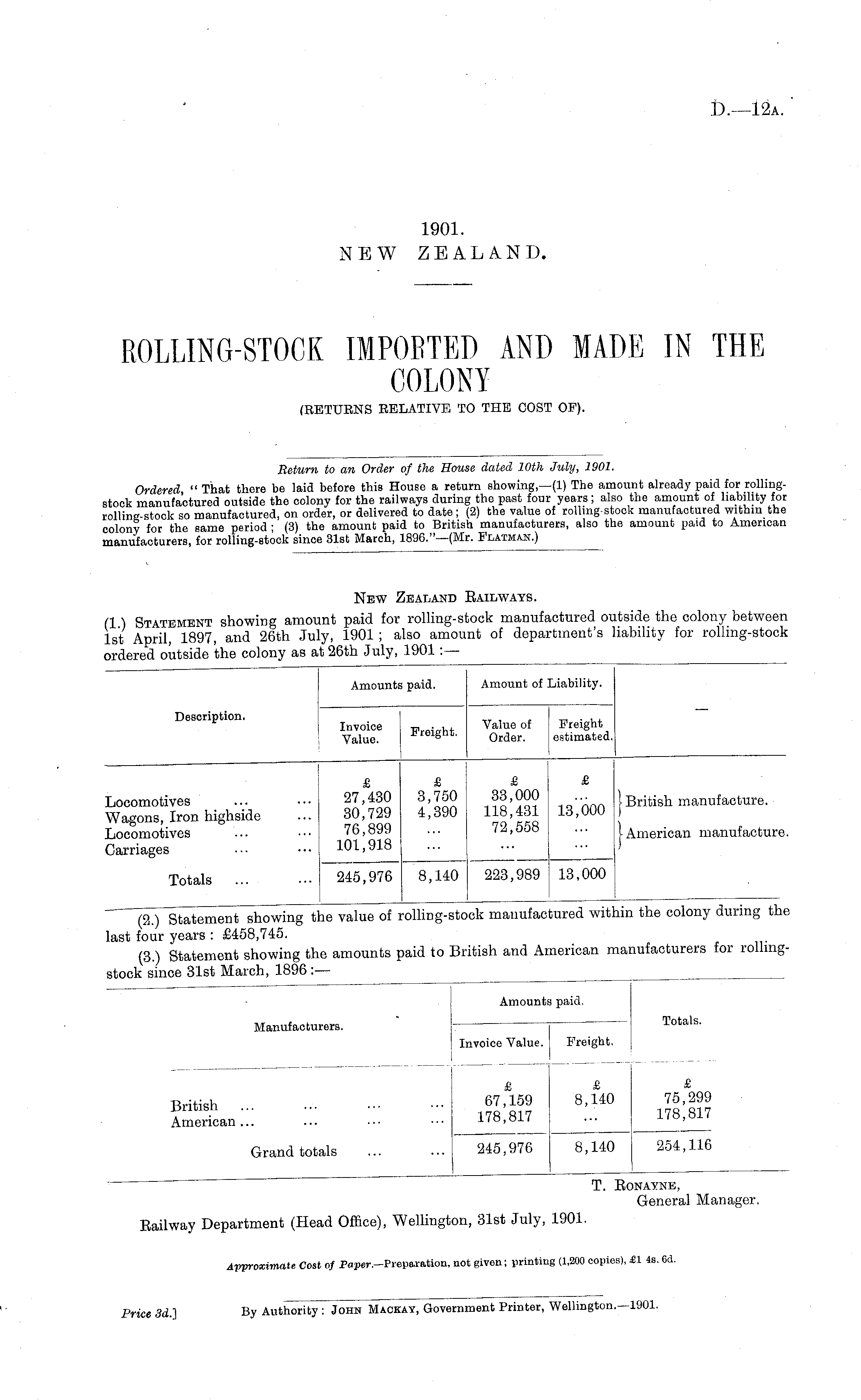Return to an Order of the House dated 10th July, 1901. Ordered " That there be laid before this House a return showing,—(l) The amount already paid for rollingstock manufactured outside the colony for the railways during the past four years; also the amount of liability for rolling-stock so manufactured, on order, or delivered to date ; (2) the value of rolling-stock manufactured within the colony for the came period ; (3) the amount paid to British manufacturers, also the amount paid to American manufacturers, for rolling-stock since 31st March, 1896."—(Mr. Flatman.)