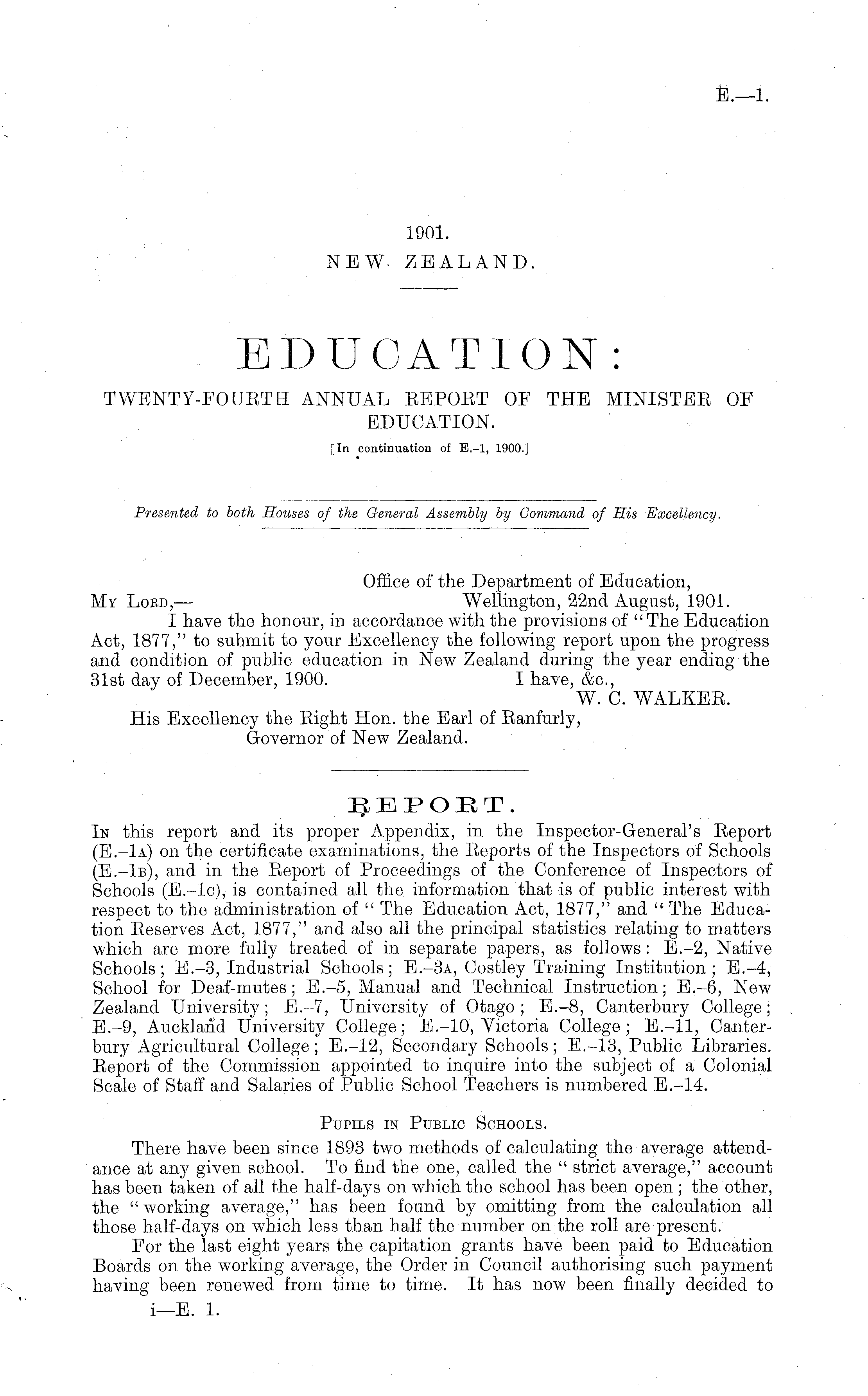 Office of the Department of Education, My Loed, — Wellington, 22nd August, 1901. I have the honour, in accordance with the provisions of "The Education Act, 1877," to submit to your Excellency the following report upon the progress and condition of public education in New Zealand during the year ending the 31st day of December, 1900. I have, &c, W. C. WALKER. His Excellency the Right Hon. the Earl of Ranfurly, Governor of New Zealand.
