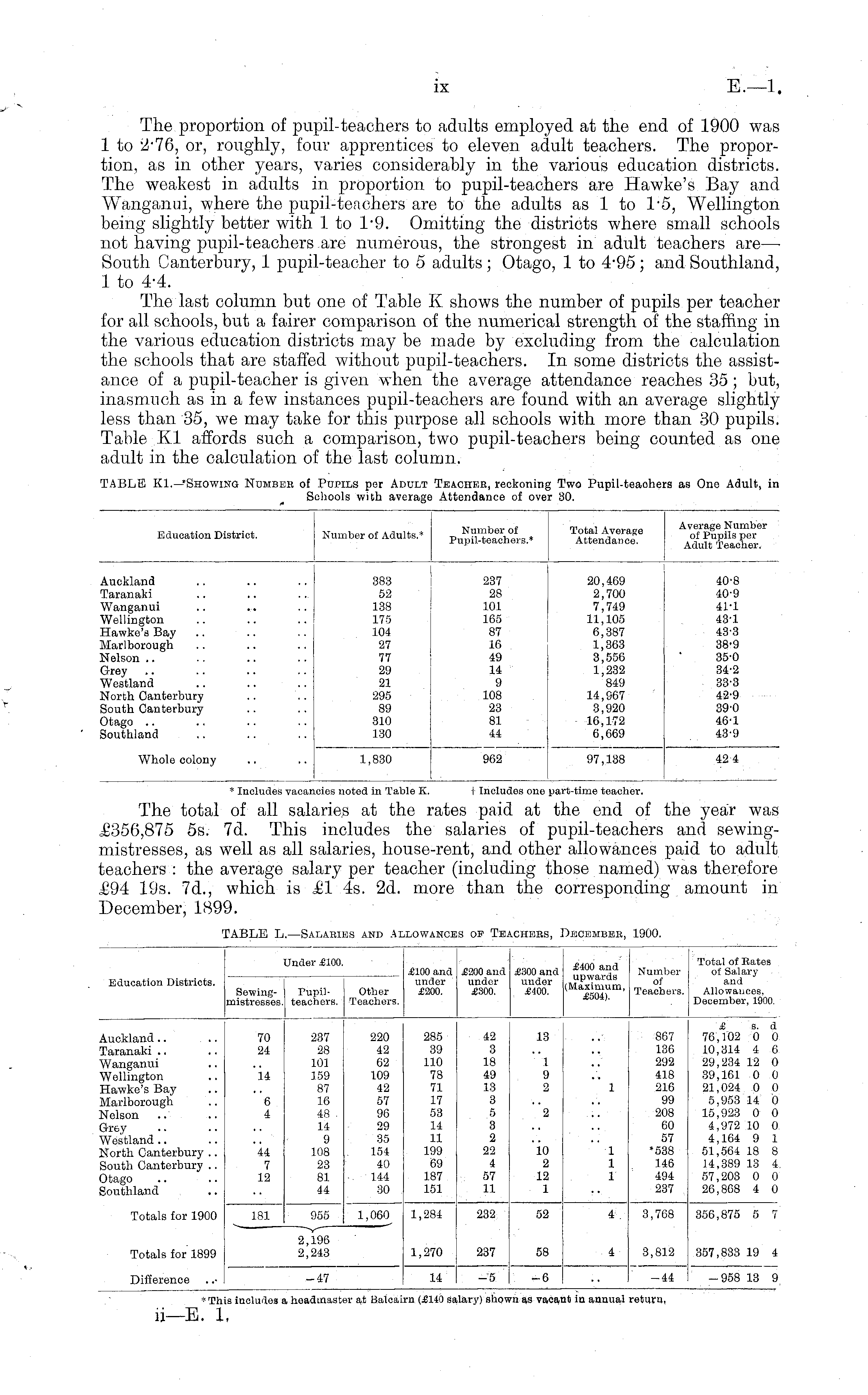 The total of all salaries at the rates paid at the end of the year was £356,875 ss. 7d. This includes the salaries of pupil-teachers and sewingmistresses, as well as all salaries, house-rent, and other allowances paid to adult teachers : the average salary per teacher (including those named) was therefore £94 19s. 7d., which is £1 4s. 2d. more than the corresponding amount in December, 1899.