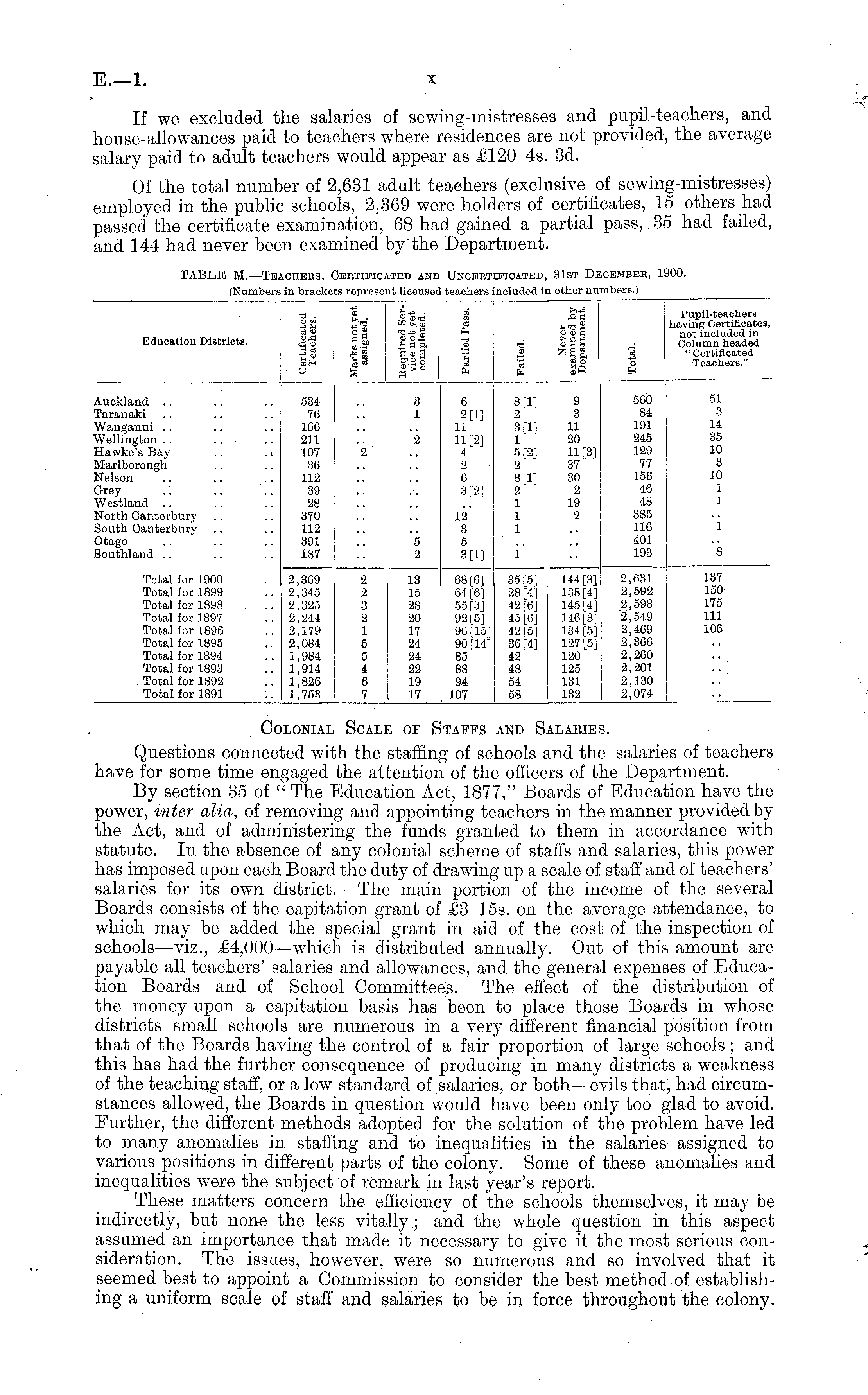If we excluded the salaries of sewing-mistresses and pupil-teachers, and house-allowances paid to teachers where residences are not provided, the average salary paid to adult teachers would appear as £120 4s. 3d. Of the total number of 2,631 adult teachers (exclusive of sewing-mistresses) employed in the public schools, 2,369 were holders of certificates, 15 others had passed the certificate examination, 68 had gained a partial pass, 35 had failed, and 144 had never been examined by'the Department.