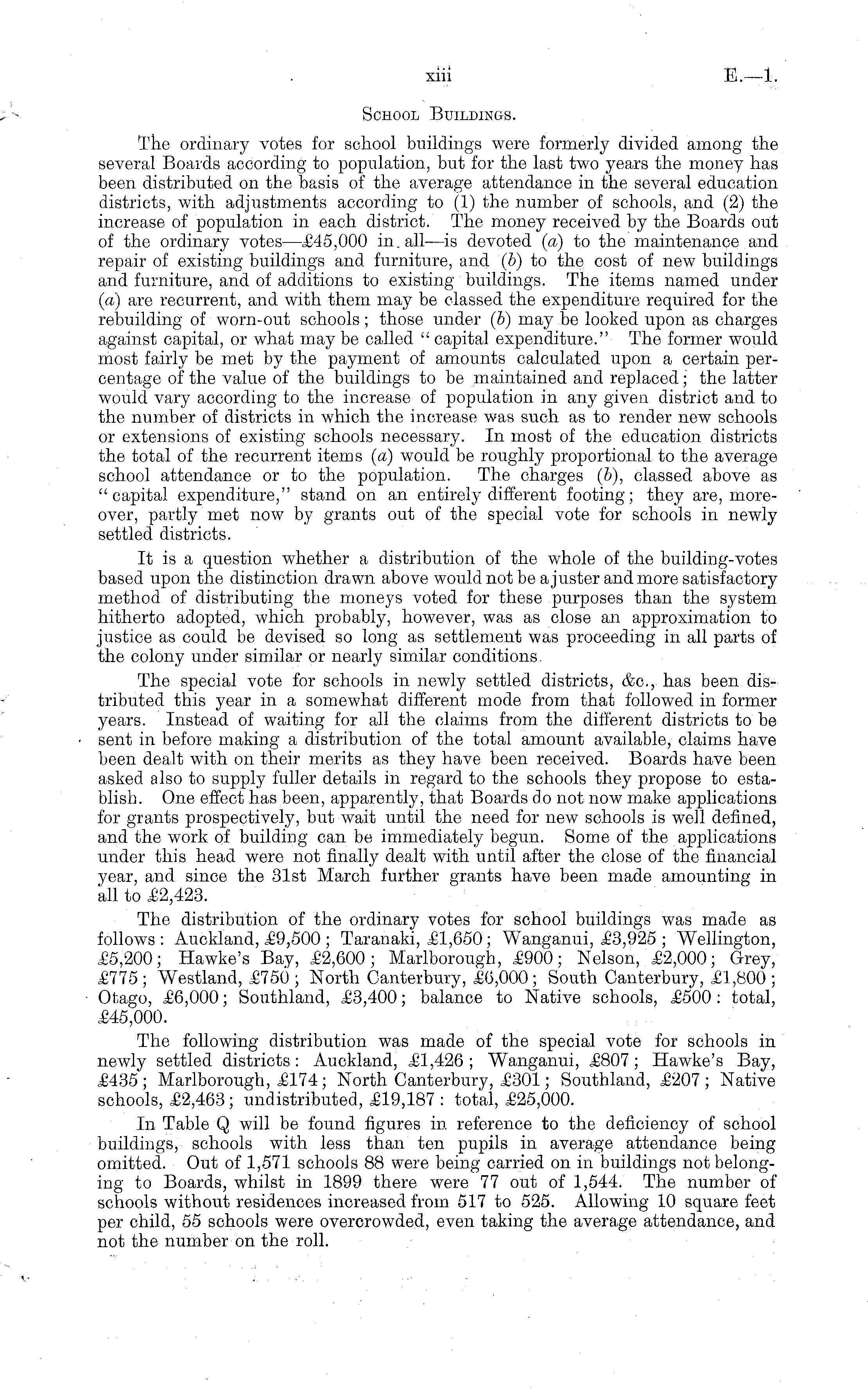School Buildings. The ordinary votes for school buildings were formerly divided among the several Boards according to population, but for the last two years the money has been distributed on the basis of the average attendance in the several education districts, with adjustments according to (1) the number of schools, and (2) the increase of population in each district. The money received by the Boards out of the ordinary votes —£45,000 in. all —is devoted (a) to the maintenance and repair of existing buildings and furniture, and (b) to the cost of new buildings and furniture, and of additions to existing buildings. The items named under (a) are recurrent, and with them may be classed the expenditure required for the rebuilding of worn-out schools; those under (b) may be looked upon as charges against capital, or what may be called " capital expenditure." The former would most fairly be met by the payment of amounts calculated upon a certain percentage of the value of the buildings to be maintained and replaced; the latter would vary according to the increase of population in any given district and to the number of districts in which the increase was such as to render new schools or extensions of existing schools necessary. In most of the education districts the total of the recurrent items (a) would be roughly proportional to the average school attendance or to the population. The charges (b), classed above as "capital expenditure," stand on an entirely different footing; they are, moreover, partly met now by grants out of the special vote for schools in newly settled districts. It is a question whether a distribution of the whole of the building-votes based upon the distinction drawn above would not be ajuster and more satisfactory method of distributing the moneys voted for these purposes than the system hitherto adopted, which probably, however, was as close an approximation to justice as could be devised so long as settlement was proceeding in all parts of the colony under similar or nearly similar conditions. The special vote for schools in newly settled districts, &c, has been distributed this year in a somewhat different mode from that followed in former years. Instead of waiting for all the claims from the different districts to be sent in before making a distribution of the total amount available, claims have been dealt with on their merits as they have been received. Boards have been asked also to supply fuller details in regard to the schools they propose to establish. One effect has been, apparently, that Boards do not now make applications for grants prospectively, but wait until the need for new schools is well defined, and the work of building can be immediately begun. Some of the applications under this head were not finally dealt with until after the close of the financial year, and since the 31st March further grants have been made amounting in all to £2,423. The distribution of the ordinary votes for school buildings was made as follows : Auckland, £9,500 ; Taranaki, £1,650; Wanganui, £3,925 ; Wellington, £5,200; Hawke's Bay, £2,600; Maryborough, £900; Nelson, £2,000; Grey, £775; Westland, £750 ; North Canterbury, £(3,000; South Canterbury, £1,800 ; Otago, £6,000; Southland, £3,400; balance to Native schools, £500 : total, £45,000. The following distribution was made of the special vote for schools in newly settled districts: Auckland, £1,426; Wanganui, £807; Hawke's Bay, £435 ; Marlborough, £174; North Canterbury, £301; Southland, £207 ; Native schools, £2,463 ; undistributed, £19,187 : total, £25,000. In Table Q will be found figures in reference to the deficiency of school buildings, schools with less than ten pupils in average attendance being omitted. Out of 1,571 schools 88 were being carried on in buildings not belonging to Boards, whilst in 1899 there were 77 out of 1,544. The number of schools without residences increased from 517 to 525. Allowing 10 square feet per child, 55 schools were overcrowded, even taking the average attendance, and not the number on the roll.