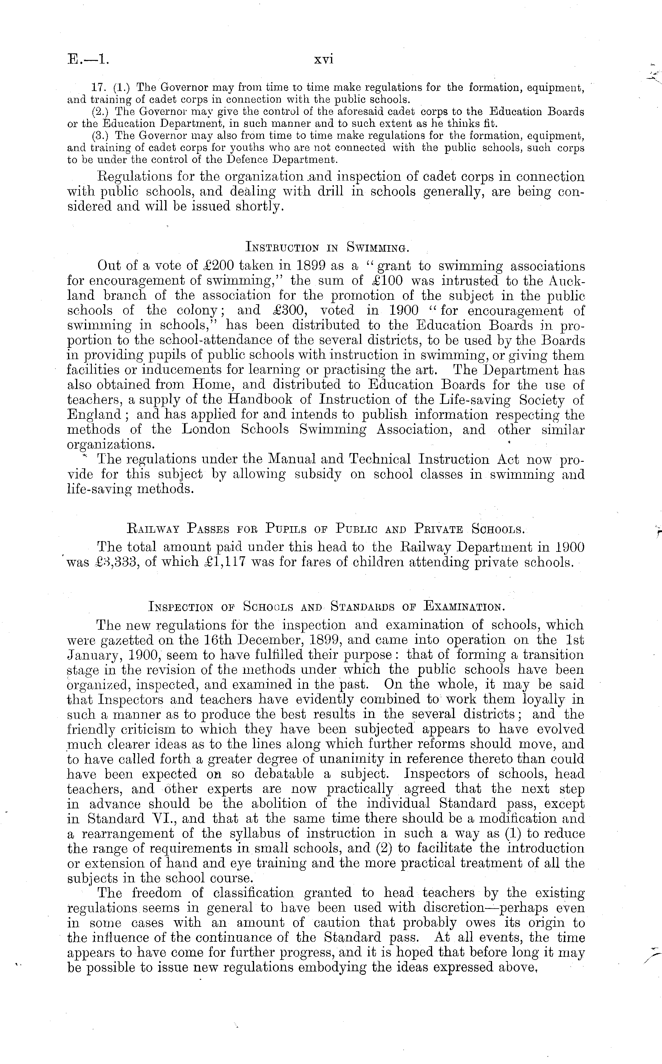 17. (1.) The Governor may from time to time make regulations for the formation, equipment, and training of cadet corps in connection with the public schools. (2.) The Governor may give the control of the aforesaid cadet corps to the Education Boards or the Education Department, in such manner and to such extent as he thinks fit. (3.) The Governor may also from time to time make regulations for the formation, equipment, and training of cadet corps for youths who are not connected with the public schools, such corps to be under the control of the Defence Department. Eegulations for the organization .and inspection of cadet corps in connection with public schools, and dealing with drill in schools generally, are being considered and will be issued shortly. Insteuction in Swimming. Out of a vote of ,£2OO taken in 1899 as a " grant to swimming associations for encouragement of swimming," the sum of £100 was intrusted to the Auckland branch of the association for the promotion of the subject in the public schools of the colony; and £300, voted in 1900 " for encouragement of swimming in schools," has been distributed to the Education Boards in proportion to the school-attendance of the several districts, to be used by the Boards in providing pupils of public schools with instruction in swimming, or giving them facilities or inducements for learning or practising the art. The Department has also obtained from Home, and distributed to Education Boards for the use of teachers, a supply of the Handbook of Instruction of the Life-saving Society of England ; and has applied for and intends to publish information respecting the methods of the London Schools Swimming Association, and other similar organizations. The regulations under the Manual and Technical Instruction Act now provide for this subject by allowing subsidy on school classes in swimming and life-saving methods. Railway Passes for Pupils of Public and Peivate Schools. The total amount paid under this head to the Eailway Department in 1900 was £8,333, of which £1,117 was for fares of children attending private schools. Inspection of Schools and Standards op Examination. The new regulations for the inspection and examination of schools, which were gazetted on the 16th December, 1899, and came into operation on the Ist January, 1900, seem to have fulfilled their purpose : that of forming a transition stage in the revision of the methods under which the public schools have been organized, inspected, and examined in the past. On the whole, it may be said that Inspectors and teachers have evidently combined to work them loyally in such a manner as to produce the best results in the several districts; and the friendly criticism to which they have been subjected appears to have evolved much clearer ideas as to the lines along which further reforms should move, and to have called forth a greater degree of unanimity in reference thereto than could have been expected on so debatable a subject. Inspectors of schools, head teachers, and other experts are now practically agreed that the next step in advance should be the abolition of the individual Standard pass, except in Standard VI., and that at the same time there should be a modification and a rearrangement of the syllabus of instruction in such a way as (1) to reduce the range of requirements in small schools, and (2) to facilitate the introduction or extension of hand and eye training and the more practical treatment of all the subjects in the school course. The freedom of classification granted to head teachers by the existing regulations seems in general to have been used with discretion—perhaps even in some cases with an amount of caution that probably owes its origin to the influence of the continuance of the Standard pass. At all events, the time appears to have come for further progress, and it is hoped that before long it may be possible to issue new regulations embodying the ideas expressed above,