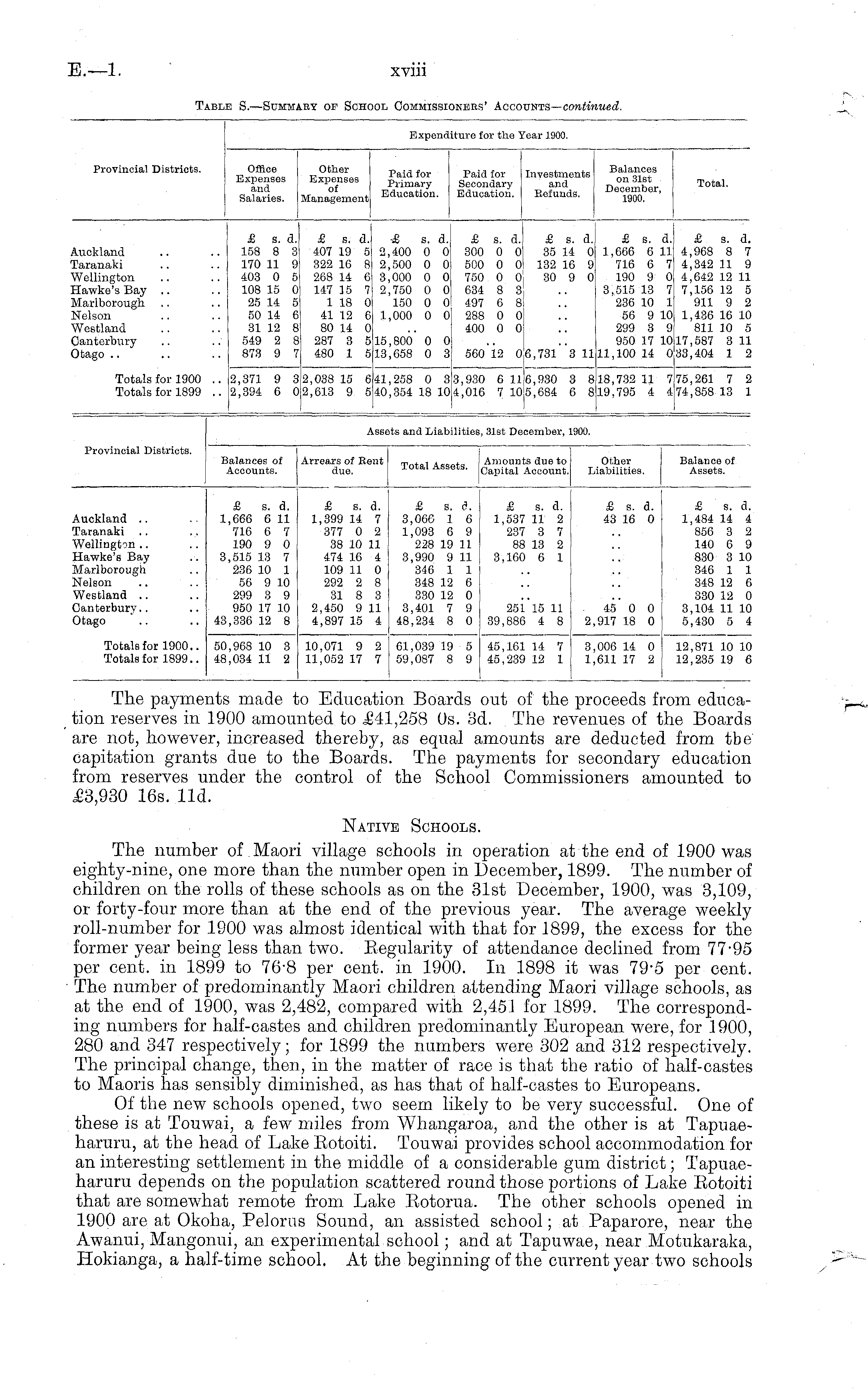 Expenditure for the Year 1900. Provincial Districts. Expanses Expenses Paia for Paia for Investments B o a^° s f Expenses Expenses Pl . imary Secondary and De £mw SaUries. Management Education. Education. Befunds. Deo "J bel> Total. lUekland 'aranaki Vellington lawke's Bay .. larlborougb. .. <Telson Vestland Canterbury )tago £ s. d. 158 8 3 170 11 9 403 0 5 108 15 0 25 14 5 50 14 6 31 12 8 549 2 8 873 9 7 £ s. d. 407 19 5 322 16 8 268 14 6 147 15 7 1 18 0 41 12 6 80 14 0 287 3 5 480 1 5 ■£ s. d. 2,400 0 0 2,500 0 0 3,000 0 0 2,750 0 0| 150 0 01 1,000 0 0| £ s. d. 300 0 0 500 0 0 750 0 0, 634 8 3 497 6 8 288 0 0! 400 o o: £ s. d. 35 14 0 132 16 9 30 9 0 £ s. d. 1,666 6 11 716 6 7 190 9 0 3,515 13 7 236 10 1 56 9 10 299 3 9 950 17 10 11,100 14 0 £ s. d. 4,968 8 7 4,342 11 9 4,642 12 11 7,156 12 5 911 9 2 1,436 16 10 811 10 5 17,587 3 11 33,404 1 2 •• 15,800 0 0i 13,658 0 3 56012 0 |6,73l"3 11 Totals for 1900 .. Totals for 1899 .. 2,371 9 3 2,394 6 0 2,038 15 6 2,613 9 5 41,258 0 3 40,354 18 10 3,930 6 11 4,016 7 10 6,930 3 8 5,684 6 8 18,732 11 7 19,795 4 4 75,261 7 2 74,858 13 1 -ssets and Liabi ilities, 31st D< :ember, 1909. Provincial Districts. Balances of Arrears of Kei Accounts. due. nt Total Ass. t ■' Amoun ns - Capital :s due to Account. Other Liabilities. Balance of Assets, Auckland .. Taranaki Wellington Hawke's Bay Marlborough Nelson Westland Canterbury.. Otago £ s. d. 1,666 6 11 716 6 7 190 9 0 3,515 13 7 236 10 1 56 9 10 299 3 9 950 17 10 43,336 12 8 £ s. d. 1,399 14 7 377 0 2 38 10 11 474 16 4 109 11 0 292 2 8 31 8 3 2,450 9 11 4,897 15 4 £ s d 3,066 1 6 1,093 6 9 228 19 11 3,990 9 11 346 1 1 348 12 6 330 12 0 3,401 7 9 48,234 8 0 £ s. d. 1,537 11 2 : 237 3 7 88 13 2 3,160 6 1 £ s. d. 43 16 0 £ s. d. 1,484 14 4 856 3 2 140 6 9 830 3 10 346 1 1 348 12 6 330 12 0 3,104 11 10 5,430 5 4 251 15 11 39,886 4 8 45 0 0 2,917 18 0 Totals for 1900.. Totals for 1899.. 50,968 10 3 48,034 11 2 10,071 9 2 11,052 17 7 61,039 19 5 59,087 8 9 45,161 14 7 45,239 12 1 3,006 14 0 1,611 17 2 12,871 10 10 I 12,235 19 6