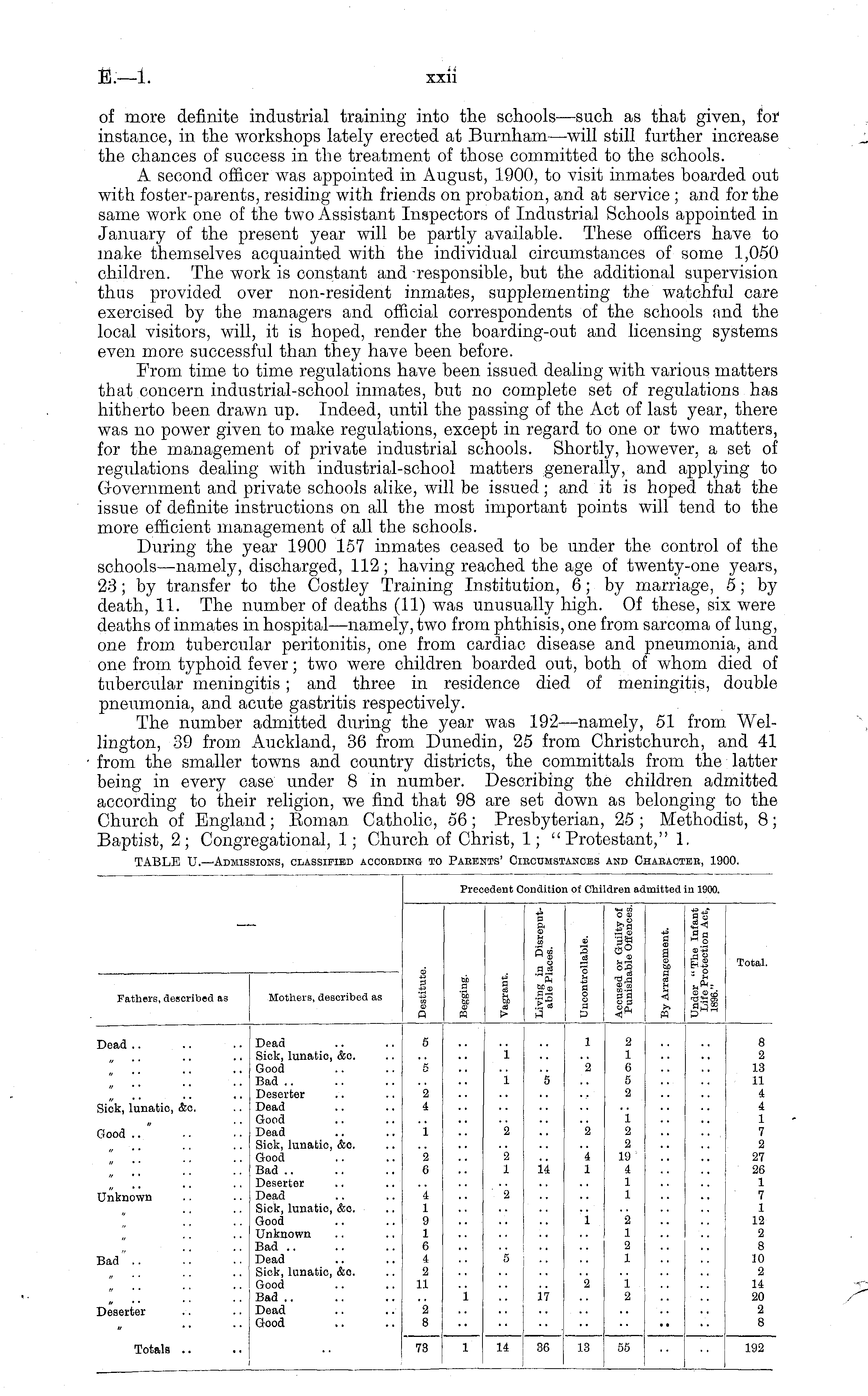 of more definite industrial training into the schools—such as that given, for instance, in the workshops lately erected at Burnham—will still further increase the chances of success in the treatment of those committed to the schools. A second officer was appointed in August, 1900, to visit inmates boarded out with foster-parents, residing with friends on probation, and at service ; and for the same work one of the two Assistant Inspectors of Industrial Schools appointed in January of the present year will be partly available. These officers have to make themselves acquainted with the individual circumstances of some 1,050 children. The work is constant and responsible, but the additional supervision thus provided over non-resident inmates, supplementing the watchful care exercised by the managers and official correspondents of the schools and the local visitors, will, it is hoped, render the boarding-out and licensing systems even more successful than they have been before. From time to time regulations have been issued dealing with various matters that concern industrial-school inmates, but no complete set of regulations has hitherto been drawn up. Indeed, until the passing of the Act of last year, there was no power given to make regulations, except in regard to one or two matters, for the management of private industrial schools. Shortly, however, a set of regulations dealing with industrial-school matters generally, and applying to Government and private schools alike, will be issued; and it is hoped that the issue of definite instructions on all the most important points will tend to the more efficient management of all the schools. During the year 1900 157 inmates ceased to be under the control of the schools —namely, discharged, 112; having reached the age of twenty-one years, 23; by transfer to the Costley Training Institution, 6; by marriage, 5; by death, 11. The number of deaths (11) was unusually high. Of these, six were deaths of inmates in hospital—namely, two from phthisis, one from sarcoma of lung, one from tubercular peritonitis, one from cardiac disease and pneumonia, and one from typhoid fever; two were children boarded out, both of whom died of tubercular meningitis; and three in residence died of meningitis, double pneumonia, and acute gastritis respectively. The number admitted during the year was 192 —namely, 51 from Wellington, 39 from Auckland, 36 from Dunedin, 25 from Christchurch, and 41 from the smaller towns and. country districts, the committals from the latter being in every case under 8 in number. .Describing the children admitted according to their religion, we find that 98 are set down as belonging to the Church of England; Soman Catholic, 56; Presbyterian, 25 ; Methodist, 8; Baptist, 2; Congregational, 1; Church of Christ, 1; "Protestant," 1.