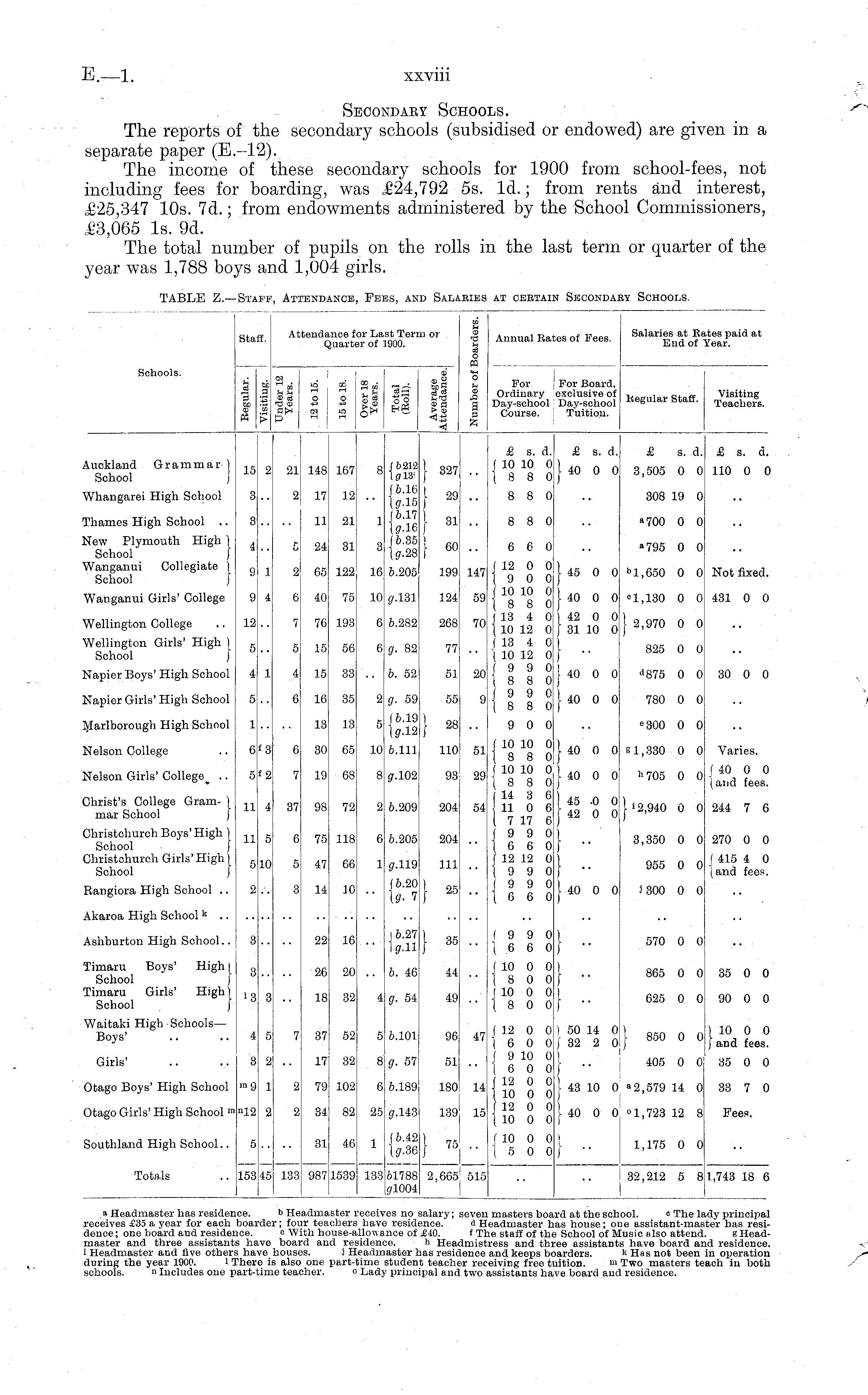 Schools. Staff. I I C3 . ! . <D Cβ O O Attendance f< Quark Dr Lai iT Of ] at Term or l900. 0 If gl §6 II £ JH «J O fC o u 03 ■a s 'A Annual Rai :es of Fees. Kegular Staff. /UWj^ Salaries at Bates paid at End of Year. I For Ordinary Day-school Course. i For Board, exclusive of Day-school Tuition. £ s. a. (10 10 0 1 8 8 0 £ s. a. & s. a. £ s. d. Aucklana Grammar) School j 15 21 148 167 f 1)212 1313' (6.16 16.17 l<7.16 (6.35 l?-28 I 327 J 291 J 60 J 40 0 0 3,505 0 0 110 0 0 Whangarei High School 3 2 17 12 8 8 0 308 19 0 Thames High School .. 11 21 8 8 0 »700 0 0 New Plymouth High ) School 1 Wanganui Collegiate \ School J f 2 24 65 31 122 3 16 147 6 6 0 (12 0 0 \900 ( 10 10 0 |880 (13 4- 0 1 10 12 0 ( 13 4 0 1 10 12 0 (990 (880 (990 |880 I 45 0 0 I 40 0 0 142 0 0 J 31 10 0 I .. 1 40 0 0 I 40 0 0! I a 795 0 0 "1,650 0 0 Not fixea. 6.205 199 Wanganui Girls' College 9 6 40 75 10 9-131 124 59 "1,130 0 0 431 0 0 Wellington College 12 7 76 193 6 6.282 268 70 I 2,970 0 0 Wellington Girls' High \ School j 5 5 15 56 ?. 82 77 825 0 0 Napier Boys' High School 4 15 33 i>. 52 51 20 ''875 0 0 30 0 0 Napier Girls' High School 6 16 35 2 g. 59 55 9 780 0 0 Marlborough High School 13 13 5 (6.19 tgr-12 1 28 ! 9 0 0 "300 0 0 Nelson College Nelson Girls' .. Christ's College Gram- ) mar School j Christclmrch Boys'High } School ■ j Christohurch Girls' High) School ) 11 f 3 ! 2 37 6 30 19 98 65 68 72 10 8 6.111 0.102 6.209 1101 i 93 204| 51 29 54 ( 10 10 0 |880 f 10 10 0 I 8 8 0 14 3 6 11 0 6 ( 7 17 6 ] 9 9 0 16 6 0 f 12 12 0 19 9 0 j 9 9 0 16 6 0 I 40 0 O^ I 40 0 0 ) 45 0 0 42 0 0 I ■ I 40 0 0 s 1,330 0 0 11 705 0 0 I '2,940 0 0 Varies. (40 0 0 (ana fees. 244 7 6 11 75 118 6.205 204 3,350 0 0| 270 0 0 5 5 47 66 0.119 111 955 0 Oj f 415 4 0 [ana fees. Rangiora High School .. 3 U 10 (6.20 \g- 7 I 25 i 300 0 0i Akaroa High School k .. Ashburton High School.. q 22 16 I 6.27! J0.11 I 35 (990 16 6 0 1 - 570 0 0 Timaru Boys' High I School J Timaru Girls' High) School J Waitaki High Schools — Boys' '3 26 18 20 32 4 6. 46 g. 54 44 49 J 10 0 0 1 8 0 0 J 10 0 0 1 8 0 0 I - 865 0 0 625 0 0 35 0 0 90 0 0 37 52 6.101 96 47 ( 12 0 0 16 0 0 ( 9 10 0 (600 j 12 0 0 1 10 0 0 12 0 0 1 10 0 0 ) 50 14 0 )' 32 2 0 1 \ \ j ]■ 43 10 0 I 40 0 0 J 850 0 0 I 10 0 0 J and fee8. Girls' 9, 17 32 8 g. 57 51 405 0 0;' 35 0 0 Otago Boys' High School 2 79j 102 6 6.189 180 14 "2,579 14 0 33 7 0 n>9 Otago Girls' High School m 34 82 25 0.148 139 15 "1,723 12 8 Fees. "12 Southlana High School.. 5 153 133 31 1 987 i 46 I 1 133 (6.42 10.86 61788 0.1004 2,665 ! I |515 f 10 0 0 1 5 0 0 'I i 1,175 0 0 Totals 45 1539 32,212 5 8 1,743 18 6 .a Headmaster has residen receives £35 a year for each dence; one board and reside! master and three assistant! i Headmaster and five others during the year 1900. 1 1 schools. "Includes one p ice. boai ice. s ha 1 ha Cher •art-1 bHei rder; foil eWi ive boar ,ve house •e is also time teac admaster 3 ir teachers [th house-s 'd and rei )S. J H one part3her. c receives no t s have reside allowance of sidence. leadmaster h -time studen , 0 Lady princi salary; a ence. £10. h Head a as resid tteache ipal and seven d.H< f Th Imist: Lence :r rec> two £ l masters boa headmaster 1] ae staff of th< ;ress and th] and keeps b< ■eiving free t assistants ha ird at the sch< las house; on e School of M ree assistants oarders. uition. m' we board and ool. c The li ie assistant-mat !usic also attend s have board a] li Has not been Two masters t€ [ residence. ady principal 3ter has resil. B Headnd residence, in operation iach in both