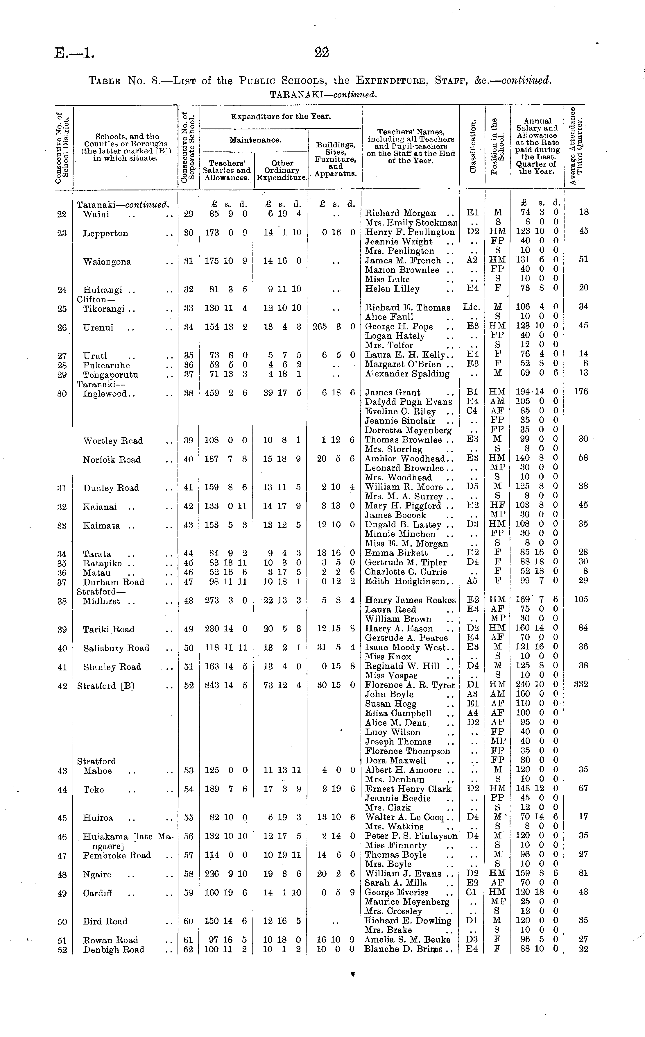 Table No. 8.—List of the Public Schools, the Expenditure, Staff, &c.— continued. TARANAKI— continued.