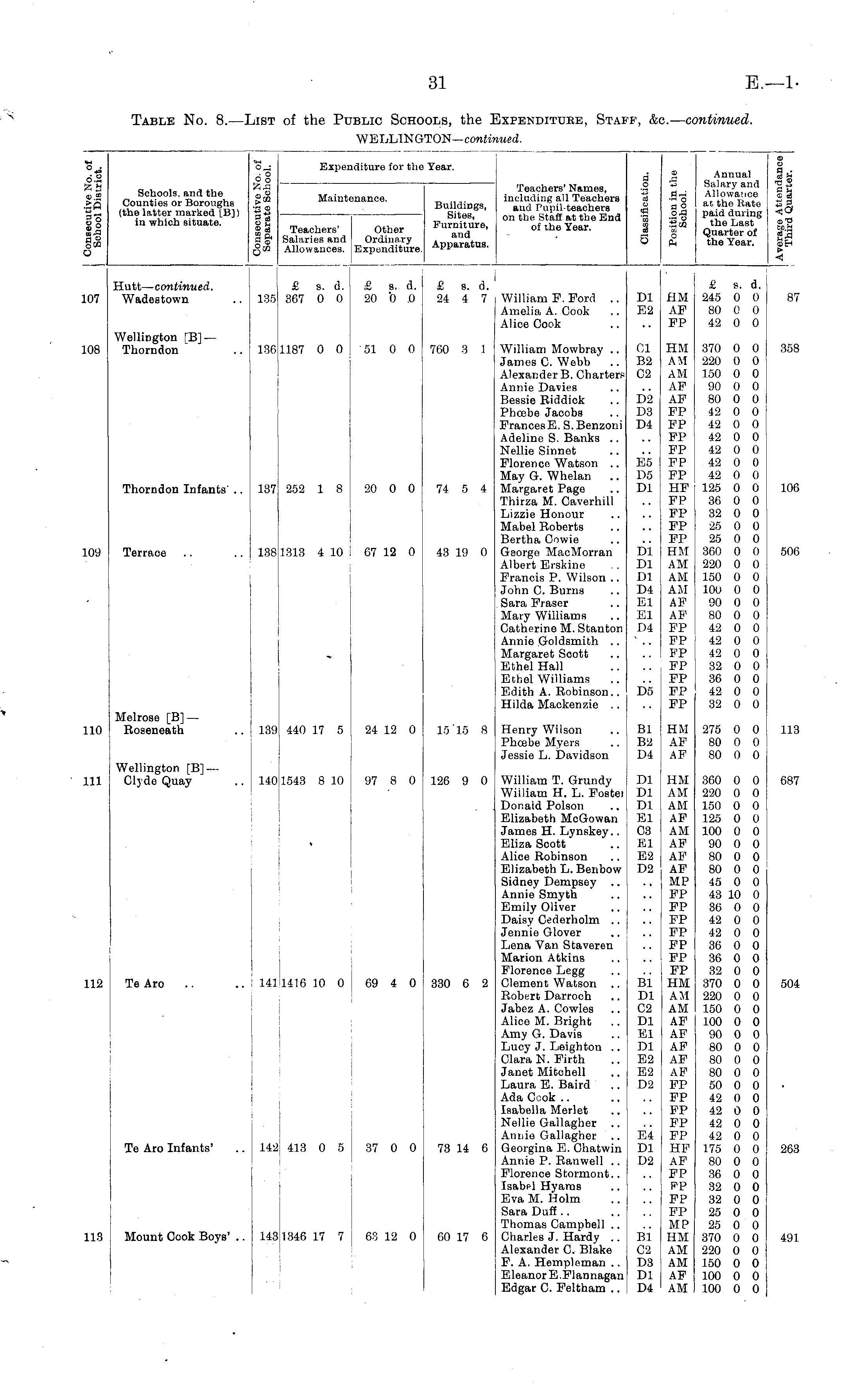 Table No. 8.—List of the Public Schools, the Expenditure, Staff, &c.— continued. WELLINGTON— continued.