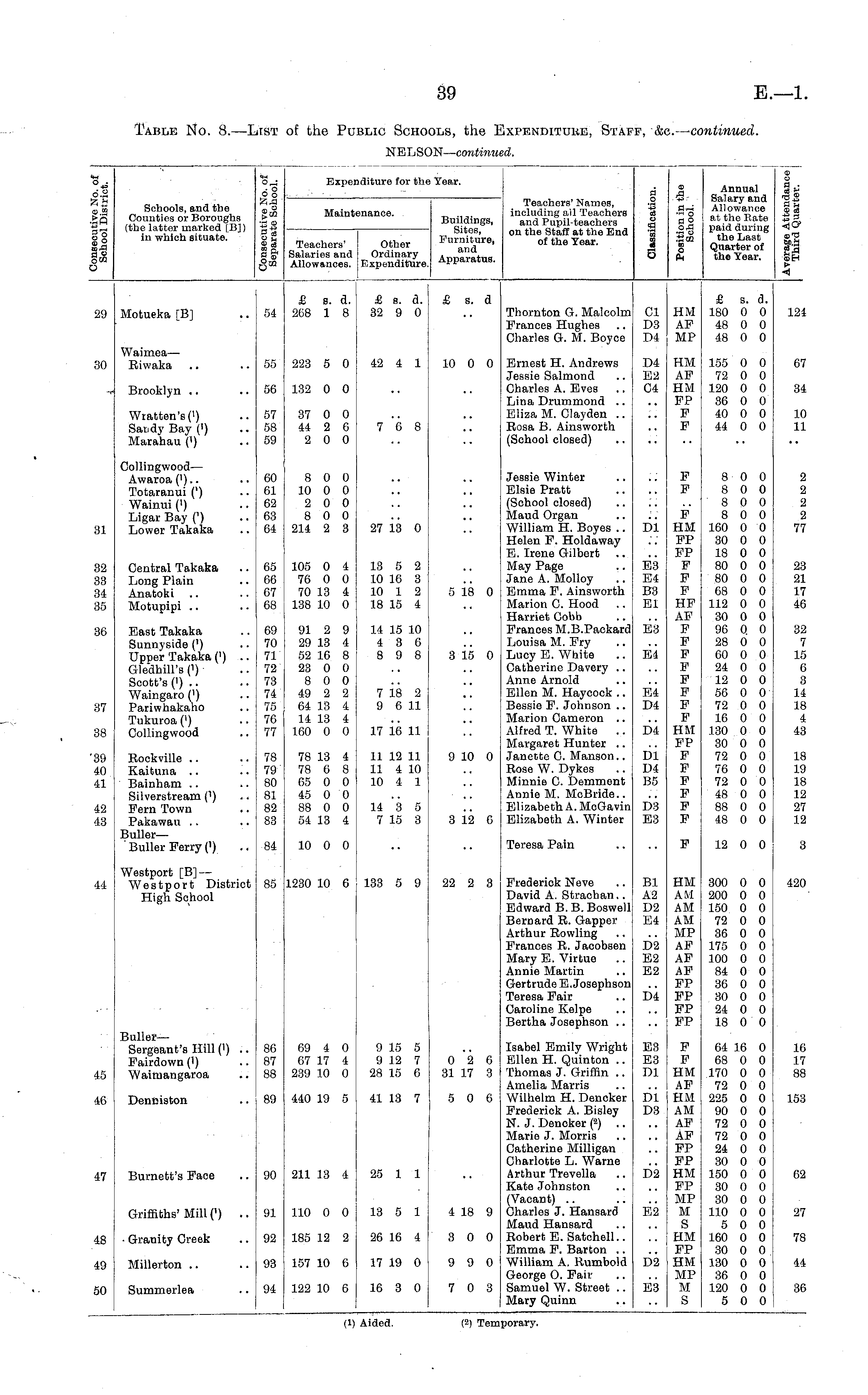 Table No. 8.—List of the Public Schools, the Expenditure, Staff, &c.— continued. NELSON— continued.