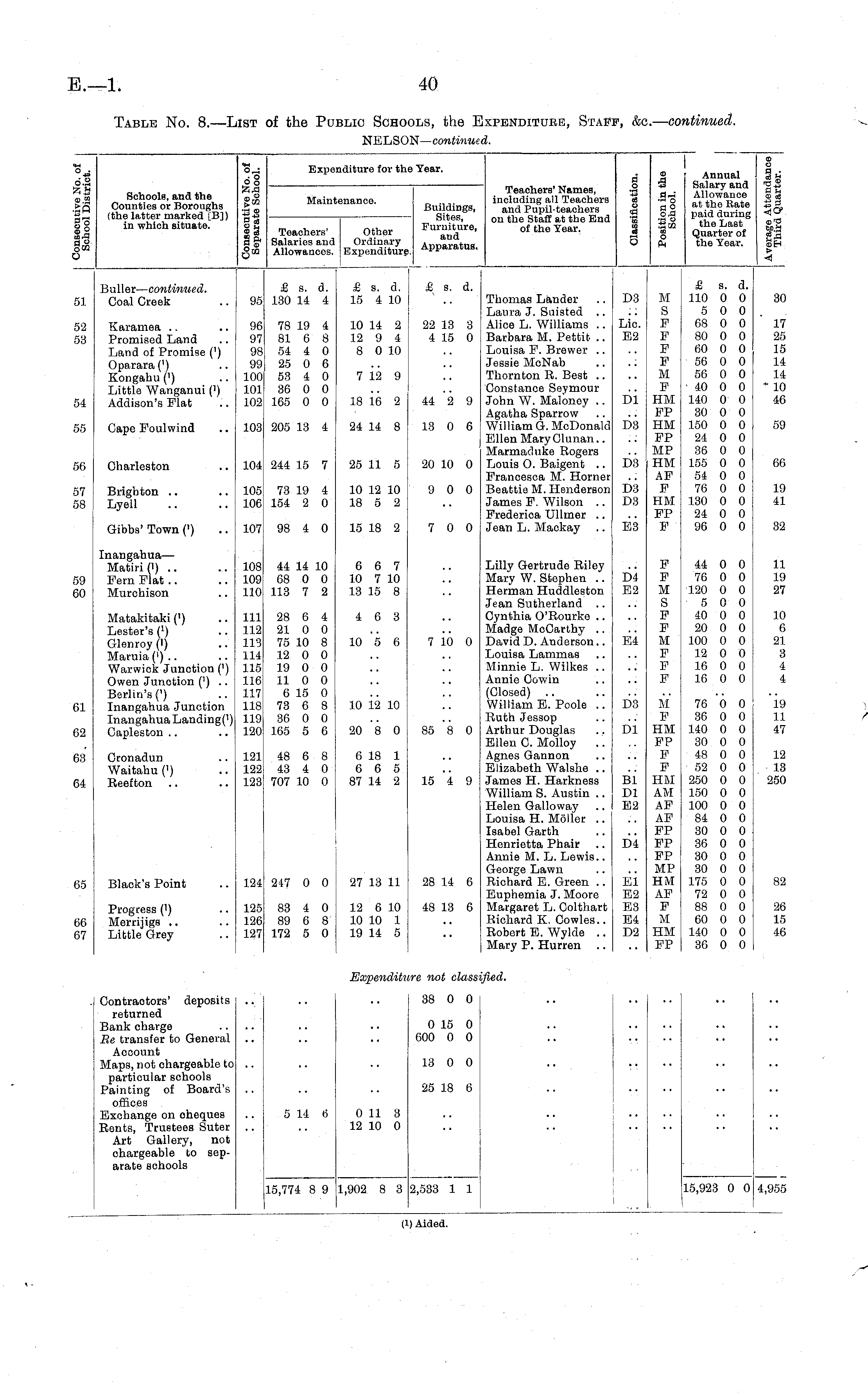 Table No. 8.—List of the Public Schools, the Expenditure, Staff, &c.— continued. NELSON— continued.