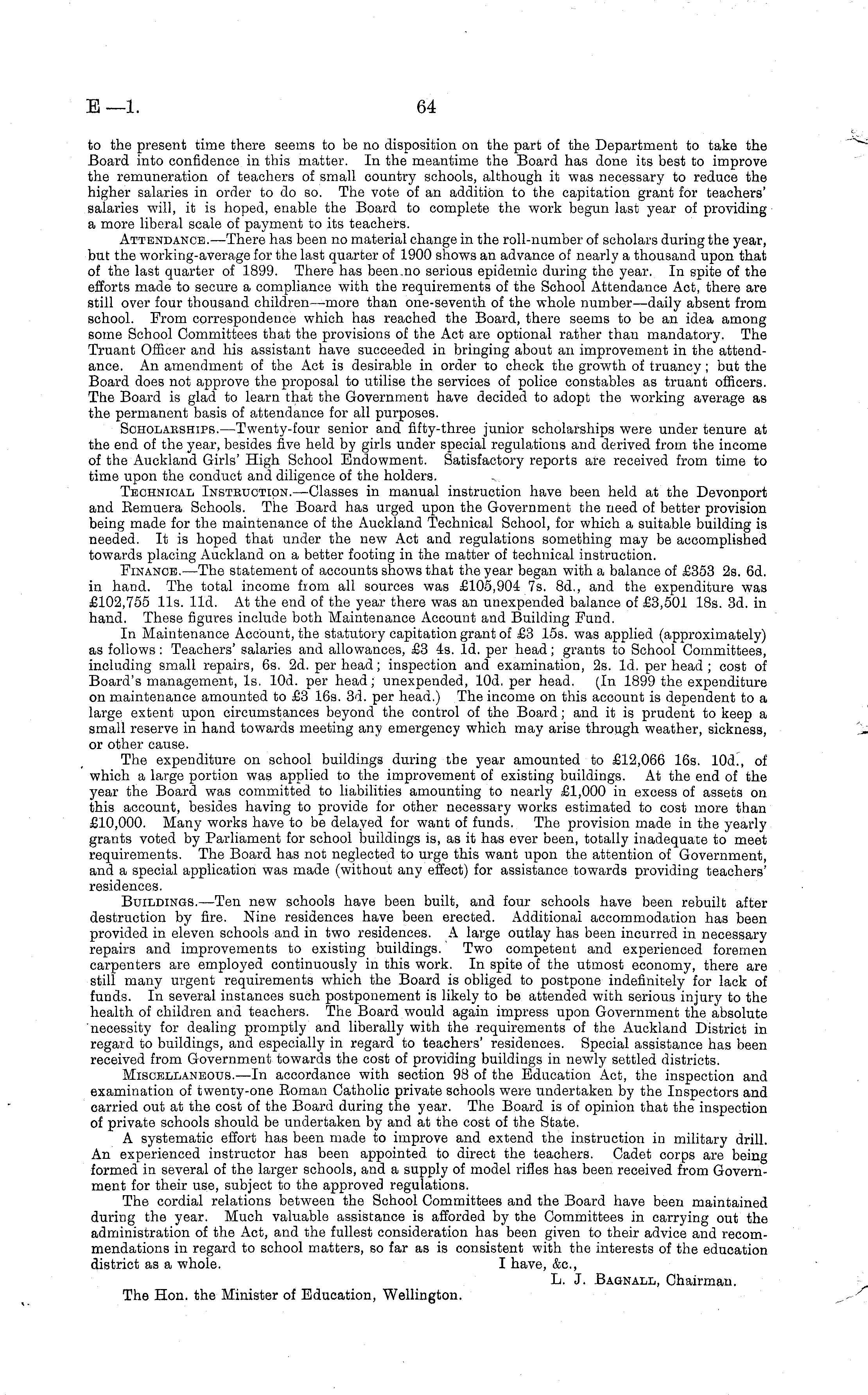 to the present time there seems to be no disposition on the part of the Department to take the Board into confidence in this matter. In the meantime the Board has done its best to improve the remuneration of teachers of small country schools, although it was necessary to reduce the higher salaries in order to do so. The vote of an addition to the capitation grant for teachers' salaries will, it is hoped, enable the Board to complete the work begun last year of providing a more liberal scale of payment to its teachers. Attendance. —There has been no material change in the roll-number of scholars during the year, but the working-average for the last quarter of 1900 shows an advance of nearly a thousand upon that of the last quarter of 1899. There has been.no serious epidemic during the year. In spite of the efforts made to secure a compliance with the requirements of the School Attendance Act, there are still over four thousand children—more than one-seventh of the whole number—daily absent from school. From correspondence which has reached the Board, there seems to be an idea among some School Committees that the provisions of the Act are optional rather than mandatory. The Truant Officer and his assistant have succeeded in bringing about an improvement in the attendance. An amendment of the Act is desirable in order to check the growth of truancy ; but the Board does not approve the proposal to utilise the services of police constables as truant officers. The Board is glad to learn that the Government have decided to adopt the working average as the permanent basis of attendance for all purposes. Scholaeships.—Twenty-four senior and fifty-three junior scholarships were under tenure at the end of the year, besides five held by girls under special regulations and derived from the income of the Auckland Girls' High School Endowment. Satisfactory reports are received from time to time upon the conduct and diligence of the holders. Technical Instbuction. —Classes in manual instruction have been held at the Devonport and Eemuera Schools. The Board has urged upon the Government the need of better provision being made for the maintenance of the Auckland Technical School, for which a suitable building is needed. It is hoped that under the new Act and regulations something may be accomplished towards placing Auckland on a better footing in the matter of technical instruction. Finance.—The statement of accounts shows that the year began with a balance of £353 2s. 6d. in hand. The total income from all sources was £105,904 7s. Bd., and the expenditure was £102,755 11s. lid. At the end of the year there was an unexpended balance of £3,501 18s. 3d. in hand. These figures include both Maintenance Account and Building Fund. In Maintenance Account, the statutory capitation grant of £3 15s. was applied (approximately) as follows: Teachers' salaries and allowances, £3 4s. Id. per head; grants to School Committees, including small repairs, 6s. 2d. per head; inspection and examination, 2s. Id. per head ; cost of Board's management, Is. 10d. per head; unexpended, lOd. per head. (In 1899 the expenditure on maintenance amounted to £3 16s. 3d. per head.) The income on this account is dependent to a large extent upon circumstances beyond the control of the Board; and it is prudent to keep a small reserve in hand towards meeting any emergency which may arise through weather, sickness, or other cause. The expenditure on school buildings during the year amounted to £12,066 16s. 10d., of which a large portion was applied to the improvement of existing buildings. At the end of the year the Board was committed to liabilities amounting to nearly £1,000 in excess of assets on this account, besides having to provide for other necessary works estimated to cost more than £10,000. Many works have to be delayed for want of funds. The provision made in the yearly grants voted by Parliament for school buildings is, as it has ever been, totally inadequate to meet requirements. The Board has not neglected to urge this want upon the attention of Government, and a special application was made (without any effect) for assistance towards providing teachers' residences. Buildings.—Ten new schools have been built, and four schools have been rebuilt after destruction by fire. Nine residences have been erected. Additional accommodation has been provided in eleven schools and in two residences. A large outlay has been incurred in necessary repairs and improvements to existing buildings. Two competent and experienced foremen carpenters are employed continuously in this work. In spite of the utmost economy, there are still many urgent requirements which the Board is obliged to postpone indefinitely for lack of funds. In several instances such postponement is likely to be attended with serious injury to the health of children and teachers. The Board would again impress upon Government the absolute necessity for dealing promptly and liberally with the requirements of the Auckland District in regard to buildings, and especially in regard to teachers' residences. Special assistance has been received from Government towards the cost of providing buildings in newly settled districts. Miscellaneous. —In accordance with section 98 of the Education Act, the inspection and examination of twenty-one Eoman Catholic private schools were undertaken by the Inspectors and carried out at the cost of the Board during the year. The Board is of opinion that the inspection of private schools should be undertaken by and at the cost of the State. A systematic effort has been made to improve and extend the instruction in military drill. An experienced instructor has been appointed to direct the teachers. Cadet corps are being formed in several of the larger schools, and a supply of model rifles has been received from Government for their use, subject to the approved regulations. The cordial relations between the School Committees and the 