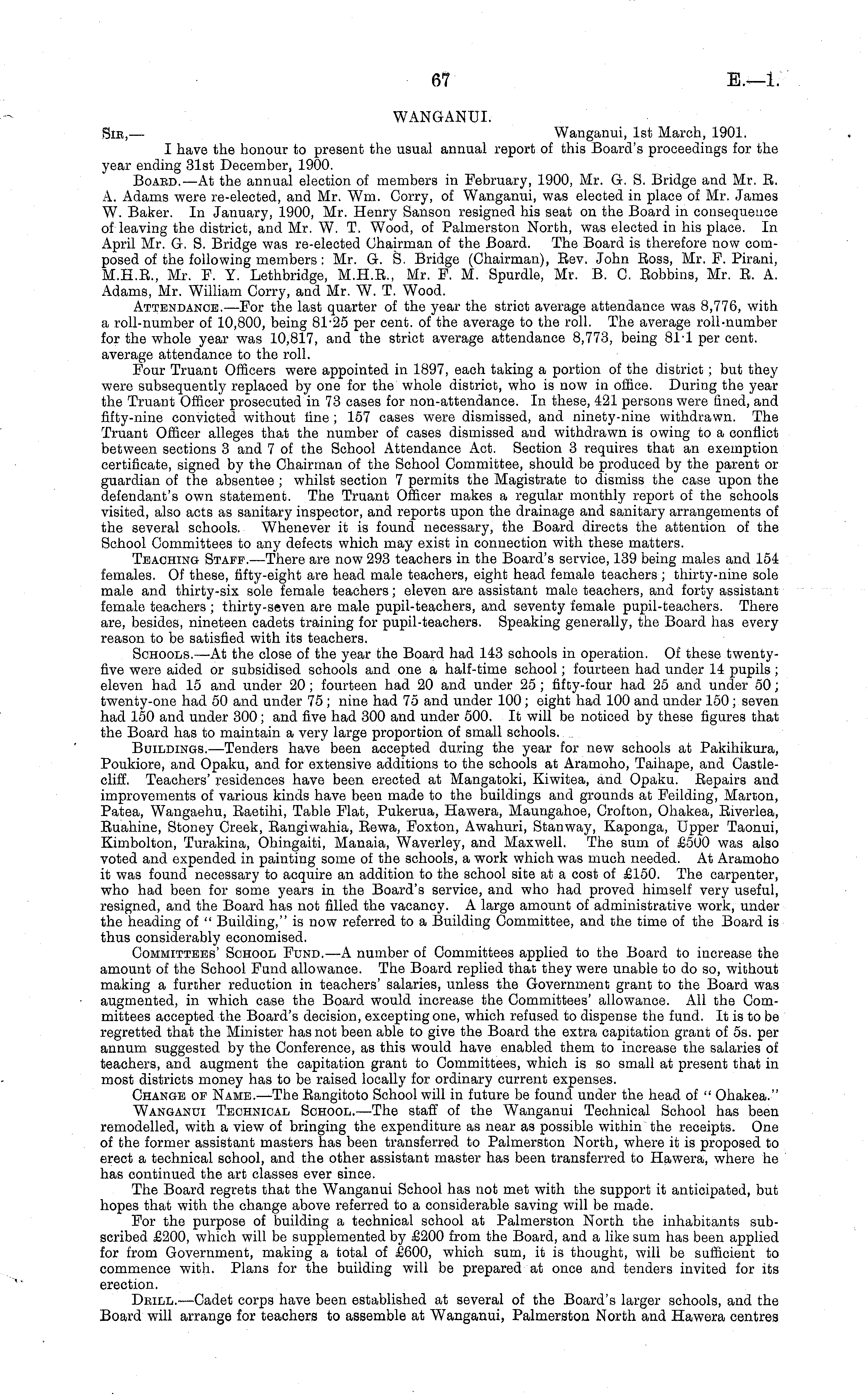 WANGANUI. Sib, — Wanganui, Ist March, 1901. I have the honour to present the usual annual report of this Board's proceedings for the year ending 31st December, 1900. Boabd. —At the annual election of members in February, 1900, Mr. G. S. Bridge and Mr. B. A. Adams were re-elected, and Mr. Wm. Corry, of Wanganui, was elected in place of Mr. James W. Baker. In January, 1900, Mr. Henry Sanson resigned his seat on the Board in consequence of leaving the district, and Mr. W. T. Wood, of Palmerston North, was elected in his place. In April Mr. G. S. Bridge was re-elected Chairman of the Board. The Board is therefore now composed of the following members: Mr. G. S. Bridge (Chairman), Rev. John Boss, Mr. P. Pirani, M.H.8., Mr. F; Y. Lethbridge, M.H.8., Mr. F. M. Spurdle, Mr. B. G. Bobbins, Mr. B. A. Adams, Mr. William Corry, and Mr. W. T. Wood. Attendance.—For the last quarter of the year the strict average attendance was 8,776, with a roll-number of 10,800, being 81-25 per cent, of the average to the roll. The average roll-number for the whole year was 10,817, and the strict average attendance 8,773, being 81-1 per cent, average attendance to the roll. Pour Truant Officers were appointed in 1897, each taking a portion of the district; but they were subsequently replaced by one for the whole district, who is now in office. During the year the Truant Officer prosecuted in 73 cases for non-attendance. In these, 421 persons were fined, and fifty-nine convicted without fine; 157 cases were dismissed, and ninety-nine withdrawn. The Truant Officer alleges that the number of cases dismissed and withdrawn is owing to a conflict between sections 3 and 7of the School Attendance Act. Section 3 requires that an exemption certificate, signed by the Chairman of the School Committee, should be produced by the parent or guardian of the absentee ; whilst section 7 permits the Magistrate to dismiss the case upon the defendant's own statement. The Truant Officer makes a regular monthly report of the schools visited, also acts as sanitary inspector, and reports upon the drainage and sanitary arrangements of the several schools. Whenever it is found necessary, the Board directs the attention of the School Committees to any defects which may exist in connection with these matters. Teaching Staff.—There are now 293 teachers in the Board's service, 139 being males and 154 females. Of these, fifty-eight are head male teachers, eight head female teachers ; thirty-nine sole male and thirty-six sole female teachers; eleven are assistant male teachers, and forty assistant female teachers ; thirty-seven are male pupil-teachers, and seventy female pupil-teachers. There are, besides, nineteen cadets training for pupil-teachers. Speaking generally, the Board has every reason to be satisfied with its teachers. Schools.—At the close of the year the Board had 143 schools in operation. Of these twentyfive were aided or subsidised schools and one a half-time school; fourteen had under 14 pupils; eleven had 15 and under 20; fourteen had 20 and under 25 ; fifty-four had 25 and under 50; twenty-one had 50 and under 75; nine had 75 and under 100; eight had 100 and under 150; seven had 150 and under 300; and five had 300 and under 500. It will be noticed by these figures that the Board has to maintain a very large proportion of small schools. Buildings.—Tenders have been accepted during the year for new schools at Pakihikura, Poukiore, and Opaku, and for extensive additions to the schools at Aramoho, Taihape, and Castlecliff. Teachers' residences have been erected at Mangatoki, Kiwitea, and Opaku. Repairs and improvements of various kinds have been made to the buildings and grounds at Peilding, Marton, Patea, Wangaehu, Baetihi, Table Flat, Pukerua, Hawera, Maungahoe, Crofton, Ohakea, Biverlea, Buahine, Stoney Creek, Bangiwahia, Bewa, Foxton, Awahuri, Stanway, Kaponga, Upper Taonui, Kimbolton, Turakina, Ohingaiti, Manaia, Waverley, and Maxwell. The sum of £500 was also voted and expended in painting some of the schools, a work which was much needed. At Aramoho it was found necessary to acquire an addition to the school site at a cost of £150. The carpenter, who had been for some years in the Board's service, and who had proved himself very useful, resigned, and the Board has not filled the vacancy. A large amount of administrative work, under the heading of " Building," is now referred to a Building Committee, and the time of the Board is thus considerably economised. Committees' School Fund.—A number of Committees applied to the Board to increase the amount of the School Fund allowance. The Board replied that they were unable to do so, without making a further reduction in teachers' salaries, unless the Government grant to the Board was augmented, in which case the Board would increase the Committees' allowance. All the Committees accepted the Board's decision, excepting one, which refused to dispense the fund. It is to be regretted that the Minister has not been able to give the Board the extra capitation grant of ss. per annum suggested by the Conference, as this would have enabled them to increase the salaries of teachers, and augment the capitation grant to Committees, which is so small at present that in most districts money has to be raised locally for ordinary current expenses. Change of Name. —The Bangitoto School will in future be found under the head of " Ohakea." Wanganui Technical School.—The staff of the Wanganui Technical School has been remodelled, with a view of bringing the expenditure as near as possible within the receipts. One of the former assistant masters has been transferred to Palmerston North, where it is proposed to erect a technical school, and the other assistant master has been transferred to Hawera, where he has continued the art classes ever since. The Board regrets that the Wanganui School has not met with the support it anticipated, but hopes that with the change above referred to a co