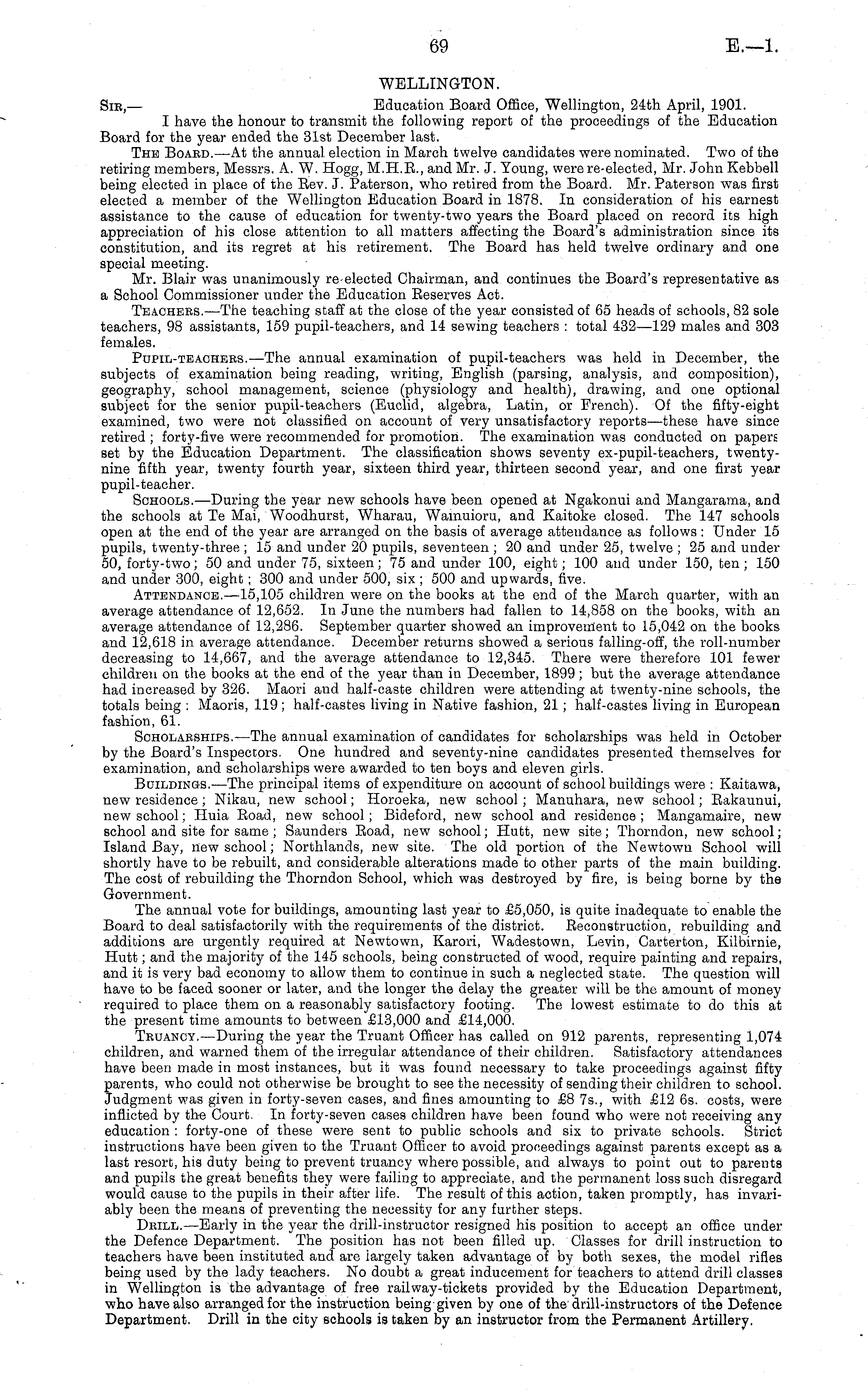 WELLINGTON. Sib,— Education Board Office, Wellington, 24th April, 1901. I have the honour to transmit the following report of the proceedings of the Education Board for the year ended the 31st December last. The Boabd. —At the annual election in March twelve candidates were nominated. Two of the retiring members, Messrs. A. W. Hogg, M.H.E., and Mr. J. Young, were re-elected, Mr. John Kebbell being elected in place of the Rev. J. Paterson, who retired from the Board. Mr. Paterson was first elected a member of the Wellington Education Board in 1878. In consideration of his earnest assistance to the cause of education for twenty-two years the Board placed on record its high appreciation of his close attention to all matters affecting the Board's administration since its constitution, and its regret at his retirement. The Board has held twelve ordinary and one special meeting. Mr. Blair was unanimously re-elected Chairman, and continues the Board's representative as a School Commissioner under the Education Eeserves Act. Teachers.—The teaching staff at the close of the year consisted of 65 heads of schools, 82 sole teachers, 98 assistants, 159 pupil-teachers, and 14 sewing teachers : total 432 —129 males and 303 females. Pupil-teachees.—The annual examination of pupil-teachers was held in December, the subjects of examination being reading, writing, English (parsing, analysis, and composition), geography, school management, science (physiology and health), drawing, and one optional subject for the senior pupil-teachers (Euclid, algebra, Latin, or French). Of the fifty-eight examined, two were not classified on account of very unsatisfactory reports —these have since retired ; forty-five were recommended for promotion. The examination was conducted on papers set by the Education Department. The classification shows seventy ex-pupil-teachers, twentynine fifth year, twenty fourth year, sixteen third year, thirteen second year, and one first year pupil-teacher. Schools. —During the year new schools have been opened at Ngakonui and Mangarama, and the schools at Te Mai, Woodhurst, Wharau, Wamuioru, and Kaitoke closed. The 147 schools open at the end of the year are arranged on the basis of average attendance as follows : Under 15 pupils, twenty-three ; 15 and under 20 pupils, seventeen ; 20 and under 25, twelve ; 25 and under 50, forty-two; 50 and under 75, sixteen; 75 and under 100, eight; 100 and under 150, ten; 150 and under 300, eight ; 300 and under 500, six ; 500 and upwards, five. Attendance.—ls,los children were on the books at the end of the March quarter, with an average attendance of 12,652. In June the numbers had fallen to 14,858 on the books, with an average attendance of 12,286. September quarter showed an improvement to 15,042 on the books and 12,618 in average attendance. December returns showed a serious falling-off, the roll-number decreasing to 14,667, and the average attendance to 12,345. There were therefore 101 fewer children on the books at the end of the year than in December, 1899; but the average attendance had increased by 326. Maori and half-caste children were attending at twenty-nine schools, the totals being : Maoris, 119; half-castes living in Native fashion, 21; half-castes living in European fashion, 61. Scholarships.—The annual examination of candidates for scholarships was held in October by the Board's Inspectors. One hundred and seventy-nine candidates presented themselves for examination, and scholarships were awarded to ten boys and eleven girls. Buildings.—The principal items of expenditure on account of school buildings were : Kaitawa, new residence ; Nikau, new school; Horoeka, new school ; Manuhara, new school; Rakaunui, new school; Huia Road, new school; Bideford, new school and residence ; Mangamaire, new school and site for same ; Saunders Road, new school; Hutt, new site; Thorndon, new school; Island Bay, new school; Northlands, new site. The old portion of the Newtown School will shortly have to be rebuilt, and considerable alterations made to other parts of the main building. The cost of rebuilding the Thorndon School, which was destroyed by fire, is being borne by the Government. The annual vote for buildings, amounting last year to £5,050, is quite inadequate to enable the Board to deal satisfactorily with the requirements of the district. Reconstruction, rebuilding and additions are urgently required at Newtown, Karori, Wadestown, Levin, Carterton, Kilbirnie, Hutt; and the majority of the 145 schools, being constructed of wood, require painting and repairs, and it is very bad economy to allow them to continue in such a neglected state. The question will have to be faced sooner or later, and the longer the delay the greater will be the amount of money required to place them on a reasonably satisfactory footing. The lowest estimate to do this at the present time amounts to between £13,000 and" £14,000. Truancy.—During the year the Truant Officer has called on 912 parents, representing 1,074 children, and warned them of the irregular attendance of their children. Satisfactory attendances have been made in most instances, but it was found necessary to take proceedings against fifty parents, who could not otherwise be brought to see the necessity of sending their children to school. Judgment was given in forty-seven cases, and fines amounting to £8 75., with £12 6s. costs, were inflicted by the Court. In forty-seven cases children have been found who were not receiving any education : forty-one of these were sent to public schools and six to private schools. Strict instructions have been given to the Truant Officer to avoid proceedings against parents except as a last resort, his duty being to prevent truancy where possible, and always to point out to parents and pupils the great benefits they were failing to appreciate, and the permanent loss such disregard would cause to the pupils in their after life. The result of this
