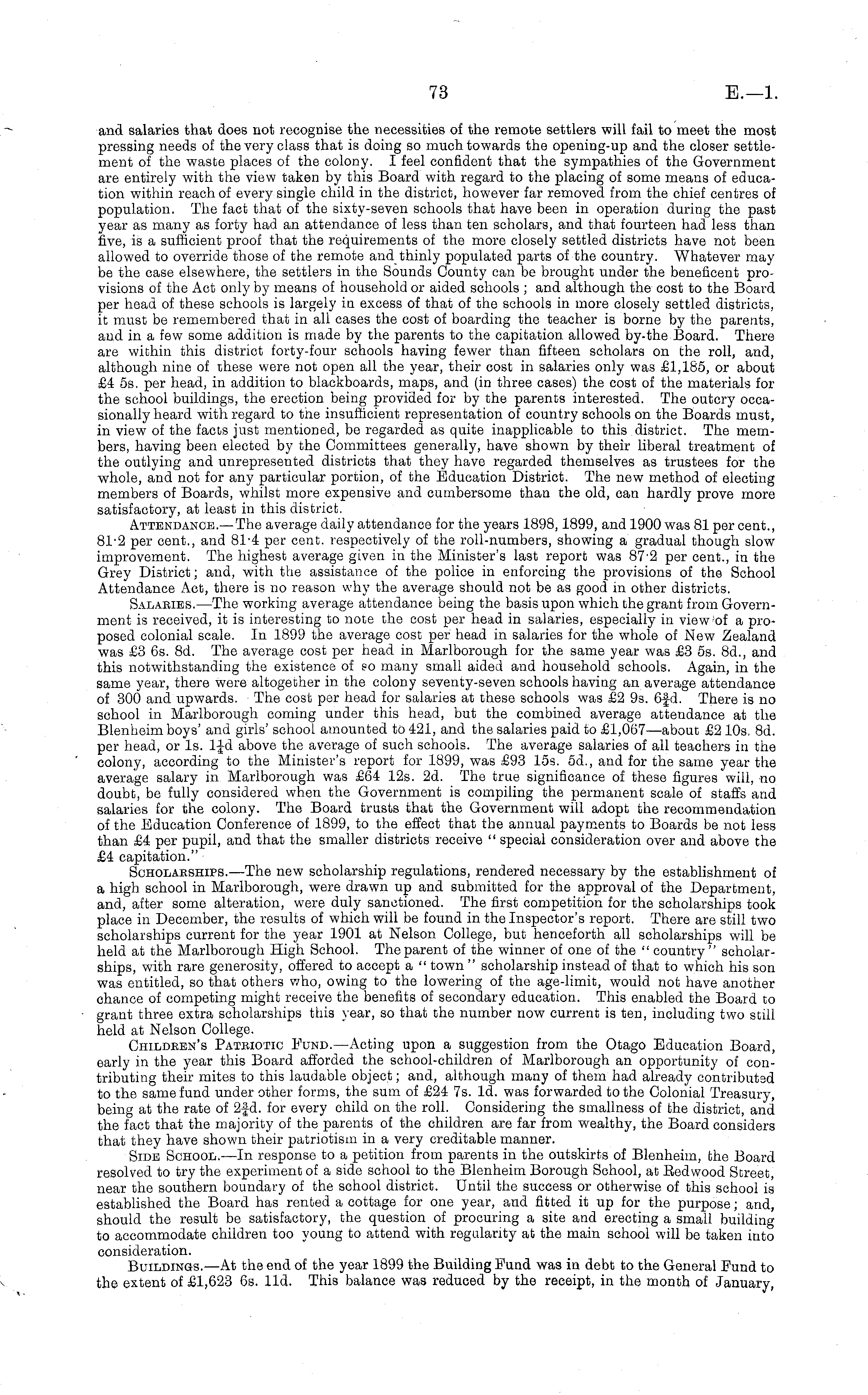 and salaries that does not recognise the necessities of the remote settlers will fail to meet the most pressing needs of the very class that is doing so much towards the opening-up and the closer settlement of the waste places of the colony. I feel confident that the sympathies of the Government are entirely with the view taken by this Board with regard to the placing of some means of education within reach of every single child in the district, however far removed from the chief centres of population. The fact that of the sixty-seven schools that have been in operation during the past year as many as forty had an attendance of less than ten scholars, and that fourteen had less than five, is a sufficient proof that the requirements of the more closely settled districts have not been allowed to override those of the remote and thinly populated parts of the country. Whatever may be the case elsewhere, the settlers in the Sounds County can be brought under the beneficent provisions of the Act only by means of household or aided schools ; and although the cost to the Board per head of these schools is largely in excess of that of the schools in more closely settled districts, it must be remembered that in all cases the cost of boarding the teacher is borne by the parents, and in a few some addition is made by the parents to the capitation allowed by-the Board. There are within this district forty-four schools having fewer than fifteen scholars on the roll, and, although nine of these were not open all the year, their cost in salaries only was £1,185, or about £4 ss. per head, in addition to blackboards, maps, and (in three cases) the cost of the materials for the school buildings, the erection being provided for by the parents interested. The outcry occasionally heard with regard to the insufficient representation of country schools on the Boards must, in view of the facts just mentioned, be regarded as quite inapplicable to this district. The members, having been elected by the Committees generally, have shown by their liberal treatment of the outlying and unrepresented districts that they have regarded themselves as trustees for the whole, and not for any particular portion, of the Education District. The new method of electing members of Boards, whilst more expensive and cumbersome than the old, can hardly prove more satisfactory, at least in this district. Attendance.— The average daily attendance for the years 1898,1899, and 1900 was 81 percent., 812 per cent., and 814 per cent, respectively of the roll-numbers, showing a gradual though slow improvement. The highest average given in the Minister's last report was 872 per cent., in the Grey District; and, with the assistance of the police in enforcing the provisions of the School Attendance Act, there is no reason why the average should not be as good in other districts. Salabies. —The working average attendance being the basis upon which the grant from Government is received, it is interesting to note the cost per head in salaries, especially in view of a proposed colonial scale. In 1899 the average cost per head in salaries for the whole of New Zealand was £3 6s. Bd. The average cost per head in Marlborough for the same year was £3 ss. Bd., and this notwithstanding the existence of so many small aided and household schools. Again, in the same year, there were altogether in the colony seventy-seven schools having an average attendance of 300 and upwards. The cost per head for salaries at these schools was £2 9s. 6fd. There is no school in Marlborough coming under this head, but the combined average attendance at the Blenheim boys' and girls' school amounted to 421, and the salaries paid to £1,067 —about £2 10s. Bd. per head, or Is. 1-J-d above the average of such schools. The average salaries of all teachers in the colony, according to the Minister's report for 1899, was £93 15s. od., and for the same year the average salary in Marlborough was £64 12s. 2d. The true significance of these figures will, no doubt, be fully considered when the Government is compiling the permanent scale of staffs and salaries for the colony. The Board trusts that the Government will adopt the recommendation of the Education Conference of 1899, to the effect that the annual payments to Boards be not less than £4 per pupil, and that the smaller districts receive " special consideration over and above the £4 capitation." Soholaeships.—The new scholarship regulations, rendered necessary by the establishment of a high school in Marlborough, were drawn up and submitted for the approval of the Department, and, after some alteration, were duly sanctioned. The first competition for the scholarships took place in December, the results of which will be found in the Inspector's report. There are still two scholarships current for the year 1901 at Nelson College, but henceforth all scholarships will be held at the Marlborough High School. The parent of the winner of one of the " country" scholarships, with rare generosity, offered to accept a " town " scholarship instead of that to which his son was entitled, so that others who, owing to the lowering of the age-limit, would not have another chance of competing might receive the benefits of secondary education. This enabled the Board to grant three extra scholarships this year, so that the number now current is ten, including two still held at Nelson College. Childben's Patbiotic Fund. —Acting upon a suggestion from the Otago Education Board, early in the year this Board afforded the school-children of Marlborough an opportunity of contributing their mites to this laudable object; and, although many of them had already contributed to the same fund under other forms, the sum of £24 7s. Id. was forwarded to the Colonial Treasury, being at the rate of 2fd. for every child on the roll. Considering the smallness of the district, and the fact that the majority of the parents of the children are far from we