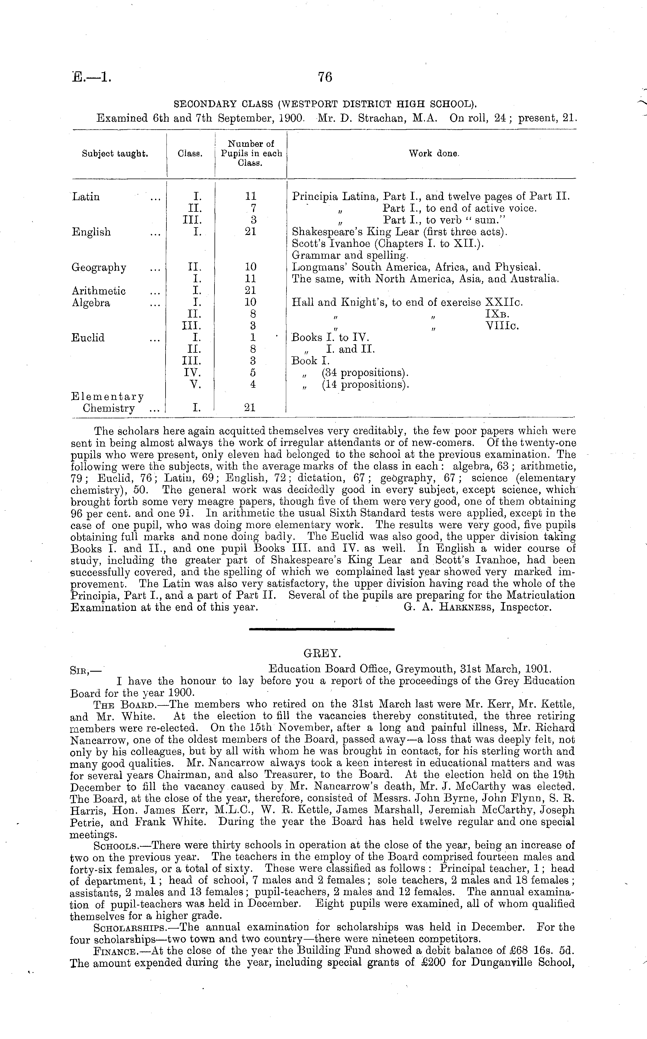 GEEY. Sib, — Education Board Office, Greymouth, 31st March, 1901. I have the honour to lay before you a report of the proceedings of the Grey Education Board for the year 1900. The Board. —The members who retired on the 31st March last were Mr. Kerr, Mr. Kettle, and Mr. White. At the election to fill the vacancies thereby constituted, the three retiring members were re-elected. On the 15th November, after a long and painful illness, Mr. Eichard Nancarrow, one of the oldest members of the Board, passed away—a loss that was deeply felt, not only by his colleagues, but by all with whom he was brought in contact, for his sterling worth and many good qualities. Mr. Nancarrow always took a keen interest in educational matters and was for several years Chairman, and also Treasurer, to the Board. At the election held on the 19th December to fill the vacancy caused by Mr. Nancarrow's death, Mr. J. McCarthy was elected. The Board, at the close of the year, therefore, consisted of Messrs. John Byrne, John Flynn, S. E. Harris, Hon. James Kerr, M.L.C., W. E. Kettle, James Marshall, Jeremiah McCarthy, Joseph Petrie, and Frank White. During the year the Board has held twelve regular and one special meetings. Schools. —There were thirty schools in operation at the close of the year, being an increase of two on the previous year. The teachers in the employ of the Board comprised fourteen males and forty-six females, or a total of sixty. These were classified as follows : Principal teacher, 1; head of department, 1; head of school, 7 males and 2 females; sole teachers, 2 males and 18 females ; assistants, 2 males and 13 females ; pupil-teachers, 2 males and 12 females. The annual examination of pupil-teachers was held in December. Eight pupils were examined, all of whom qualified themselves for a higher grade. Scholarships.—The annual examination for scholarships was held in December. For the four scholarships —two town and two country—there were nineteen competitors. Finance. —At the close of the year the Building Fund showed a debit balance of £68 16s. sd. The amount expended during the year, including special grants of £200 for Dunganyille School,