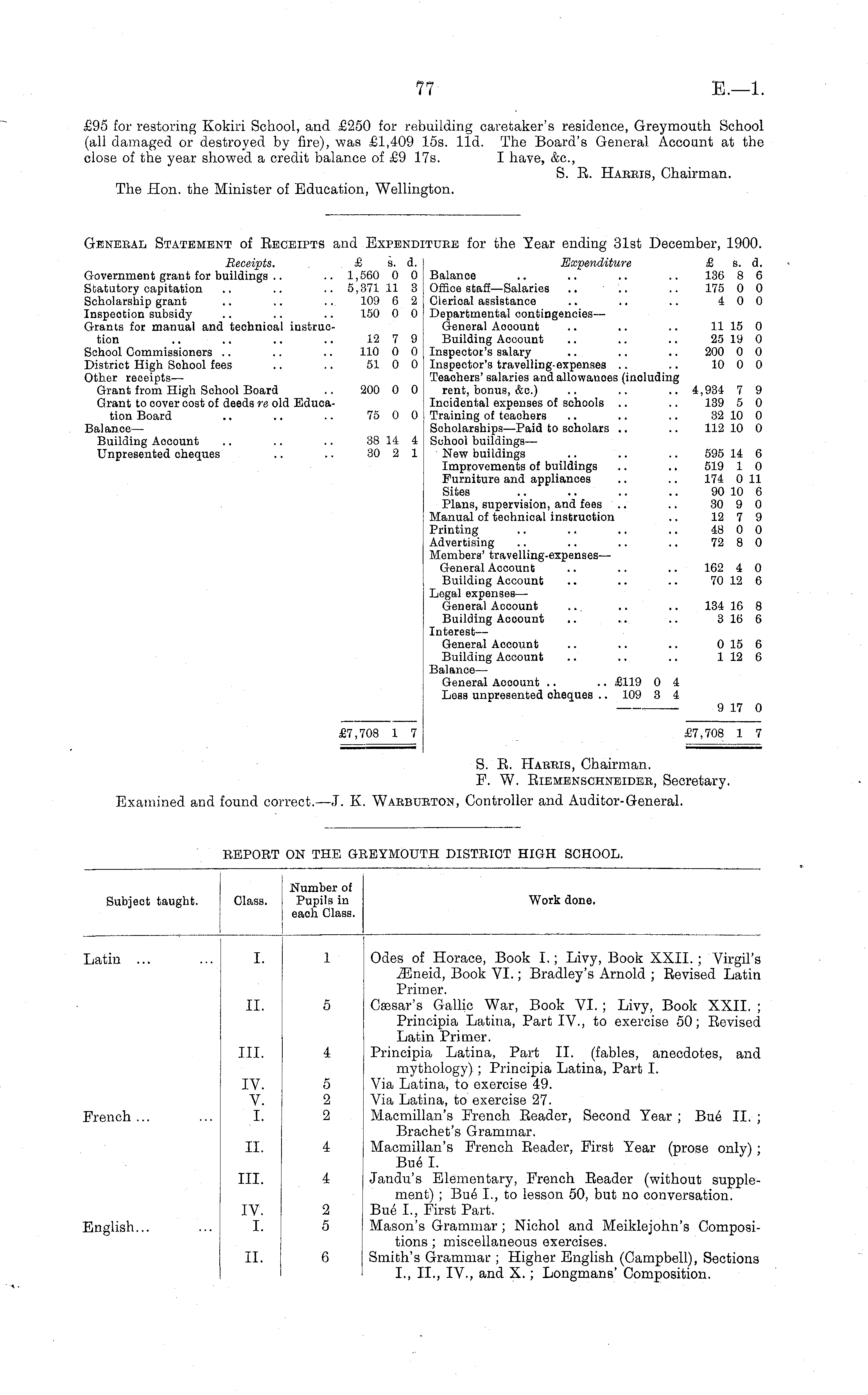 Gbnbeal Statement of Beceipts and Expenditube for the Year ending 31st December, 1900. Receipts. £ s. d. Expenditure £ s. d. Government grant for buildings .. .. 1,560 0 0 Balanoe .. .. .. .. 136 8 6 Statutory capitation .. .. .. 5,371 11 3 Office staff—Salaries .. .. .. 175 0 0 Scholarship grant .. .. ... 109 6 2 Clerical assistance .. .. .. 4 0 0 Inspection subsidy .. .. .. 150 00 ! Departmental contingencies— Grants for manual and technioal instruc- General Aocount .. .. .. 11 15 0 tion .. .. .. .. 12 7 9; Building Account .. .. .. 25190 School Commissioners .. .. .. 110 0 0 ; Inspector's salary .. .. .. 200 0 0 District High Sohool fees .. .. 51 0 0 Inspector's travelling-expenses .. .. 10 0 0 Other receipts— Teaohers' salaries and allowanoes (inoluding Grant from High School Board .. 200 00 ] rent, bonus, &c.) .. .. .. 4,934 7 9 Grant to cover cost of deeds re old Educa- ] Incidental expenses of schools .. .. 139 5 0 tion Board .. .. .. 75 00 j Training of teachers .. .. .. 32 10 0 Balance— Scholarships—Paid to scholars .. .. 112 10 0 Building Account .. .. .. 38 14 4 School buildings— Unpresented cheques .. .. 30 2 1 New buildings .. .. .. 595 14 6 Improvements of buildings .. .. 519 1 0 Furniture and appliances .. .. 174 0 11 Sites .. .. .. .. 90 10 6 Plans, supervision, and fees .. .. 30 9 0 Manual of technioal instruction .. 12 7 9 Printing .. .. .. .. 48 0 0 Advertising .. .. .. .. 72 8 0 Members' travelling-expenses— General Account .. .. .. 162 4 0 Building Account .. .. .. 70 12 6 Legal expenses— General Account ... .. .. 134 16 8 Building Acoount .. ~.,. .. 3 16 6 Interest— General Account .. .. .. 015 6 Building Account .. .. .. 1 12 6 Balance— General Account .. .. £119 0 4 Less unpresented oheques .. 109 3 4 9 17 0 £7,708 1 7 £7,708 1 7 S. E. Habbis, Chairman. F. W. Eiemenschneideb, Secretary. Examined and found correct. — J. K. Wabbueton, Controller and Auditor-General.