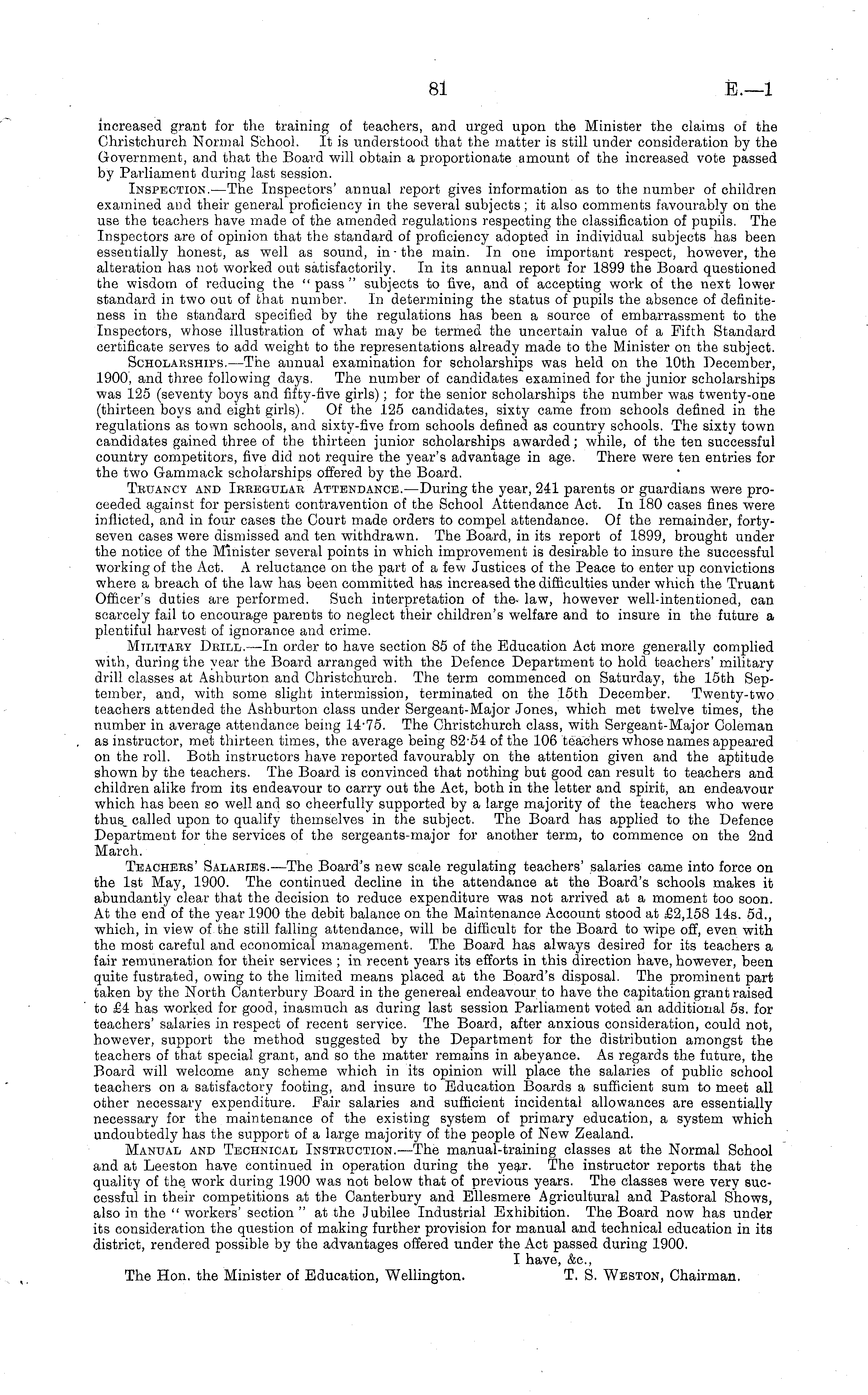 increased grant for the training of teachers, and urged upon the Minister the claims of the Christchurch Normal School. It is understood that the matter is still under consideration by the Government, and that the Board will obtain a proportionate amount of the increased vote passed by Parliament during last session. Inspection.—The Inspectors' annual report gives information as to the number of children examined and their general proficiency in the several subjects; it also comments favourably on the use the teachers have made of the amended regulations respecting the classification of pupils. The Inspectors are of opinion that the standard of proficiency adopted in individual subjects has been essentially honest, as well as sound, in ■ the main. In one important respect, however, the alteration has not worked out satisfactorily. In its annual report for 1899 the Board questioned the wisdom of reducing the " pass " subjects to five, and of accepting work of the next lower standard in two out of that number. In determining the status of pupils the absence of definiteness in the standard specified by the regulations has been a source of embarrassment to the Inspectors, whose illustration of what may be termed the uncertain value of a Fifth Standard certificate serves to add weight to the representations already made to the Minister on the subject. Scholarships.—The annual examination for scholarships was held on the 10th December, 1900, and three following days. The number of candidates examined for the junior scholarships was 125 (seventy boys and fifty-five girls); for the senior scholarships the number was twenty-one (thirteen boys and eight girls). Of the 125 candidates, sixty came from schools defined in the regulations as town schools, and sixty-five from schools defined as country schools. The sixty town candidates gained three of the thirteen junior scholarships awarded; while, of the ten successful country competitors, five did not require the year's advantage in age. There were ten entries for the two Gammack scholarships offered by the Board. Tbuancy and Irregular Attendance.—During the year, 241 parents or guardians were proceeded against for persistent contravention of the School Attendance Act. In 180 cases fines were inflicted, and in four cases the Court made orders to compel attendance. Of the remainder, fortyseven cases were dismissed and ten withdrawn. The Board, in its report of 1899, brought under the notice of the Minister several points in which improvement is desirable to insure the successful working of the Act. A reluctance on the part of a few Justices of the Peace to enter up convictions where a breach of the law has been committed has increased the difficulties under which the Truant Officer's duties are performed. Such interpretation of the law, however well-intentioned, can scarcely fail to encourage parents to neglect their children's welfare and to insure in the future a plentiful harvest of ignorance and crime. Military Drill. —In order to have section 85 of the Education Act more generally complied with, during the year the Board arranged with the Defence Department to hold teachers' military drill classes at Ashburton and Christchurch. The term commenced on Saturday, the 15th September, and, with some slight intermission, terminated on the 15th December. Twenty-two teachers attended the Ashburton class under Sergeant-Major Jones, which met twelve times, the number in average attendance being 1475. The Christchurch class, with Sergeant-Major Coleman as instructor, met thirteen times, the average being 8254 of the 106 teachers whose names appeared on the roll. Both instructors have reported favourably on the attention given and the aptitude shown by the teachers. The Board is convinced that nothing but good can result to teachers and children alike from its endeavour to carry out the Act, both in the letter and spirit, an endeavour which has been so well and so cheerfully supported by a large majority of the teachers who were thus, called upon to qualify themselves in the subject. The Board has applied to the Defence Department for the services of the sergeants-major for another term, to commence on the 2nd March. Teachers' Salaries. —The Board's new scale regulating teachers' salaries came into force on the Ist May, 1900. The continued decline in the attendance at the Board's schools makes it abundantly clear that the decision to reduce expenditure was not arrived at a moment too soon. At the end of the year 1900 the debit balance on the Maintenance Account stood at £2,158 14s. 5d., which, in view of the still falling attendance, will be difficult for the Board to wipe off, even with the most careful and economical management. The Board has always desired for its teachers a fair remuneration for their services ; in recent years its efforts in this direction have, however, been quite fustrated, owing to the limited means placed at the Board's disposal. The prominent part taken by the North Canterbury Board in the genereal endeavour to have the capitation grant raised to £4 has worked for good, inasmuch as during last session Parliament voted an additional ss. for teachers' salaries in respect of recent service. The Board, after anxious consideration, could not, however, support the method suggested by the Department for the distribution amongst the teachers of that special grant, and so the matter remains in abeyance. As regards the future, the Board will welcome any scheme which in its opinion will place the salaries of public school teachers on a satisfactory footing, and insure to Education Boards a sufficient sum to meet all other necessary expenditure. Fair salaries and sufficient incidental allowances are essentially necessary for the maintenance of the existing system of primary education, a system which undoubtedly has the support of a large majority of the people of New Zealand. Manual and Technical Instruction.—The manual-trainin