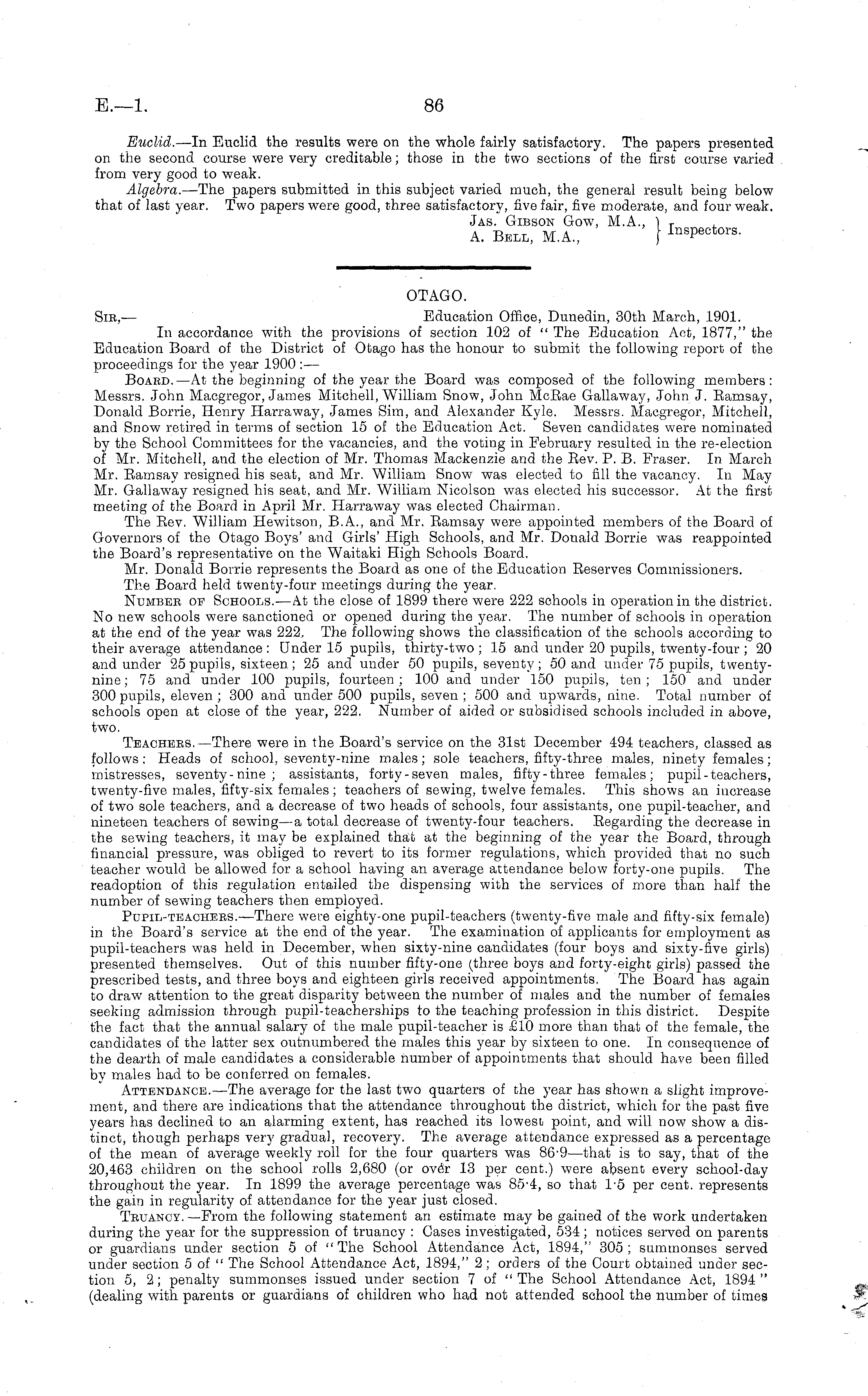 OTAGO. Sir,— Education Office, Dunedin, 30th March, 1901. In accordance with the provisions of section 102 of " The Education Act, 1877," the Education Board of the District of Otago has the honour to submit the following report of the proceedings for the year 1900 : — Boabd. —At the beginning of the year the Board was composed of the following members: Messrs. John Macgregor, James Mitchell, William Snow, John McEae Gallaway, John J. Bamsay, Donald Borrie, Henry Harraway, James Sim, and Alexander Kyle. Messrs. Macgregor, Mitchell, and Snow retired in terms of section 15 of the Education Act. Seven candidates were nominated by the School Committees for the vacancies, and the voting in February resulted in the re-election of Mr. Mitchell, and the election of Mr. Thomas Mackenzie and the Bey. P. B. Eraser. In March Mr. Bamsay resigned his seat, and Mr. William Snow was elected to fill the vacancy. In May Mr. Gallaway resigned his seat, and Mr. William Nicolson was elected his successor. At the first meeting of the Board in April Mr. Harraway was elected Chairman. The Bey. William Hewitson, 8.A., and Mr. Bamsay were appointed members of the Board of Governors of the Otago Boys' and Girls' High Schools, and Mr. Donald Borrie was reappointed the Board's representative on the Waitaki High Schools Board. Mr. Donald Borrie represents the Board as one of the Education Beserves Commissioners. The Board held twenty-four meetings during the year. Number of Schools.—At the close of 1899 there were 222 schools in operation in the district. No new schools were sanctioned or opened during the year. The number of schools in operation at the end of the year was 222, The following shows the classification of the schools according to their average attendance : Under 15 pupils, thirty-two ; 15 and under 20 pupils, twenty-four ; 20 and under 25 pupils, sixteen; 25 and under 50 pupils, seventy; 50 and under 75 pupils, twentynine ; 75 and under 100 pupils, fourteen ; 100 and under 150 pupils, ten; 150 and under 300 pupils, eleven ; 300 and under 500 pupils, seven ; 500 and upwards, nine. Total number of schools open at close of the year, 222. Number of aided or subsidised schools included in above, two. Teachers.—There were in the Board's service on the 31st December 494 teachers, classed as follows: Heads of school, seventy-nine males; sole teachers, fifty-three males, ninety females; mistresses, seventy-nine ; assistants, forty-seven males, fifty-three females; pupil-teachers, twenty-five males, fifty-six females; teachers of sewing, twelve females. This shows an increase of two sole teachers, and a decrease of two heads of schools, four assistants, one pupil-teacher, and nineteen teachers of sewing—a total decrease of twenty-four teachers. Eegarding the decrease in the sewing teachers, it may be explained that at the beginning of the year the Board, through financial pressure, was obliged to revert to its former regulations, which provided that no such teacher would be allowed for a school having an average attendance below forty-one pupils. The readoption of this regulation entailed the dispensing with the services of more than half the number of sewing teachers then employed. Popil-teachers.—There were eighty-one pupil-teachers (twenty-five male and fifty-six female) in the Board's service at the end of the year. The examination of applicants for employment as pupil-teachers was held in December, when sixty-nine candidates (four boys and sixty-five girls) presented themselves. Out of this number fifty-one (three boys and forty-eighc girls) passed the prescribed tests, and three boys and eighteen girls received appointments. The Board has again to draw attention to the great disparity between the number of males and the number of females seeking admission through pupil-teacherships to the teaching profession in this district. Despite the fact that the annual salary of the male pupil-teacher is £10 more than that of the female, the candidates of the latter sex outnumbered the males this year by sixteen to one. In consequence of the dearth of male candidates a considerable number of appointments that should have been filled by males had to be conferred on females. Attendance.—The average for the last two quarters of the year has shown a slight improvement, and there are indications that the attendance throughout the district, which for the past five years has declined to an alarming extent, has reached its lowest point, and will now show a distinct, though perhaps very gradual, recovery. The average attendance expressed as a percentage of the mean of average weekly roll for the four quarters was 86-9—that is to say, that of the 20,463 children on the school rolls 2,680 (or ove"r 13 per cent.) were absent every school-day throughout the year. In 1899 the average percentage was 85-4, so that 1-5 per cent, represents the gain in regularity of attendance for the year just closed. Truancy. —From the following statement an estimate may be gained of the work undertaken during the year for the suppression of truancy : Cases investigated, 534; notices served on parents or guardians under section 5 of "The School Attendance Act, 1894," 305; summonses served under section 5 of " The School Attendance Act, 1894," 2 ; orders of the Court obtained under section 5, 2; penalty summonses issued under section 7 of " The School Attendance Act, 1894 " (dealing with, parents or guardians of children who had not attended school the number of times