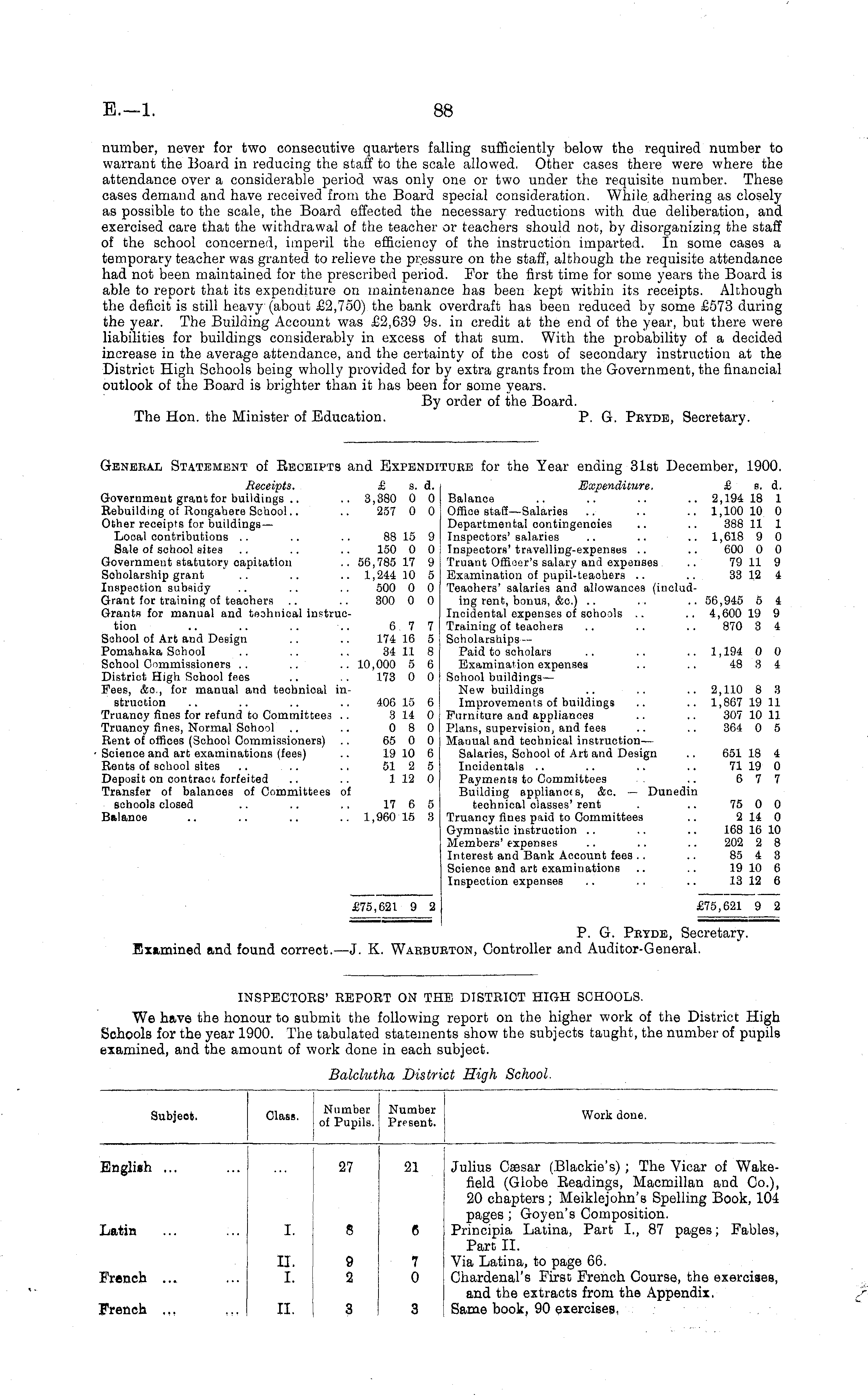 number, never for two consecutive quarters falling sufficiently below the required number to warrant the Board in reducing the staff to the scale allowed. Other cases there were where the attendance over a considerable period was only one or two under the requisite number. These cases demand and have received from the Board special consideration. While adhering as closely as possible to the scale, the Board effected the necessary reductions with due deliberation, and exercised care that the withdrawal of the teacher or teachers should not, by disorganizing the staff of the school concerned, imperil the efficiency of the instruction imparted. In some cases a temporary teacher was granted to relieve the pressure on the staff, although the requisite attendance had not been maintained for the prescribed period. For the first time for some years the Board is able to report that its expenditure on maintenance has been kept within its receipts. Although the deficit is still heavy (about £2,750) the bank overdraft has been reduced by some £573 during the year. The Building Account was £2,639 9s. in credit at the end of the year, but there were liabilities for buildings considerably in excess of that sum. With the probability of a decided increase in the average attendance, and the certainty of the cost of secondary instruction at the District High Schools being wholly provided for by extra grants from the Government, the financial outlook of the Board is brighter than it has been for some years. By order of the Board. The Hon. the Minister of Education. P. G. Pkyde, Secretary.