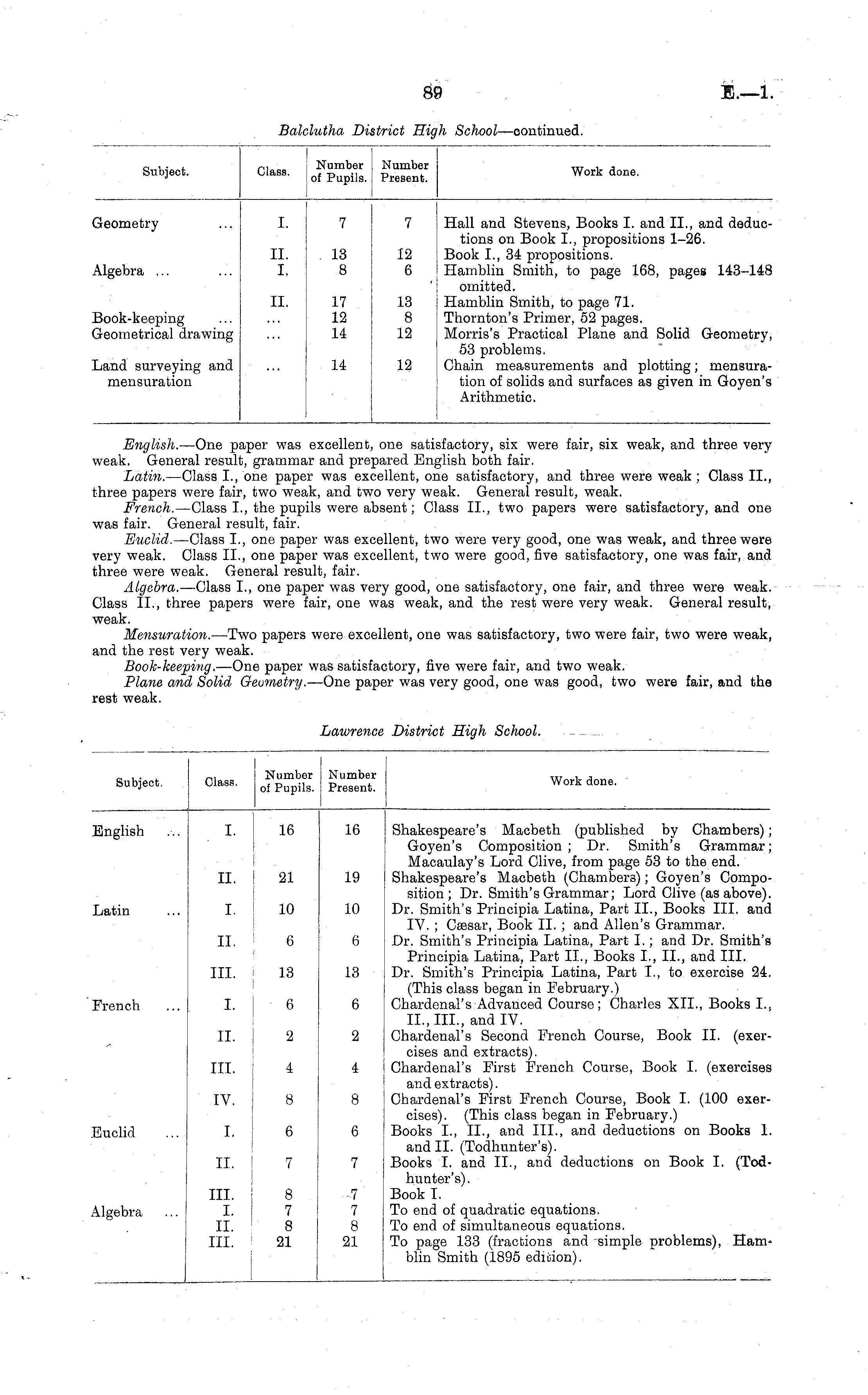 Subject. Class. Number Number of Pupils. Present. Work done. English I. II. I. 16 21 10 16 19 Shakespeare's Macbeth (published by Chambers); Goyen's Composition ; Dr. Smith's Grammar; Macaulay's Lord Clive, from page 53 to the end. Shakespeare's Macbeth (Chambers); Goyen's Composition; Dr. Smith's Grammar; Lord Clive (as above). Dr. Smith's Prinoipia Latina, Part II., Books III. and IV. ; Cassar, Book II. ; and Allen's Grammar. Dr. Smith's Principia Latina, Part I.; and Dr. Smith's Prinoipia Latina, Part II., Books I., II., and III. Dr. Smith's Principia Latina, Part I., to exercise 24. (This class began in February.) Chardenal's Advanced Course; Charles XII., Books I., II., III., and IV. Chardenal's Second French Course, Book II. (exercises and extracts). Chardenal's First French Course, Book I. (exercises and extracts). Ohardenal's First French Course, Book I. (100 exercises). (This class began in February.) Books I., II., and III., and deductions on Books 1. and II. (Todhunter's). Books I. and II., and deductions on Book I. (Todhunter's). Book I. To end of quadratic equations. To end of simultaneous equations. To page 133 (fracbions and simple problems), Hamblin Smith (1895 edicion). Latin 10 II. 6 6 III. 13 13 'rench I. 6 6 II. 2 2 III. 4 4 IV. 8 8 luclid I. 6 6 II. [ 7 7 lgebra III. I. II. III. I I 8 7 8 21 -7 7 8 21
