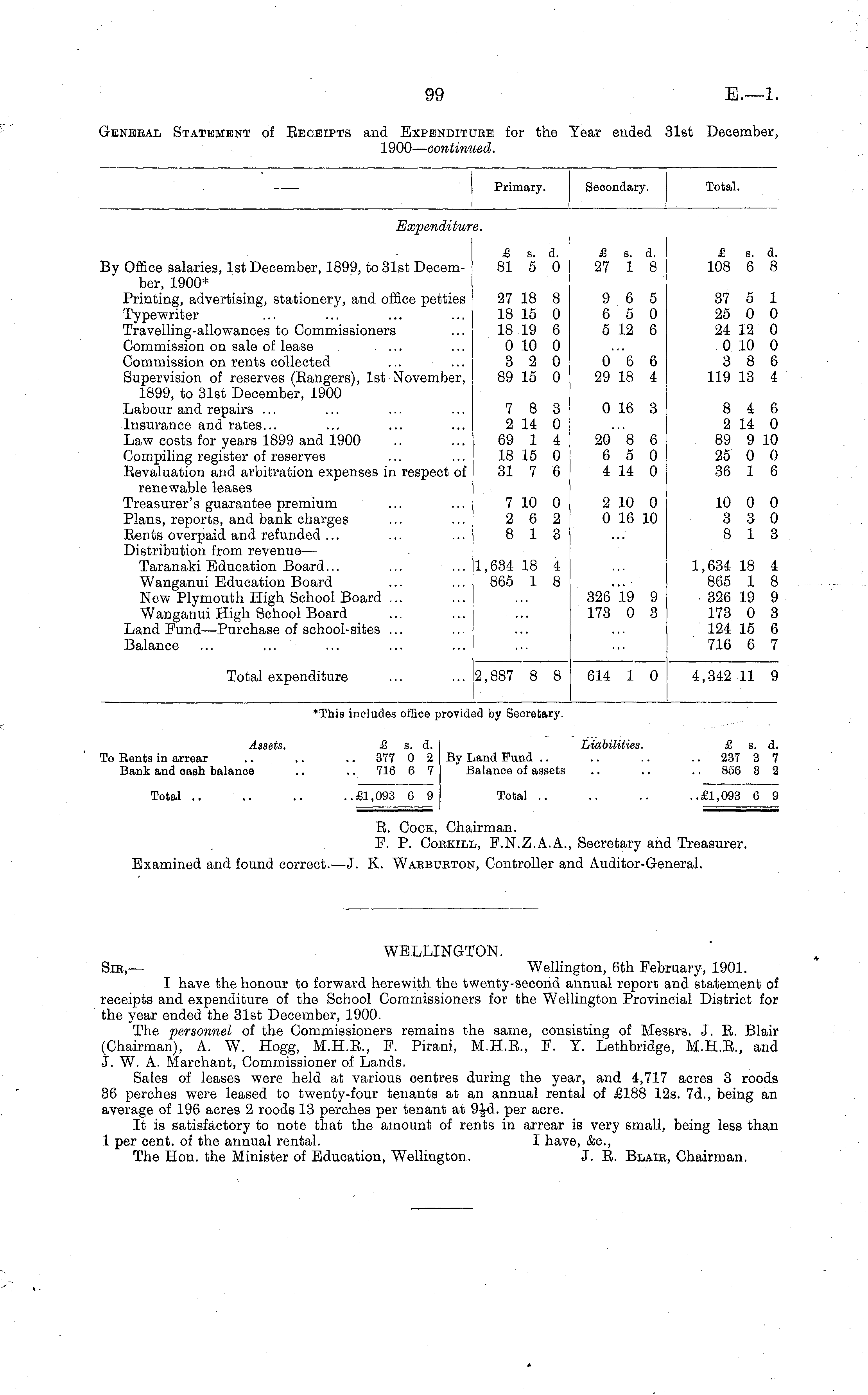 WELLINGTON. Sib,— Wellington, 6th February, 1901. I have the honour to forward herewith the twenty-second annual report and statement of receipts and expenditure of the School Commissioners for the Wellington Provincial District for the year ended the 31st December, 1900. The personnel of the Commissioners remains the same, consisting of Messrs. J. E. Blair (Chairman), A. W. Hogg, M.H.E., F. Pirani, M.H.E., F. Y. Lethbridge, M.H.E., and J. W. A. Marchant, Commissioner of Lands. Sales of leases were held at various centres during the year, and 4,717 acres 3 roods 36 perches were leased to twenty-four tenants at an annual rental of £188 12s. 7d., being an average of 196 acres 2 roods 13 perches per tenant at 9-J-d. per acre. It is satisfactory to note that the amount of rents in arrear is very small, being less than 1 per cent, of the annual rental. I have, &c, The Hon. the Minister of Education, Wellington. J. B. Blaib, Chairman.
