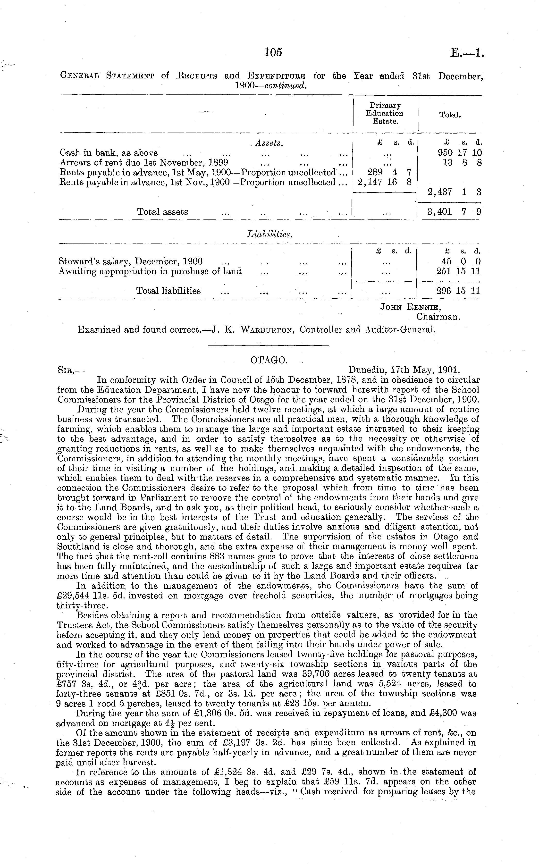 OTAGO. Sib,— Dunedin, 17th May, 1901. In conformity with Order in Council of 15th December, 1878, and in obedience to circular from the Education Department, I have now the honour to forward herewith report of the School Commissioners for the Provincial District of Otago for the year ended on the 31st December, 1900. During the year the Commissioners held twelve meetings, at which a large amount of routine business was transacted. The Commissioners are all practical men, with a thorough knowledge of farming, which enables them to manage the large and important estate intrusted to their keeping to the best advantage, and in order to satisfy themselves as to the necessity or otherwise of granting reductions in rents, as well as to make themselves acquainted with the endowments, the Commissioners, in addition to attending the monthly meetings, have spent a considerable portion of their time in visiting a number of the holdings, and. making a detailed inspection of the same, which enables them to deal with the reserves in a comprehensive and systematic manner. In this connection the Commissioners desire to refer to the proposal which from time to time has been brought forward in Parliament to remove the control of the endowments from their hands and give it to the Land Boards, and to ask you, as their political head, to seriously consider whether such a course would be in the best interests of the Trust and education generally. The services of the Commissioners are given gratuitously, and their duties involve anxious and diligent attention, not only to general principles, but to matters of detail. The supervision of the estates in Otago and Southland is close and thorough, and the extra expense of their management is money well spent. The fact that the rent-roll contains 883 names goes to prove that the interests of close settlement has been fully maintained, and the custodianship of such a large and important estate requires far more time and attention than could be given to it by the Land Boards and their officers. In addition to the management of the endowments, the Commissioners have the sum of £29,544 11s. sd. invested on mortgage over freehold securities, the number of mortgages being thirty-three. Besides obtaining a report and recommendation from outside valuers, as provided for in the Trustees Act, the School Commissioners satisfy themselves personally as to the value of the security before accepting it, and they only lend money on properties that could be added to the endowment and worked to advantage in the event of them falling into their hands under power of sale. In the course of the year the Commissioners leased twenty-five holdings for pastoral purposes, fifty-three for agricultural purposes, and" twenty-six township sections in various parts of the provincial district. The area of the pastoral land was 39,706 acres leased to twenty tenants at £757 3s. 4d., or 4|d. per acre; the area of the agricultural land was 5,524 acres, leased to forty-three tenants at £851 os. 7d., or 3s. Id. per acre; the area of the township sections was 9 acres 1 rood 5 perches, leased to twenty tenants at £23 15s. per annum. During the year the sum of £1,306 os. sd. was received in repayment of loans, and £4,300 was advanced on mortgage at 4f per cent. Of the amount shown in the statement of receipts and expenditure as arrears of rent, &c, on the 31st December, 1900, the sum of £3,197 3s. 2d. has since been collected. As explained in former reports the rents are payable half-yearly in advance, and a great number of them are never paid until after harvest. In reference to the amounts of £1,324 3s. 4d. and £29 7s. 4d., shown in the statement of accounts as expenses of management, I beg to explain that £59 11s. 7d. appears on the other side of the account under the following heads—viz., " Cash received for preparing leases by the