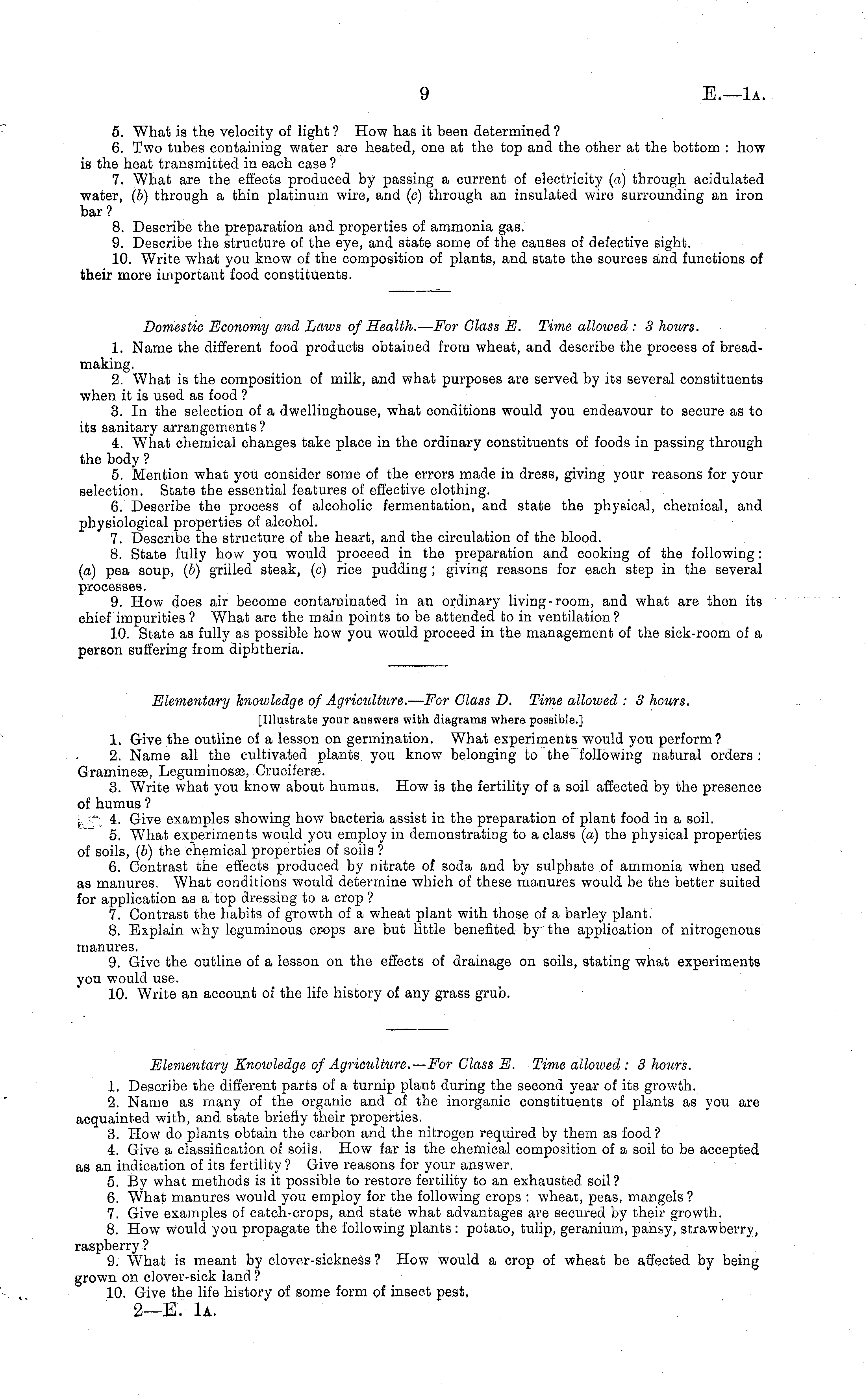 Domestic Economy and Laws of Health. — For Class E. Time allowed : 3 hours. 1. Name the different food products obtained from wheat, and describe the process of breadmaking. 2. What is the composition of milk, and what purposes are served by its several constituents when it is used as food ? 3. In the selection of a dwellinghouse, what conditions would you endeavour to secure as to its sanitary arrangements? 4. What chemical changes take place in the ordinary constituents of foods in passing through the body ? 5. Mention what you consider some of the errors made in dress, giving your reasons for your selection. State the essential features of effective clothing. 6. Describe the process of alcoholic fermentation, and state the physical, chemical, and physiological properties of alcohol. 7. Describe the structure of the heart, and the circulation of the blood. 8. State fully how you would proceed in the preparation and cooking of the following: (a) pea soup, (b) grilled steak, (c) rice pudding ; giving reasons for each step in the several processes. 9. How does air become contaminated in an ordinary living-room, and what are then its chief impurities ? What are the main points to be attended to in ventilation? 10. State as fully as possible how you would proceed in the management of the sick-room of a person suffering from diphtheria.