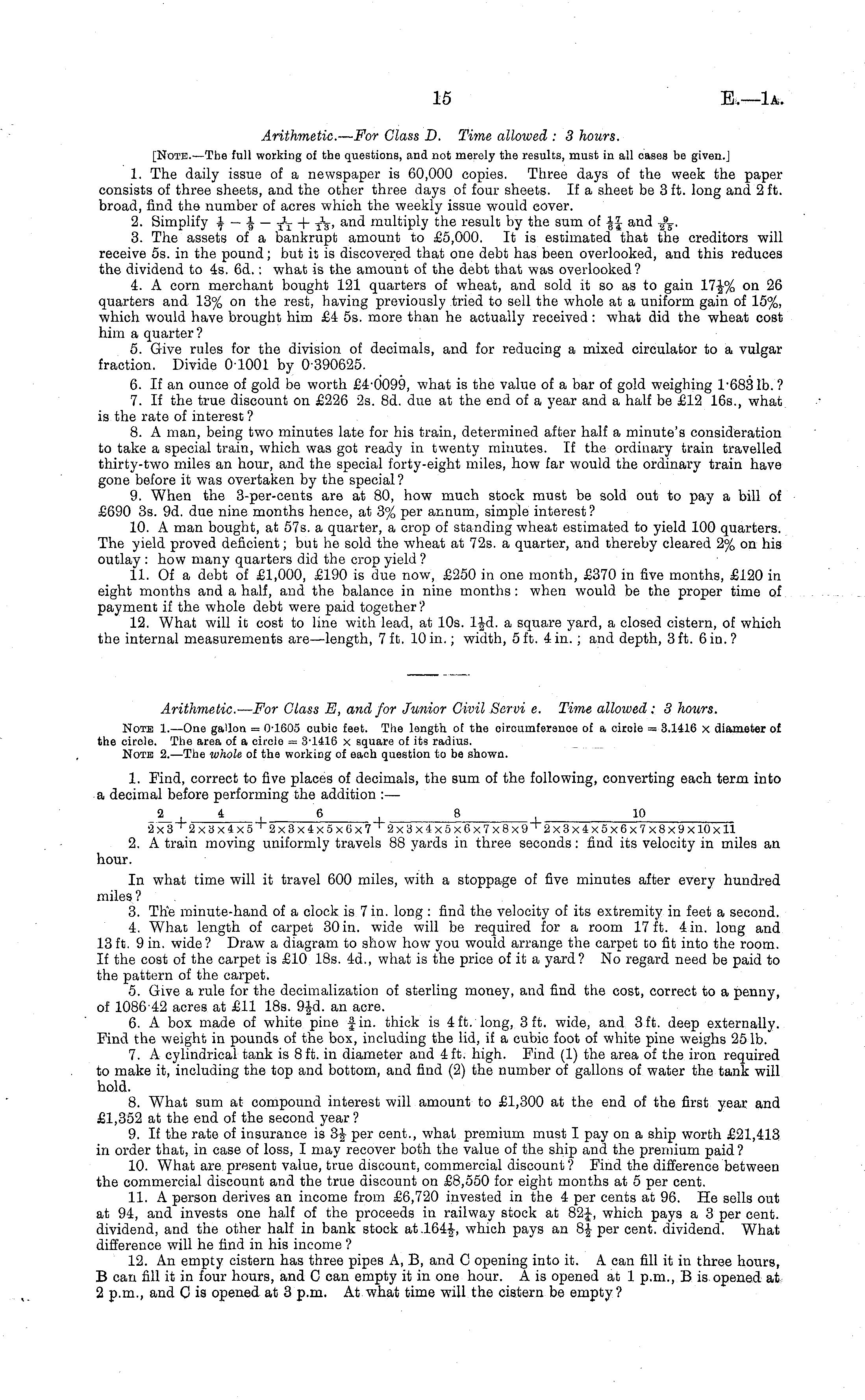 Arithmetic. — For Class E, and for Junior Civil Sarvi c. Time allowed : 3 hours. Note I.—One gallon = 0-1605 cubic feet. The length of the circumference of a cirole = 3.1416 x diameter of the circle. The area of a circle = 3-1416 x square of its radius. Note 2. —The whole of the working of each question to be shown. 1. Find, correct to five places of decimals, the sum of the following, converting each term into a decimal before performing the addition : — _«L.l * + 5 + 8 + i° 2 x3 T 2x3x4x5 T 2x3x4xsxox7 T 2x3x4xsx6x7xBx9 T 2x3x4xsx6x7xBx 9xloxll 2. A train moving uniformly travels 88 yards in three seconds: find its velocity in miles an hour. In what time will it travel 600 miles, with a stoppage of five minutes after every hundred miles ? 3. The minute-hand of a clock is 7 in. long : find the velocity of its extremity in feet a second. 4. What length of carpet 30 in. wide will be required for a room 17 ft. 4 in. long and 13 ft. 9 in. wide ? Draw a diagram to show how you would arrange the carpet to fit into the room. If the cost of the carpet is £10 18s. 4d., what is the price of it a yard? No regard need be paid to the pattern of the carpet. 5. Give a rule for the decimalization of sterling money, and find the cost, correct to a penny, of 108642 acres at £11 18s. 9fd. an acre. 6. A box made of white pine fin. thick is 4ft. long, 3ft. wide, and 3ft. deep externally. Find the weight in pounds of the box, including the lid, if a cubic foot of white pine weighs 251b. 7. A cylindrical tank is 8 ft. in diameter and 4 ft. high. Find (1) the area of the iron required to make it, including the top and bottom, and find (2) the number of gallons of water the tank will hold. 8. What sum at compound interest will amount to £1,300 at the end of the first year and £1,352 at the end of the second year ? 9. If the rate of insurance is 3|- per cent., what premium must I pay on a ship worth £21,413 in order that, in case of loss, I may recover both the value of the ship and the premium paid? 10. What are present value, true discount, commercial discount ? Find the difference between the commercial discount and the true discount on £8,550 for eight months at 5 per cent. 11. A person derives an income from £6,720 invested in the 4 per cents at 96. He sells out at 94, and invests one half of the proceeds in railway stock at 82-J-, which pays a 3 per cent, dividend, and the other half in bank stock at.164-|-, which pays an 8J per cent, dividend. What difference will he find in his income ? 12. An empty cistern has three pipes A, B, and C opening into it. A can fill it in three hours, B can fill it in four hours, and C can empty it in one hour. Ais opened at 1 p.m., Bis opened at 2 p.m., and Cis opened at 3 p.m. At what time will the cistern be empty?