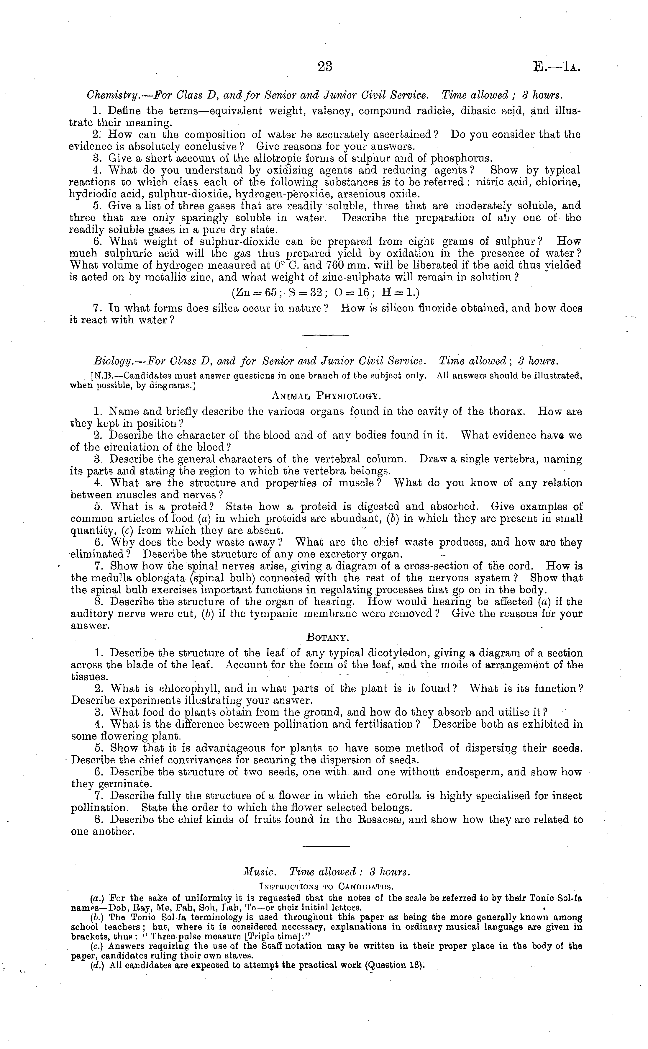 Chemistry. — For Class D, and for Senior and Junior Civil Service. Time allowed ; 3 hours. 1. Define the terms —equivalent weight, valency, compound radicle, dibasic acid, and illustrate their meaning. 2. How can the composition of water be accurately ascertained? Do you consider that the evidence is absolutely conclusive ? Give reasons for your answers. 3. Give a short account of the allotropic forms of sulphur and of phosphorus. 4. What do you understand by oxidizing agents and reducing agents ? Show by typical reactions to which class each of the following substances is to be referred : nitric acid, chlorine, hydriodic acid, sulphur-dioxide, hydrogen-peroxide, arsenious oxide. 5. Give a list of three gases that are readily soluble, three that are moderately soluble, and three that are only sparingly soluble in water. Describe the preparation of any one of the readily soluble gases in a pure dry state. 6. What weight of sulphur-dioxide can be prepared from eight grams of sulphur ? How much sulphuric acid will the gas thus prepared yield by oxidation in the presence of water ? What volume of hydrogen measured at 0° 0. and 760 mm. will be liberated if the acid thus yielded is acted on by metallic zinc, and what weight of zinc-sulphate will remain in solution ? (Zn = 65; S = 32 ; 0 = 16; H=l.) 7. In what forms does silica occur in nature? How is silicon fluoride obtained, and how does it react with water ?