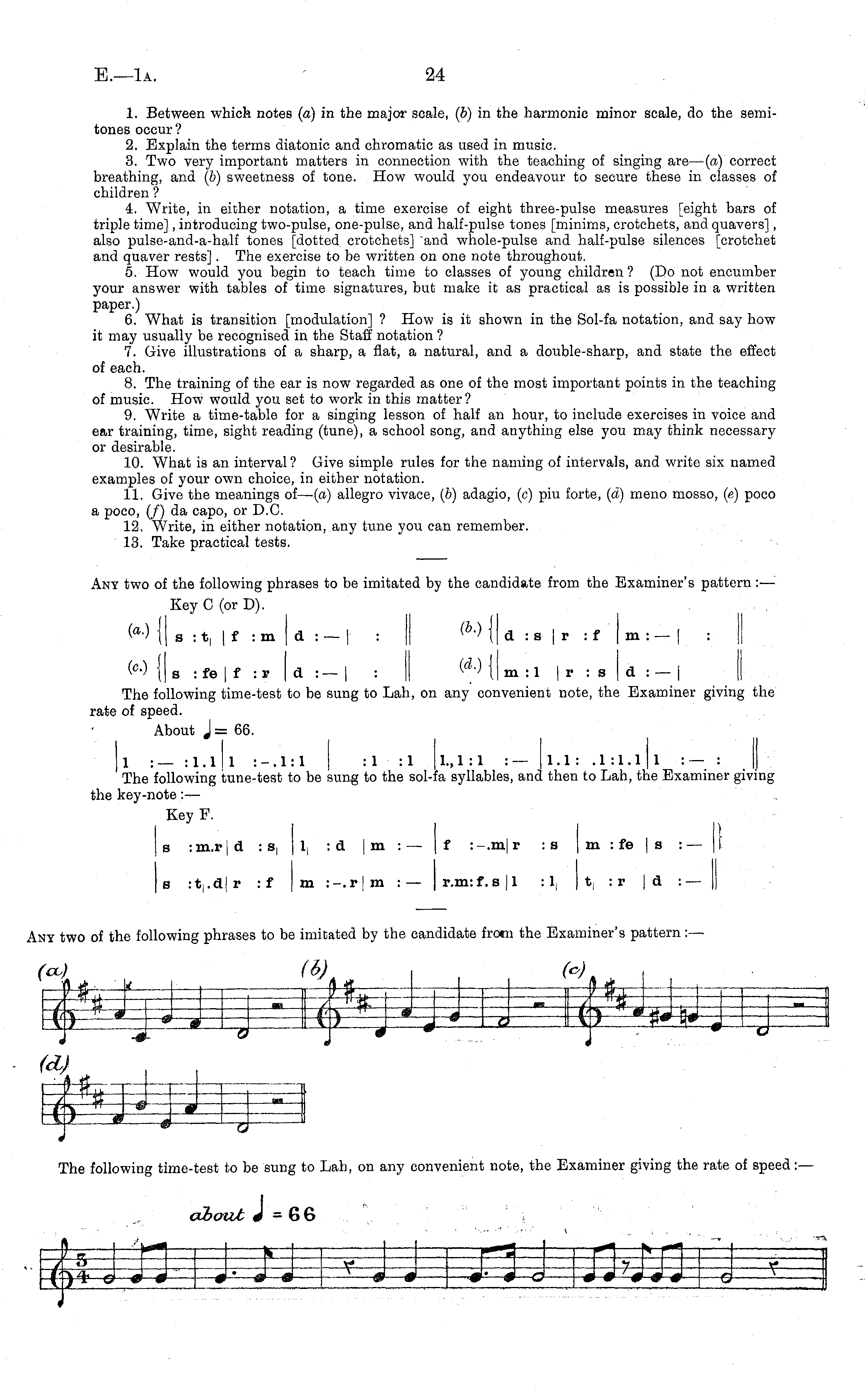 1. Between which notes (a) in the major scale, (b) in the harmonic minor scale, do the semitones occur ? 2. Explain the terms diatonic and chromatic as used in music. 3. Two very important matters in connection with the teaching of singing are — (a) correct breathing, and (b) sweetness of tone. How would you endeavour to secure these in classes of children ? 4. Write, in either notation, a time exercise of eight three-pulse measures [eight bars of triple time], introducing two-pulse, one-pulse, and half-pulse tones [minims, crotchets, and quavers], also pulse-and-a-half tones [dotted crotchets] "and whole-pulse and half-pulse silences [crotchet and quaver rests] . The exercise to be written on one note throughout. 5. How would you begin to teach time to classes of young children ? (Do not encumber your answer with tables of time signatures, but make it as practical as is possible in a written paper.) 6. What is transition [modulation] ? How is it shown in the Sol-fa notation, and say how it may usually be recognised in the Staff notation ? 7. Give illustrations of a sharp, a flat, a natural, and a double-sharp, and state the effect of each. 8. The training of the ear is now regarded as one of the most important points in the teaching of music. How would you set to work in this matter? 9. Write a time-table for a singing lesson of half an hour, to include exercises in voice and ear training, time, sight reading (tune), a school song, and anything else you may think necessary or desirable. 10. What is an interval ? Give simple rules for the naming of intervals, and write six named examples of your own choice, in either notation. 11. Give the meanings of— (a) allegro vivace, (b) adagio, (c) piu forte, (d) meno mosso, (c) poco a poco, (/) da capo, or D.C. 12. Write, in either notation, any tune you can remember. 13. Take practical tests.