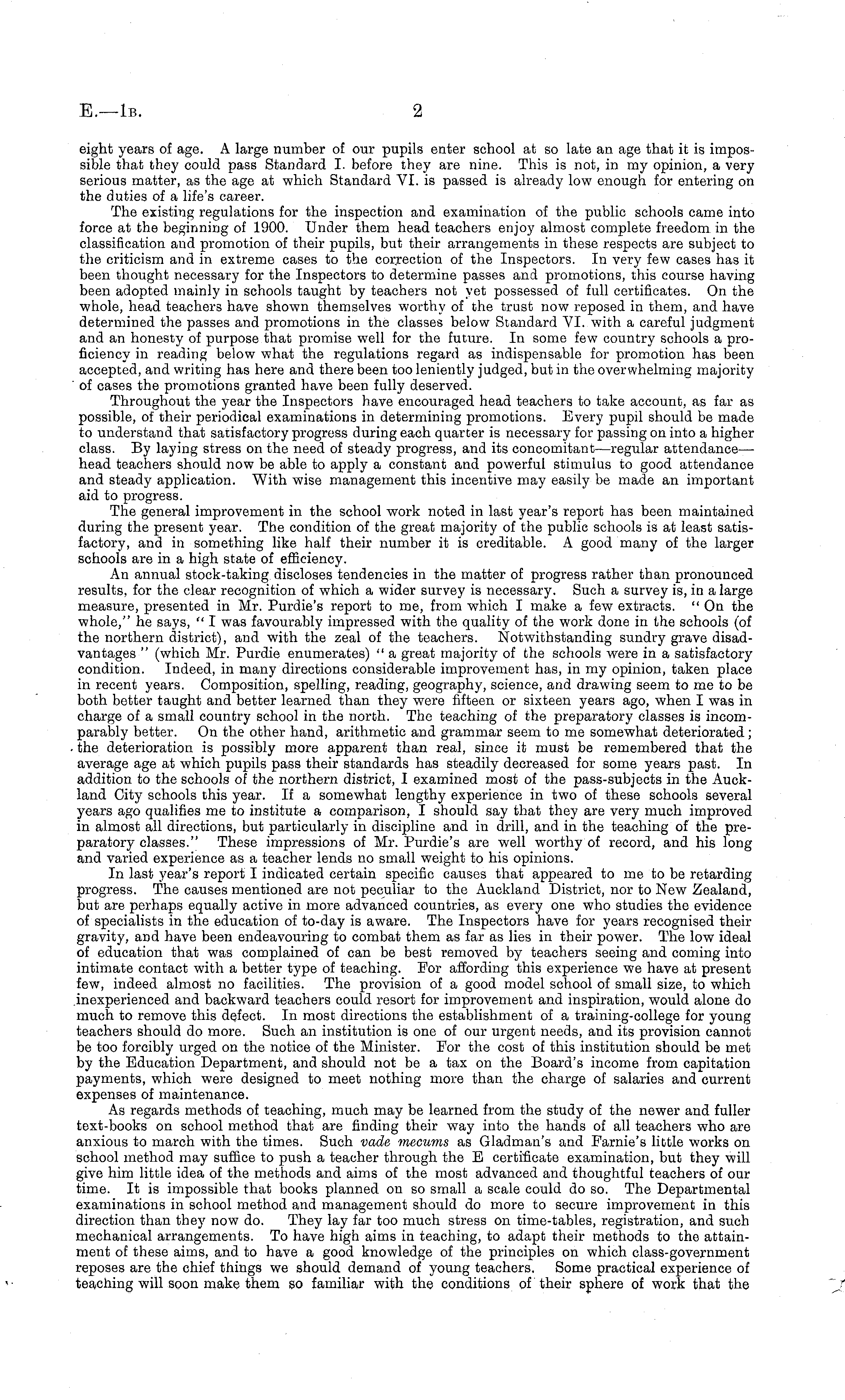 eight years of age. A large number of our pupils enter school at so late an age that it is impossible that they could pass Standard I. before they are nine. This is not, in my opinion, a very serious matter, as the age at which Standard VI. is passed is already low enough for entering on the duties of a life's career. The existing regulations for the inspection and examination of the public schools came into force at the beginning of 1900. Under them head teachers enjoy almost complete freedom in the classification and promotion of their pupils, but their arrangements in these respects are subject to the criticism and in extreme cases to the correction of the Inspectors. In very few cases has it been thought necessary for the Inspectors to determine passes and promotions, this course having been adopted mainly in schools taught by teachers not yet possessed of full certificates. On the whole, head teachers have shown themselves worthy of the trust now reposed in them, and have determined the passes and promotions in the classes below Standard VI. with a careful judgment and an honesty of purpose that promise well for the future. In some few country schools a proficiency in reading below what the regulations regard as indispensable for promotion has been accepted, and writing has here and there been too leniently judged, but in the overwhelming majority of cases the promotions granted have been fully deserved. Throughout the year the Inspectors have encouraged head teachers to take account, as far as possible, of their periodical examinations in determining promotions. Every pupil should be made to understand that satisfactory progress during each quarter is necessary for passing on into a higher class. By laying stress on the need of steady progress, and its concomitant —regular attendance— head teachers should now be able to apply a constant and powerful stimulus to good attendance and steady application. With wise management this incentive may easily be made an important aid to progress. The general improvement in the school work noted in last year's report has been maintained during the present year. The condition of the great majority of the public schools is at least satisfactory, and in something like half their number it is creditable. A good many of the larger schools are in a high state of efficiency. An annual stock-taking discloses tendencies in the matter of progress rather than pronounced results, for the clear recognition of which a wider survey is necessary. Such a survey is, in a large measure, presented in Mr. Purdie's report to me, from which I make a few extracts. "On the whole," he says, " I was favourably impressed with the quality of the work done in the schools (of the northern district), and with the zeal of the teachers. Notwithstanding sundry grave disadvantages " (which Mr. Purdie enumerates) " a great majority of the schools were in a satisfactory condition. Indeed, in many directions considerable improvement has, in my opinion, taken place in recent years. Composition, spelling, reading, geography, science, and drawing seem to me to be both better taught and better learned than they were fifteen or sixteen years ago, when I was in charge of a small country school in the north. The teaching of the preparatory classes is incomparably better. On the other hand, arithmetic and grammar seem to me somewhat deteriorated; the deterioration is possibly more apparent than real, since it must be remembered that the average age at which pupils pass their standards has steadily decreased for some years past. In addition to the schools of the northern district, I examined most of the pass-subjects in the Auckland City schools this year. If a somewhat lengthy experience in two of these schools several years ago qualifies me to institute a comparison, I should say that they are very much improved in almost all directions, but particularly in discipline and in drill, and in the teaching of the preparatory classes." These impressions of Mr. Purdie's are well worthy of record, and his long and varied experience as a teacher lends no small weight to his opinions. In last year's report I indicated certain specific causes that appeared to me to be retarding progress. The causes mentioned are not peculiar to the Auckland District, nor to New Zealand, but are perhaps equally active in more advanced countries, as every one who studies the evidence of specialists in the education of to-day is aware. The Inspectors have for years recognised their gravity, and have been endeavouring to combat them as far as lies in their power. The low ideal of education that was complained of can be best removed by teachers seeing and coming into intimate contact with a better type of teaching. For affording this experience we have at present few, indeed almost no facilities. The provision of a good model school of small size, to which inexperienced and backward teachers could resort for improvement and inspiration, would alone do much to remove this defect. In most directions the establishment of a training-college for young teachers should do more. Such an institution is one of our urgent needs, and its provision cannot be too forcibly urged on the notice of the Minister. For the cost of this institution should be met by the Education Department, and should not be a tax on the Board's income from capitation payments, which were designed to meet nothing more than the charge of salaries and current expenses of maintenance. As regards methods of teaching, much may be learned from the study of the newer and fuller text-books on school method that are finding their way into the hands of all teachers who are anxious to march with the times. Such vade mecums as Gladman's and Farnie's little works on school method may suffice to push a teacher through the E certificate examination, but they will give him little idea of the methods and aims of the most advanced and thoughtful teachers of our time. It is i