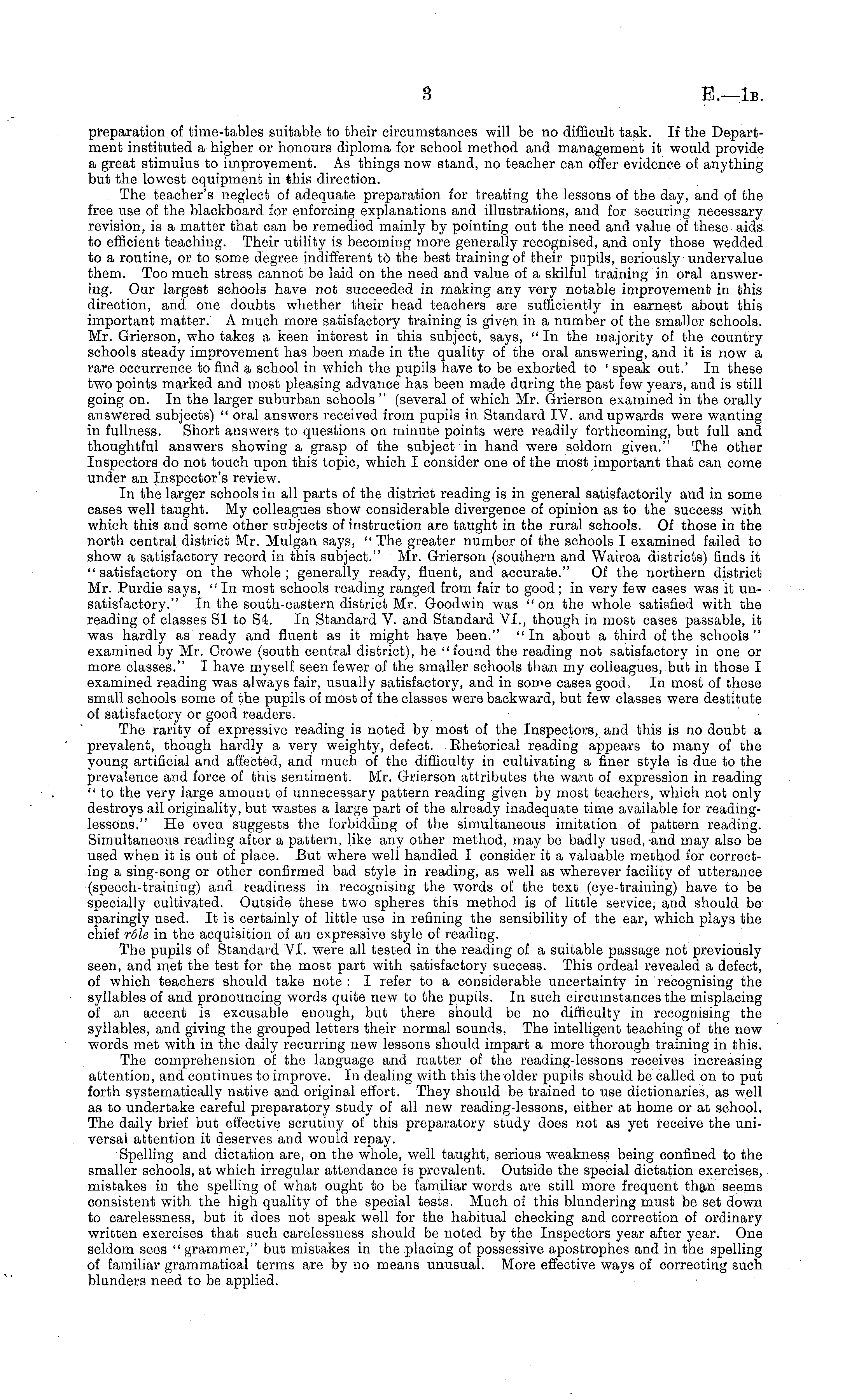 preparation of time-tables suitable to their circumstances will be no difficult task. If the Department instituted a higher or honours diploma for school method and management it would provide a great stimulus to improvement. As things now stand, no teacher can offer evidence of anything but the lowest equipment in this direction. The teacher's neglect of adequate preparation for treating the lessons of the day, and of the free use of the blackboard for enforcing explanations and illustrations, and for securing necessary revision, is a matter that can be remedied mainly by pointing out the need and value of these aids to efficient teaching. Their utility is becoming more generally recognised, and only those wedded to a routine, or to some degree indifferent to the best training of their pupils, seriously undervalue them. Too much stress cannot be laid on the need and value of a skilful training in oral answering. Our largest schools have not succeeded in making any very notable improvement in this direction, and one doubts whether their head teachers are sufficiently in earnest about this important matter. A much more satisfactory training is given in a number of the smaller schools. Mr. Grierson, who takes a keen interest in this subject, says, "In the majority of the country schools steady improvement has been made in the quality of the oral answering, and it is now a rare occurrence to find a school in which the pupils have to be exhorted to ' speak out.' In these two points marked and most pleasing advance has been made during the past few years, and is still going on. In the larger suburban schools " (several of which Mr. Grierson examined in the orally answered subjects) " oral answers received from pupils in Standard IV. and upwards were wanting in fullness. Short answers to questions on minute points were readily forthcoming, but full and thoughtful answers showing a grasp of the subject in hand were seldom given." The other Inspectors do not touch upon this topic, which I consider one of the most important that can come under an Inspector's review. In the larger schools in all parts of the district reading is in general satisfactorily and in some cases well taught. My colleagues show considerable divergence of opinion as to the success with which this and some other subjects of instruction are taught in the rural schools. Of those in the north central district Mr. Mulgan says, " The greater number of the schools I examined failed to show a satisfactory record in this subject." Mr. Grierson (southern and Wairoa districts) finds it "satisfactory on the whole; generally ready, fluent, and accurate." Of the northern district Mr. Purdie says, "In most schools reading ranged from fair to good; in very few cases was it unsatisfactory." In the south-eastern district Mr. Goodwin was "on the whole satisfied with the reading of classes SI to S4. In Standard V. and Standard VI., though in most cases passable, it was hardly as ready and fluent as it might have been." "In about a third of the schools" examined by Mr. Crowe (south central district), he "found the reading not satisfactory in one or more classes." I have myself seen fewer of the smaller schools than my colleagues, but in those I examined reading was always fair, usually satisfactory, and in some cases good, In most of these small schools some of the pupils of most of the classes were backward, but few classes were destitute of satisfactory or good readers. The rarity of expressive reading is noted by most of the Inspectors, and this is no doubt a prevalent, though hardly a very weighty, defect. Rhetorical reading appears to many of the young artificial and affected, and much of the difficulty in cultivating a finer style is due to the prevalence and force of this sentiment. Mr. Grierson attributes the want of expression in reading " to the very large amount of unnecessary pattern reading given by most teachers, which not only destroys all originality, but wastes a large part of the already inadequate time available for readinglessons." He even suggests the forbidding of the simultaneous imitation of pattern reading. Simultaneous reading after a pattern, like any other method, may be badly used, and may also be used when it is out of place. But where well handled I consider it a valuable method for correcting a sing-song or other confirmed bad style in reading, as well as wherever facility of utterance (speech-training) and readiness in recognising the words of the text (eye-training) have to be specially cultivated. Outside these two spheres this method is of little service, and should be sparingly used. It is certainly of little use in refining the sensibility of the ear, which plays the chief role in the acquisition of an expressive style of reading. The pupils of Standard VI. were all tested in the reading of a suitable passage not previously seen, and met the test for the most part with satisfactory success. This ordeal revealed a defect, of which teachers should take note : I refer to a considerable uncertainty in recognising the syllables of and pronouncing words quite new to the pupils. In such circumstances the misplacing of an accent is excusable enough, but there should be no difficulty in recognising the syllables, and giving the grouped letters their normal sounds. The intelligent teaching of the new words met with in the daily recurring new lessons should impart a more thorough training in this. The comprehension of the language and matter of the reading-lessons receives increasing attention, and continues to improve. In dealing with this the older pupils should be called on to put forth systematically native and original effort. They should be trained to use dictionaries, as well as to undertake careful preparatory study of all new reading-lessons, either at home or at school. The daily brief but effective scrutiny of this preparatory study does not as yet receive the universal attention it deserves and would repay