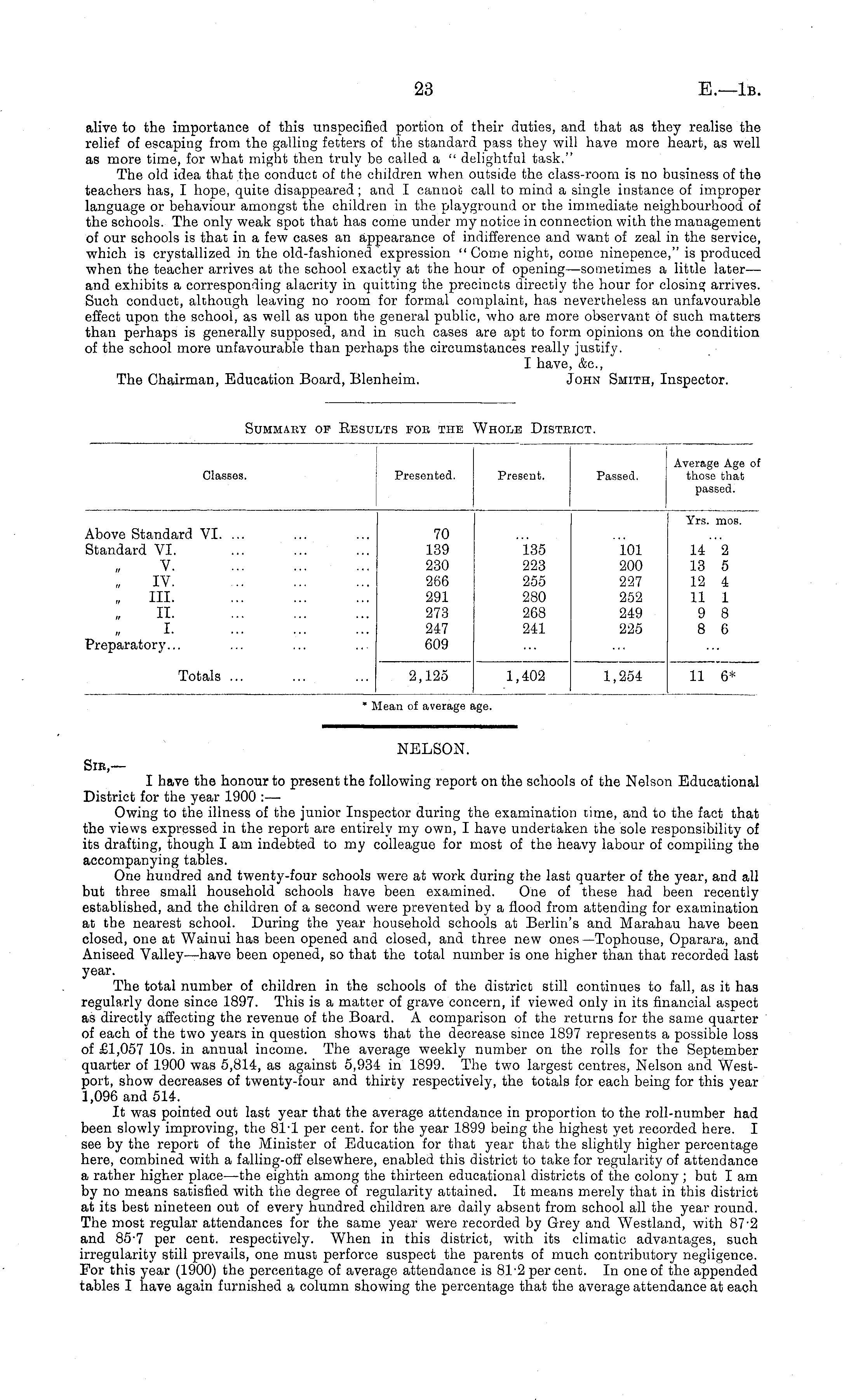 NELSON. SlE,— I have the honour to present the following report on the schools of the Nelson Educational District for the year 1900 : — Owing to the illness of the junior Inspector during the examination time, and to the fact that the views expressed in the report are entirely my own, I have undertaken the sole responsibility of its drafting, though I am indebted to my colleague for most of the heavy labour of compiling the accompanying tables. One hundred and twenty-four schools were at work during the last quarter of the year, and all but three small household schools have been examined. One of these had been recently established, and the children of a second were prevented by a flood from attending for examination at the nearest school. During the year household schools at Berlin's and Marahau have been closed, one at Wainui has been opened and closed, and three new ones —Tophouse, Oparara, and Aniseed Valley—have been opened, so that the total number is one higher than that recorded last year. The total number of children in the schools of the district still continues to fall, as it has regularly done since 1897. This is a matter of grave concern, if viewed only in its financial aspect as directly affecting the revenue of the Board. A comparison of the returns for the same quarter of each of the two years in question shows that the decrease since 1897 represents a possible loss of £1,057 10s. in annual income. The average weekly number on the rolls for the September quarter of 1900 was 5,814, as against 5,934 in 1899. The two largest centres, Nelson and Westport, show decreases of twenty-four and thirty respectively, the totals for each being for this year 1,096 and 514. It was pointed out last year that the average attendance in proportion to the roll-number had been slowly improving, the 81-1 per cent, for the year 1899 being the highest yet recorded here. I see by the report of the Minister of Education for that year that the slightly higher percentage here, combined with a falling-off elsewhere, enabled this district to take for regularity of attendance a rather higher place—the eighth among the thirteen educational districts of the colony; but lam by no means satisfied with the degree of regularity attained. It means merely that in this district at its best nineteen out of every hundred children are daily absent from school all the year round. The most regular attendances for the same year were recorded by Grey and Westland, with 872 and 85-7 per cent, respectively. When in this district, with its climatic advantages, such irregularity still prevails, one must perforce suspect the parents of much contributory negligence. For this year (1900) the percentage of average attendance is 81 -2 per cent. In one of the appended tables I have again furnished a column showing the percentage that the average attendance at each