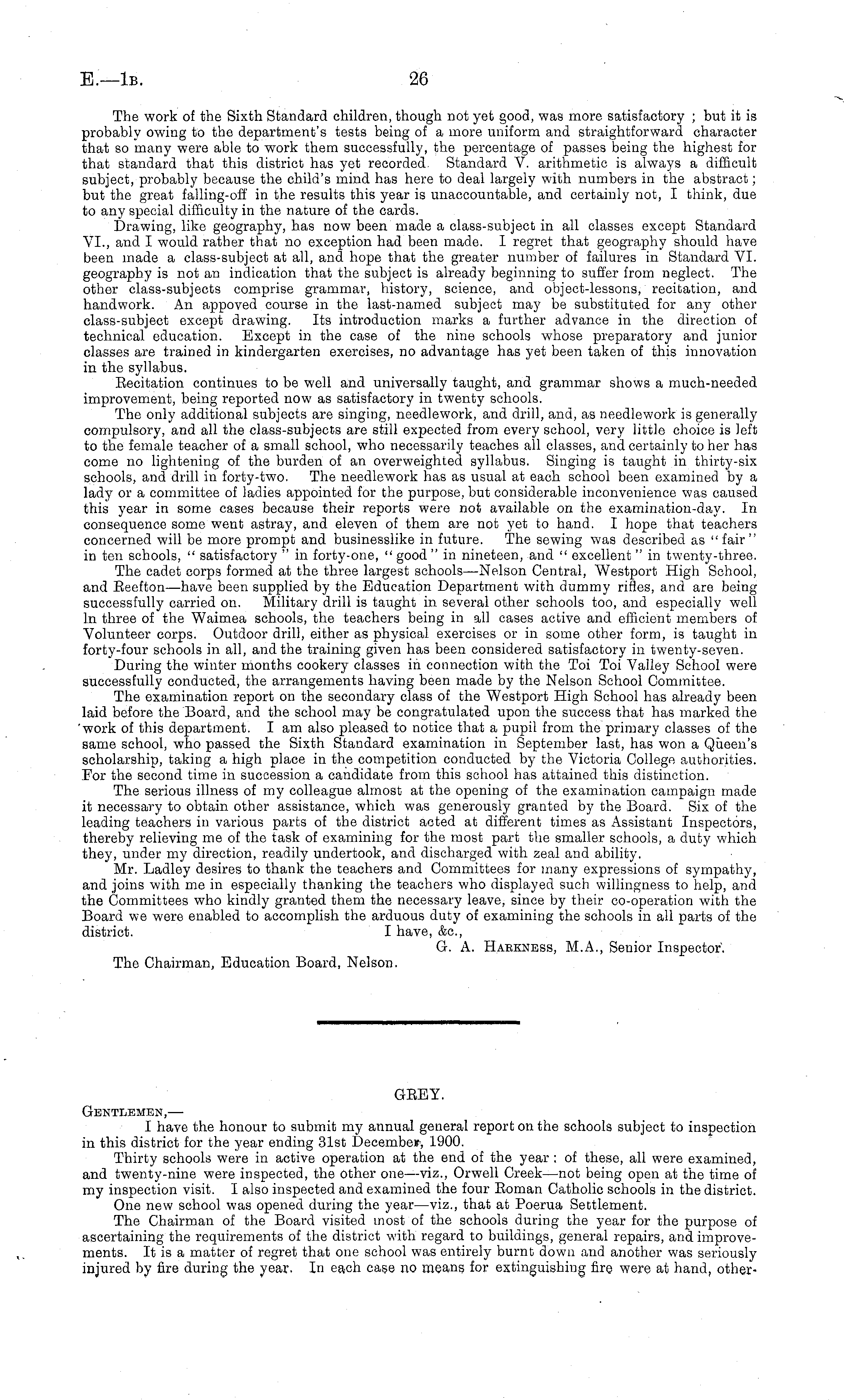 GEEY. Gentlemen, — I have the honour to submit my annual general report on the schools subject to insnection in this district for the year ending 31st December, 1900. Thirty schools were in active operation at the end of the year : of these, all were examined, and twenty-nine were inspected, the other one —viz., Orwell Creek—not being open at the time of my inspection visit. I also inspected and examined the four Eoman Catholic schools in the district. One new school was opened during the year —viz., that at Poerua Settlement. The Chairman of the Board visited most of the schools during the year for the purpose of ascertaining the requirements of the district with regard to buildings, general repairs, and improvements. It is a matter of regret that one school was entirely burnt down and another was seriously injured by fire during the year. In each case no means for extinguishing fir© were at hand, other-