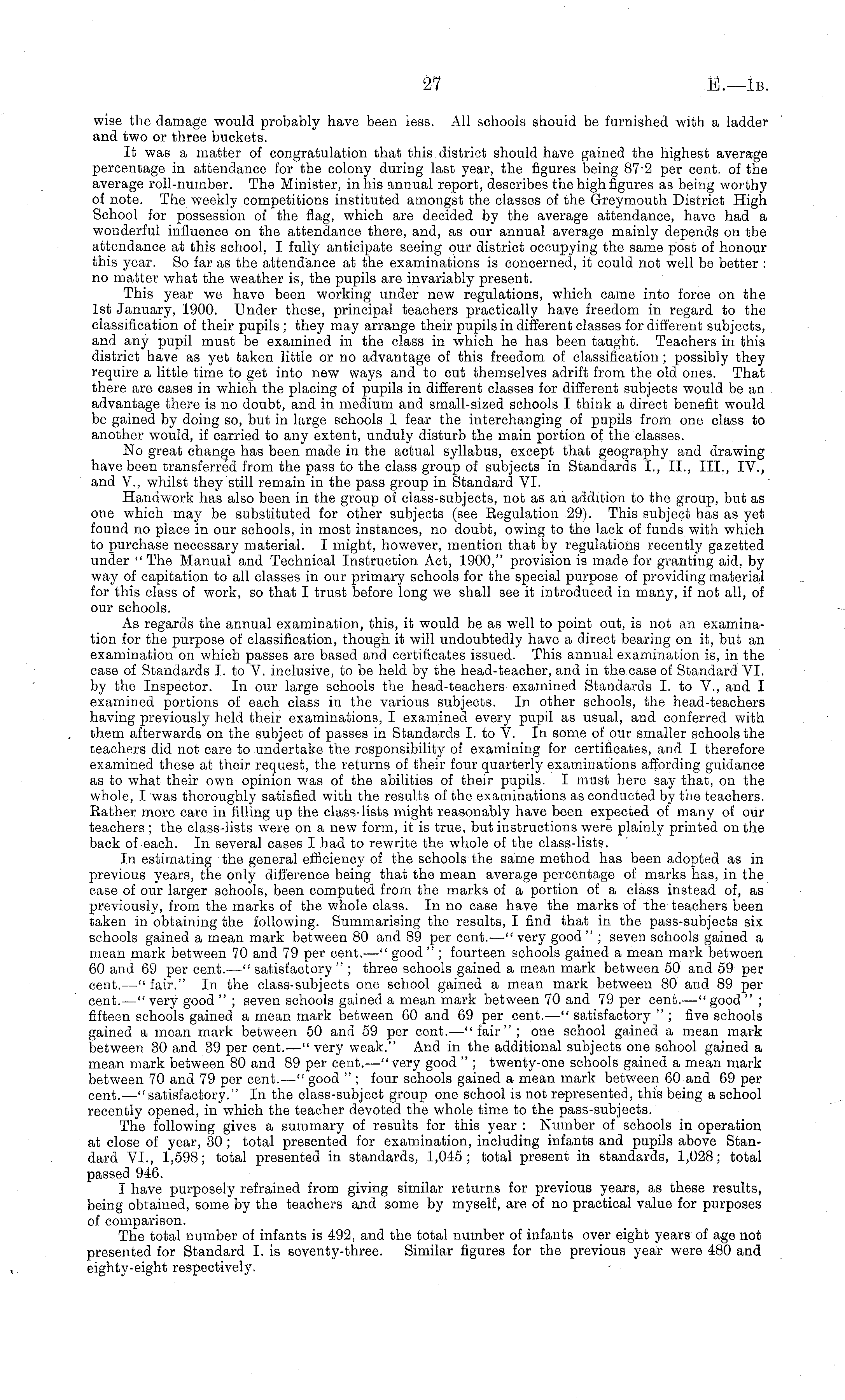 wise the damage would probably have been less. All schools should be furnished with a ladder and two or three buckets. It was a matter of congratulation that this district should have gained the highest average percentage in attendance for the colony during last year, the figures being 872 per cent, of the average roll-number. The Minister, in his annual report, describes the high figures as being worthy of note. The weekly competitions instituted amongst the classes of the Greymouth District High School for possession of the flag, which are decided by the average attendance, have had a wonderful influence on the attendance there, and, as our annual average mainly depends on the attendance at this school, I fully anticipate seeing our district occupying the same post of honour this year. So far as the attendance at the examinations is concerned, it could not well be better : no matter what the weather is, the pupils are invariably present. This year we have been working under new regulations, which came into force on the Ist January, 1900. Under these, principal teachers practically have freedom in regard to the classification of their pupils ; they may arrange their pupils in different classes for different subjects, and any pupil must be examined in the class in which he has been taught. Teachers in this district have as yet taken little or no advantage of this freedom of classification; possibly they require a little time to get into new ways and to cut themselves adrift from the old ones. That there are cases in which the placing of pupils in different classes for different subjects would be an advantage there is no doubt, and in medium and small-sized schools I think a direct benefit would be gained by doing so, but in large schools I fear the interchanging of pupils from one class to another would, if carried to any extent, unduly disturb the main portion of the classes. No great change has been made in the actual syllabus, except that geography and drawing have been transferred from the pass to the class group of subjects in Standards 1., 11., 111., IV., and V., whilst they still remain in the pass group in Standard VI. Handwork has also been in the group of class-subjects, not as an addition to the group, but as one which may be substituted for other subjects (see Eegulation 29). This subject has as yet found no place in our schools, in most instances, no doubt, owing to the lack of funds with which to purchase necessary material. I might, however, mention that by regulations recently gazetted under " The Manual and Technical Instruction Act, 1900," provision is made for granting aid, by way of capitation to all classes in our primary schools for the special purpose of providing material for this class of work, so that I trust before long we shall see it introduced in many, if not all, of our schools. As regards the annual examination, this, it would be as well to point out, is not an examination for the purpose of classification, though it will undoubtedly have a direct bearing on it, but an examination on which passes are based and certificates issued. This annual examination is, in the case of Standards I. to V. inclusive, to be held by the head-teacher, and in the case of Standard VI. by the Inspector. In our large schools the head-teachers examined Standards I. to V., and I examined portions of each class in the various subjects. In other schools, the head-teachers having previously held their examinations, I examined every pupil as usual, and conferred with them afterwards on the subject of passes in Standards I. to V. In some of our smaller schools the teachers did not care to undertake the responsibility of examining for certificates, and I therefore examined these at their request, the returns of their four quarterly examinations affording guidance as to what their own opinion was of the abilities of their pupils. I must here say that, on the whole, I was thoroughly satisfied with the results of the examinations as conducted by the teachers. Bather more care in filling up the class-lists might reasonably have been expected of many of our teachers; the class-lists were on a new form, it is true, but instructions were plainly printed on the back of-each. In several cases I had to rewrite the whole of the class-lists. In estimating the general efficiency of the schools the same method has been adopted as in previous years, the only difference being that the mean average percentage of marks has, in the case of our larger schools, been computed from the marks of a portion of a class instead of, as previously, from the marks of the whole class. In no case have the marks of the teachers been taken in obtaining the following. Summarising the results, I find that in the pass-subjects six schools gained a mean mark between. 80 and 89 per cent.—"very good" ; seven schools gained a mean mark between 70 and 79 per cent. —" good " ; fourteen schools gained a mean mark between 60 and 69 per cent.—" satisfactory " ; three schools gained a mean mark between 50 and 59 per cent.—" fair." In the class-subjects one school gained a mean mark between 80 and 89 per cent. —" very good " ; seven schools gained a mean mark between 70 and 79 per cent.—"good " ; fifteen schools gained a mean mark between 60 and 69 per cent.—" satisfactory " ; five schools gained a mean mark between 50 and 59 per cent.—"fair" ; one school gained a mean mark between 30 and 39 per cent. —" very weak." And in the additional subjects one school gained a mean mark between 80 and 89 per cent.—"very good " ; twenty-one schools gained a mean mark between 70 and 79 per cent.—" good " ; four schools gained a mean mark between 60 and 69 per cent.—"satisfactory." In the class-subject group one school is not represented, this being a school recently opened, in which the teacher devoted the whole time to the pass-subjects. The following gives a summary of results for this year : Number of schools in operati