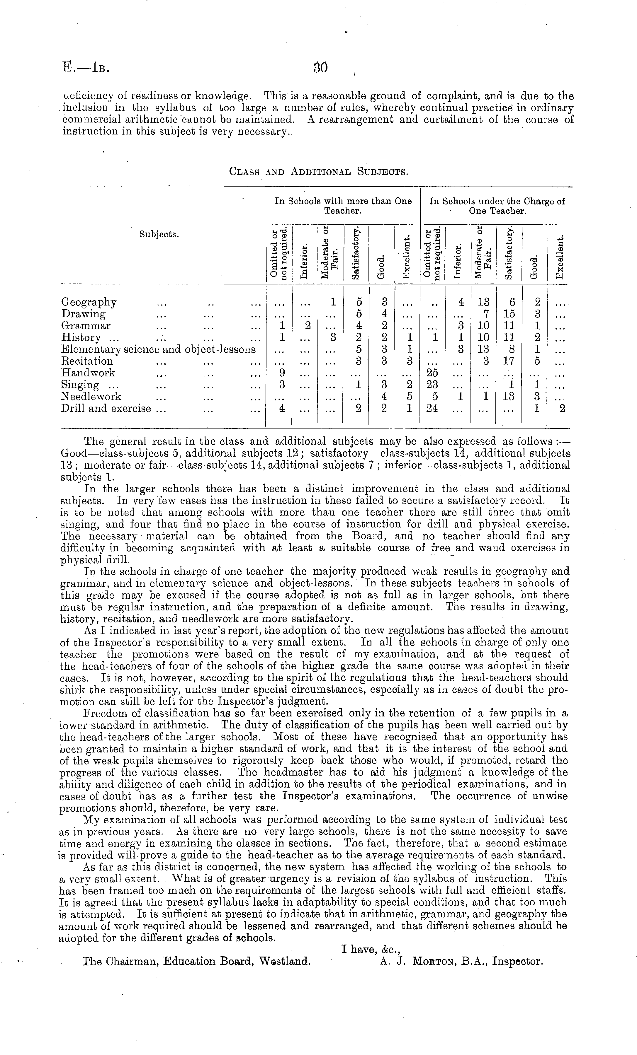 The general result in the class and additional subjects may be also expressed as follows : — Good—class-subjects 5, additional subjects 12 ; satisfactory—class-subjects 14, additional subjects 13 ; moderate or fair—class-subjects 14, additional subjects 7 ; inferior—class-subjects 1, additional subjects 1. In the larger schools there has been a distinct improvement in the class and additional subjects. In very few cases has the instruction in these failed to secure a satisfactory record. It is to be noted that among schools with more than one teacher there are still three that omit singing, and four that find no place in the course of instruction for drill and physical exercise. The necessary material can be obtained from the Board, and no teacher should find any difficulty in becoming acquainted with at least a suitable course of free and wand exercises in physical drill. In the schools in charge of one teacher the majority produced weak results in geography and grammar, and in elementary science and object-lessons. In these subjects teachers in schools of this grade may be excused if the course adopted is not as full as in larger schools, but there must be regular instruction, and the preparation of a definite amount. The results in drawing, history, recitation, and needlework are more satisfactory. As I indicated in last year's report, the adoption of the new regulations has affected the amount of the Inspector's responsibility to a very small extent. In all the schools in charge of only one teacher the promotions were based on the result of my examination, and at the request of the head-teachers of four of the schools of the higher grade the same course was adopted in their cases. It is not, however, according to the spirit of the regulations that the head-teachers should shirk the responsibility, unless under special circumstances, especially as in cases of doubt the promotion can still be left for the Inspector's judgment. Freedom of classification has so far been exercised only in the retention of a few pupils in a lower standard in arithmetic. The duty of classification of the pupils has been well carried out by the head-teachers of the larger schools. Most of these have recognised that an opportunity has been granted to maintain a higher standard of work, and that it is the interest of the school and of the weak pupils themselves to rigorously keep back those who would, if promoted, retard the progress of the various classes. The headmaster has to aid his judgment a knowledge of the ability and diligence of each child in addition to the results of the periodical examinations, and in cases of doubt has as a further test the Inspector's examinations. The occurrence of unwise promotions should, therefore, be very rare. My examination of all schools was performed according to the same system of individual test as in previous years. As there are no very large schools, there is not the same necessity to save time and energy in examining the classes in sections. The fact, therefore, that a second estimate is provided will prove a guide to the head-teacher as to the average requirements of each standard. As far as this district is concerned, the new system has affected the working of the schools to a very small extent. What is of greater urgency is a revision of the syllabus of instruction. This has been framed too much on the requirements of the largest schools with full and efficient staffs. It is agreed that the present syllabus lacks in adaptability to special conditions, and that too much is attempted. It is sufficient at present to indicate that in arithmetic, grammar, and geography the amount of work required should be lessened and rearranged, and that different schemes should be adopted for the different grades of schools. I have, &c, The Chairman, Education Board, Westland. A. J. Morton, 8.A., Inspector.