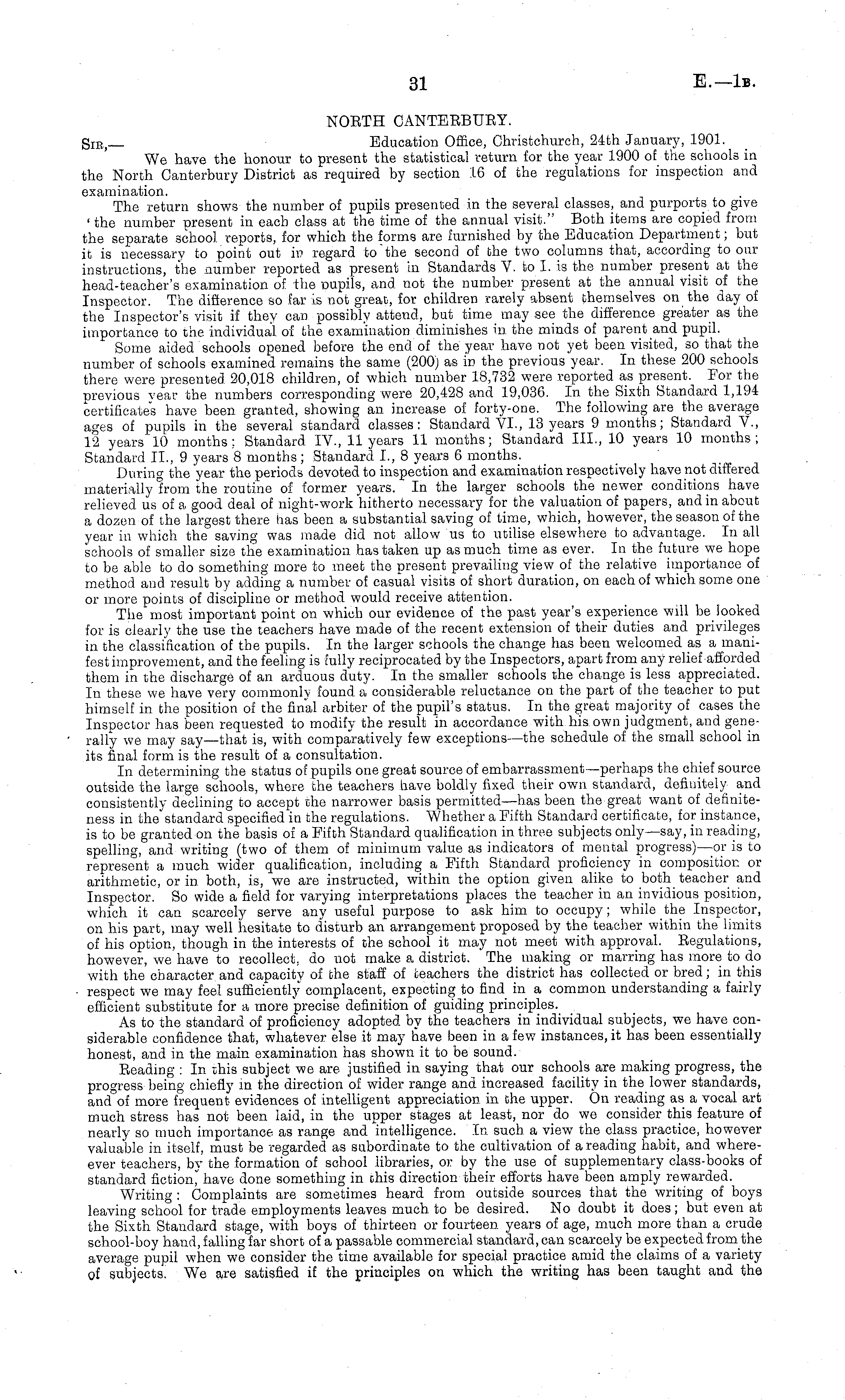 NOETH CANTERBURY. S IB) _ Education Office, Christchurch, 24th January, 1901. Wβ have the honour to present the statistical return for the year 1900 of the schools in the North Canterbury District as required by section 16 of the regulations for inspection and examination. The return shows the number of pupils presented in the several classes, and purports to give ' the number present in each class at the time of the annual visit." Both items are copied from the separate school reports, for which the forms are furnished by the Education Department; but it is necessary to point out i» regard to the second of the two columns that, according to oar instructions, the number reported as present in Standards V. to I. is the number present at the head-teacher's examination of the rrapils, and not the number present at the annual visit of the Inspector. The difference so far is not great, for children rarely absent themselves on the day of the Inspector's visit if they can possibly attend, but time may see the difference greater as the importance to the individual of the examination diminishes in. the minds of parent and pupil. Some aided schools opened before the end of the year have not yet been visited, so that the number of schools examined remains the same (200) as in the previous year. In these 200 schools there were presented 20,018 children, of which number 18,732 were reported as present. For the previous year the numbers corresponding were 20,428 and 19,036. In the Sixth Standard 1,194 certificates have been granted, showing an increase of forty-one. The following are the average ages of pupils in the several standard classes: Standard VI., 13 years 9 months; Standard V., 12 years 10 months; Standard IV., 11 years 11 months; Standard 111., 10 years 10 months; Standard 11., 9 years 8 months; Standard 1., 8 years 6 months. During the year the periods devoted to inspection and examination respectively have not differed materially Irom the routine of former years. In the larger schools the newer conditions have relieved us of a good deal of night-work hitherto necessary for the valuation of papers, and in about a dozen of the largest there has been a substantial saving of time, which, however, the season of the year in which the saving was made did not allow us to utilise elsewhere to advantage. In all schools of smaller size the examination has taken up as much time as ever. In the future we hope to be able to do something more to meet the present prevailing view of the relative importance of method and result by adding a number of casual visits of short duration, on each of which some one or more points of discipline or method would receive attention. The most important point on which our evidence of the past year's experience will be looked for is clearly the use the teachers have made of the recent extension of their duties and privileges in the classification of the pupils. In the larger schools the change has been welcomed as amanifest improvement, and the feeling is fully reciprocated by the Inspectors, apart from any relief afforded them in the discharge of an arduous duty. In the smaller schools the change is less appreciated. In these we have very commonly found a considerable reluctance on the part of the teacher to put himself in the position of the final arbiter of the pupil's status. In the great majority of cases the Inspector has been requested to modify the result in accordance with his own judgment, and generally we may say —that is, with comparatively few exceptions—the schedule of the small school in its final form is the result of a consultation. In determining the status of pupils one great source of embarrassment —perhaps the chief source outside the large schools, where the teachers have boldly fixed their own standard, definitely and consistently declining to accept the narrower basis permitted —has been the great want of definiteness in the"standard specified in the regulations. Whether a Fifth Standard certificate, for instance, is to be granted on the basis of a Fifth Standard qualification in three subjects only—say, in reading, spelling, and writing (two of them of minimum value as indicators of mental progress)—or is to represent a much wider qualification, including a Fifth Standard proficiency in composition or arithmetic, or in both, is, we are instructed, within the option given alike to both teacher and Inspector. So wide a field for varying interpretations places the teacher in an invidious position, which it can scarcely serve any useful purpose to ask him to occupy; while the Inspector, on his part, may well hesitate to disturb an arrangement proposed by the teacher within the limits of his option, though in the interests of the school it may not meet with approval. Regulations, however, we have to recollect, do not make a district. The making or marring has more to do with the character and capacity of the staff of teachers the district has collected or bred; in this respect we may feel sufficiently complacent, expecting to find in a common understanding a fairly efficient substitute for a more precise definition of guiding principles. As to the standard of proficiency adopted by the teachers in individual subjects, we have considerable confidence that, whatever else it may have been in a few instances, it has been essentially honest, and in the main examination has shown it to be sound. Reading : In this subject we are justified in saying that our schools are making progress, the progress being chiefly in the direction of wider range and increased facility in the lower standards, and of more frequent evidences of intelligent appreciation in the upper. On reading as a vocal art much stress has not been laid, in the upper stages at least, nor do we consider this feature of nearly so much importance as range and intelligence. In such a view the class practice, however valuable in itself, must be regarded as subordinate to the cultivation 