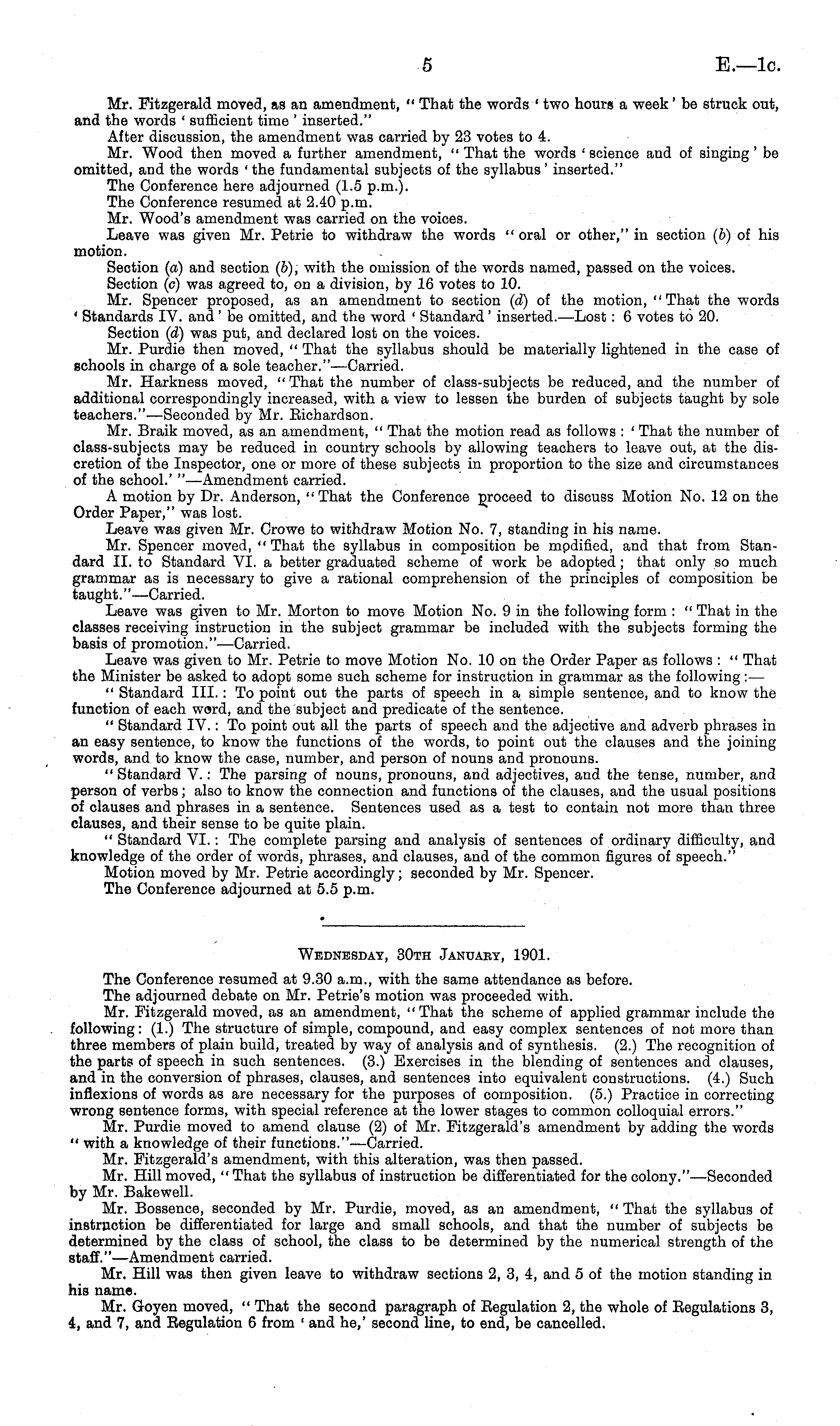 Wednesday, 30th Januaey, 1901. The Conference resumed at 9.30 a.m., with the same attendance as before. The adjourned debate on Mr. Petrie's motion was proceeded with. Mr. Fitzgerald moved, as an amendment, "That the scheme of applied grammar include the following: (1.) The structure of simple, compound, and easy complex sentences of not more than three members of plain build, treated by way of analysis and of synthesis. (2.) The recognition of the parts of speech in such sentences. (3.) Exercises in the blending of sentences and clauses, and in the conversion of phrases, clauses, and sentences into equivalent constructions. (4.) Such inflexions of words as are necessary for the purposes of composition. (5.) Practice in correcting wrong sentence forms, with special reference at the lower stages to common colloquial errors." Mr. Purdie moved to amend clause (2) of Mr. Fitzgerald's amendment by adding the words " with a knowledge of their functions."—Carried. Mr. Fitzgerald's amendment, with this alteration, was then passed. Mr. Hill moved, " That the syllabus of instruction be differentiated for the colony."—Seconded by Mr. Bakewell. Mr. Bossence, seconded by Mr. Purdie, moved, as an amendment, " That the syllabus of instruction be differentiated for large and small schools, and that the number of subjects be determined by the class of school, the class to be determined by the numerical strength of the staff."—Amendment carried. Mr. Hill was then given leave to withdraw sections 2, 3, 4, and 5 of the motion standing in his name. Mr. Goyen moved, " That the second paragraph of Eegulation 2, the whole of Regulations 3, i, and 7, and Regulation 6 from ' and he,' second line, to end, be cancelled.