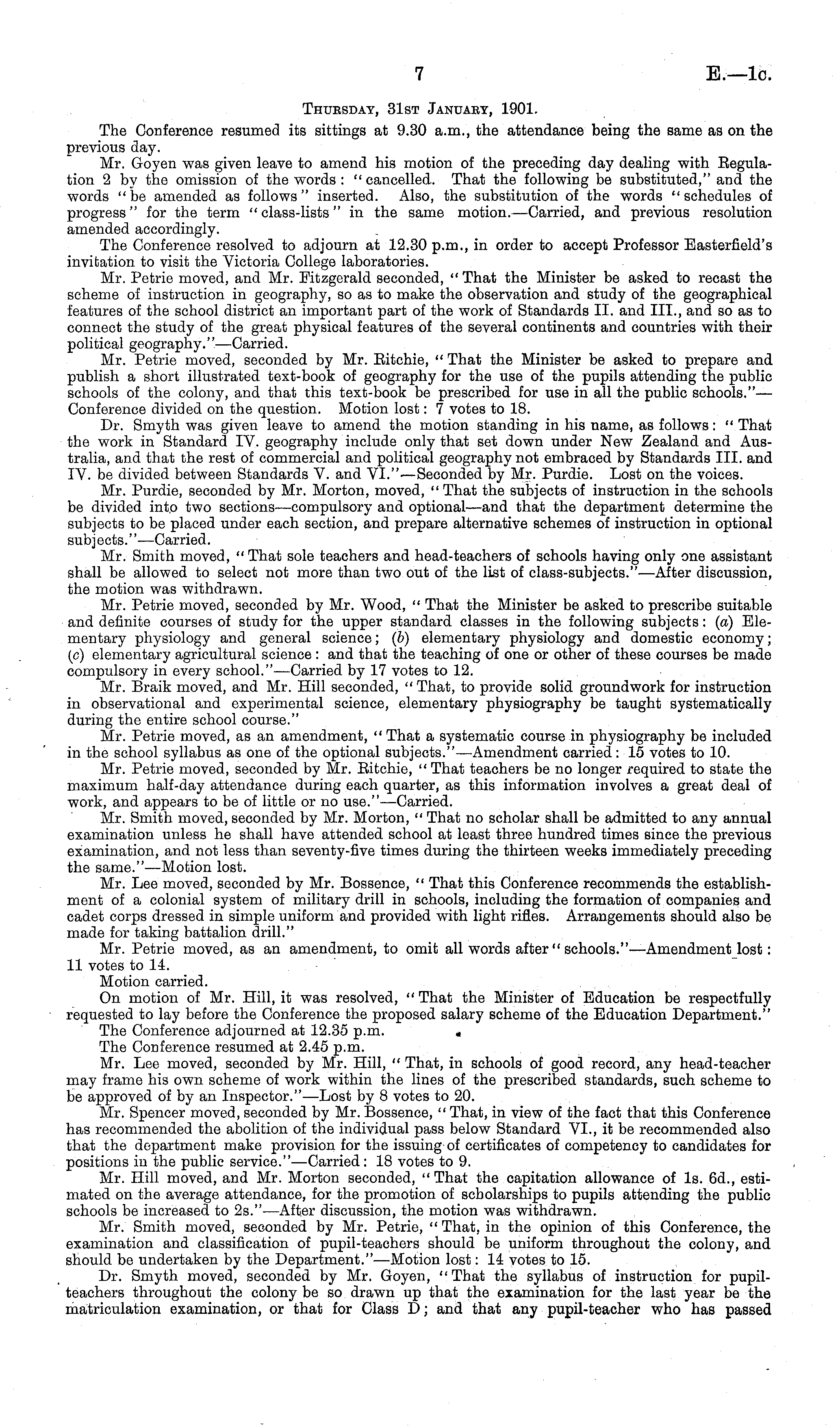 Thursday, 31st January, 1901. The Conference resumed its sittings at 9.30 a.m., the attendance being the same as on the previous day. Mr. Goyen was given leave to amend his motion of the preceding day dealing with Regulation 2 by the omission of the words : " cancelled. That the following be substituted," and the words "be amended as follows" inserted. Also, the substitution of the words "schedules of progress" for the term "class-lists" in the same motion.—Carried, and previous resolution amended accordingly. The Conference resolved to adjourn at 12.30 p.m., in order to accept Professor Easterfield's invitation to visit the Victoria College laboratories. Mr. Petrie moved, and Mr. Fitzgerald seconded, "That the Minister be asked to recast the scheme of instruction in geography, so as to make the observation and study of the geographical features of the school district an important part of the work of Standards 11. and 111., and so as to connect the study of the great physical features of the several continents and countries with their political geography."—Carried. Mr. Petrie moved, seconded by Mr. Ritchie, " That the Minister be asked to prepare and publish a short illustrated text-book of geography for the use of the pupils attending the public schools of the colony, and that this text-book be prescribed for use in all the public schools."— Conference divided on the question. Motion lost: 7 votes to 18. Dr. Smyth was given leave to amend the motion standing in his name, as follows: " That the work in Standard IV. geography include only that set down under New Zealand and Australia, and that the rest of commercial and political geography not embraced by Standards 111. and IV. be divided between Standards V. and Vl."—Seconded by Mr. Purdie. Lost on the voices. Mr. Purdie, seconded by Mr. Morton, moved, " That the subjects of instruction in the schools be divided intp two sections —compulsory and optional—and that the department determine the subjects to be placed under each section, and prepare alternative schemes of instruction in optional subjects.''—Carried. Mr. Smith moved, "That sole teachers and head-teachers of schools having only one assistant shall be allowed to select not more than two out of the list of class-subjects."—After discussion, the motion was withdrawn. Mr. Petrie moved, seconded by Mr. Wood, " That the Minister be asked to prescribe suitable and definite courses of study for the upper standard classes in the following subjects: (a) Elementary physiology and general science; (b) elementary physiology and domestic economy; (c) elementary agricultural science: and that the teaching of one or other of these courses be made compulsory in every school."—Carried by 17 votes to 12. Mr. Braik moved, and Mr. Hill seconded, "That, to provide solid groundwork for instruction in observational and experimental science, elementary physiography be taught systematically during the entire school course." Mr. Petrie moved, as an amendment, " That a systematic course in physiography be included in the school syllabus as one of the optional subjects."—Amendment carried: 15 votes to 10. Mr. Petrie moved, seconded by Mr. Bitchie, " That teachers be no longer required to state the maximum half-day attendance during each quarter, as this information involves a great deal of work, and appears to be of little or no use." —Carried. Mr. Smith moved, seconded by Mr. Morton, " That no scholar shall be admitted to any annual examination unless he shall have attended school at least three hundred times since the previous examination, and not less than seventy-five times during the thirteen weeks immediately preceding the same."—Motion lost. Mr. Lee moved, seconded by Mr. Bossence, " That this Conference recommends the establishment of a colonial system of military drill in schools, including the formation of companies and cadet corps dressed in simple uniform and provided with light rifles. Arrangements should also be made for taking battalion drill." Mr. Petrie moved, as an amendment, to omit all words after " schools."—Amendment lost: 11 votes to 14. Motion carried. On motion of Mr. Hill, it was resolved, " That the Minister of Education be respectfully requested to lay before the Conference the proposed salary scheme of the Education Department." The Conference adjourned at 12.35 p.m. . The Conference resumed at 2.45 p.m. Mr. Lee moved, seconded by Mr. Hill, " That, in schools of good record, any head-teacher may frame his own scheme of work within the lines of the prescribed standards, such scheme to be approved of by an Inspector."—Lost by 8 votes to 20. Mr. Spencer moved, seconded by Mr. Bossence, " That, in view of the fact that this Conference has recommended the abolition of the individual pass below Standard VI., it be recommended also that the department make provision for the issuing of certificates of competency to candidates for positions in the public service."—Carried: 18 votes to 9. Mr. Hill moved, and Mr. Morton seconded, " That the capitation allowance of Is. 6d., estimated on the average attendance, for the promotion of scholarships to pupils attending the public schools be increased to 2s."—After discussion, the motion was withdrawn. Mr. Smith moved, seconded by Mr. Petrie, " That, in the opinion of this Conference, the examination and classification of pupil-teachers should be uniform throughout the colony, and should be undertaken by the Department."—Motion lost: 14 votes to 15. Dr. Smyth moved, seconded by Mr. Goyen, "That the syllabus of instruction for pupilteachers throughout the colony be so drawn up that the examination for the last year be the matriculation examination, or that for Class D; and that any pupil-teacher who has passed