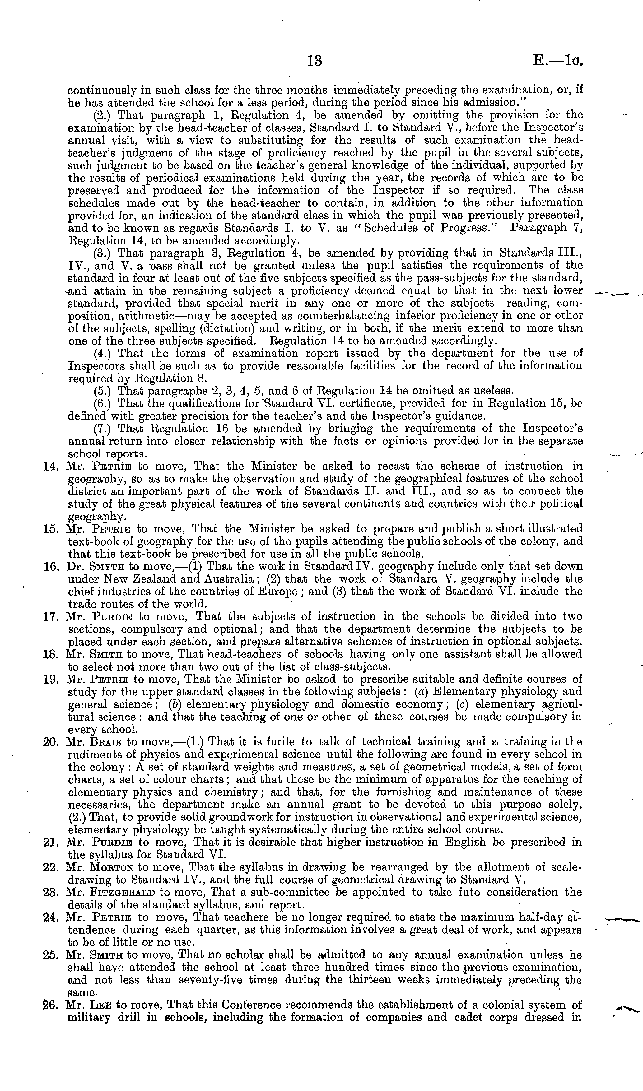continuously in such class for the three months immediately preceding the examination, or, if he has attended the school for a less period, during the period since his admission." (2.) That paragraph 1, Regulation 4, be amended by omitting the provision for the examination by the head-teacher of classes, Standard I. to Standard V., before the Inspector's annual visit, with a view to substituting for the results of such examination the headteacher's judgment of the stage of proficiency reached by the pupil in the several subjects, such judgment to be based on the teacher's general knowledge of the individual, supported by the results of periodical examinations held during the year, the records of which are to be preserved and produced for the information of the Inspector if so required. The class schedules made out by the head-teacher to contain, in addition to the other information provided for, an indication of the standard class in which the pupil was previously presented, and to be known as regards Standards I. to V. as " Schedules of Progress." Paragraph 7, Regulation 14, to be amended accordingly. (3.) That paragraph 3, Regulation 4, be amended by providing that in Standards 111., IV., and V. a pass shall not be granted unless the pupil satisfies the requirements of the standard in four at least out of the five subjects specified as the pass-subjects for the standard, -and attain in the remaining subject a proficiency deemed equal to that in the next lower standard, provided that special merit in any one or more of the subjects—reading, composition, arithmetic—may be accepted as counterbalancing inferior proficiency in one or other of the subjects, spelling (dictation) and writing, or in both, if the merit extend to more than one of the three subjects specified. Regulation 14 to be amended accordingly. (4.) That the forms of examination report issued by the department for the use of Inspectors shall be such as to provide reasonable facilities for the record of the information required by Regulation 8. (5.) That paragraphs 2, 3, 4, 5, and 6 of Regulation 14 be omitted as useless. (6.) That the qualifications for "Standard VI. certificate, provided for in Regulation 15, be defined with greater precision for the teacher's and the Inspector's guidance. (7.) That Regulation 16 be amended by bringing the requirements of the Inspector's annual return into closer relationship with the facts or opinions provided for in the separate school reports. 14. Mr. Petrie to move, That the Minister be asked to recast the scheme of instruction in geography, so as to make the observation and study of the geographical features of the school district an important part of the work of Standards 11. and 111., and so as to connect the study of the great physical features of the several continents and countries with their political geography. 15. Mr. Petrie to move, That the Minister be asked to prepare and publish a short illustrated text-book of geography for the use of the pupils attending the public schools of the colony, and that this text-book be prescribed for use in all the public schools. 16. Dr. Smyth to move, —(1) That the work in Standard IV. geography include only that set down under New Zealand and Australia; (2) that the work of Standard V. geography include the chief industries of the countries of Europe ; and (3) that the work of Standard VI. include the trade routes of the world. 17. Mr. Purdie to move, That the subjects of instruction in the schools be divided into two sections, compulsory and optional; and that the department determine the subjects to be placed under each section, and prepare alternative schemes of instruction in optional subjects. 18. Mr. Smith to move, That head-teachers of schools having only one assistant shall be allowed to select not more than two out of the list of class-subjects. 19. Mr. Petrie to move, That the Minister be asked to prescribe suitable and definite courses of study for the upper standard classes in the following subjects: (a) Elementary physiology and general science; (6) elementary physiology and domestic economy; (c) elementary agricultural science : and that the teaching of one or other of these courses be made compulsory in every school. 20. Mr. Braik to move, —(1.) That it is futile to talk of technical training and a training in the rudiments of physics and experimental science until the following are found in every school in the colony : A set of standard weights and measures, a set of geometrical models, a set of form charts, a set of colour charts; and that these be the minimum of apparatus for the teaching of elementary physics and chemistry; and that, for the furnishing and maintenance of these necessaries, the department make an annual grant to be devoted to this purpose solely. (2.) That, to provide solid groundwork for instruction in observational and experimental science, elementary physiology be taught systematically during the entire school course. 21. Mr. Purdie to move, That it is desirable that higher instruction in English be prescribed in the syllabus for Standard VI. 22. Mr. Morton to move, That the syllabus in drawing be rearranged by the allotment of scaledrawing to Standard IV., and the full course of geometrical drawing to Standard V. 23. Mr. Fitzgerald to move, That a sub-committee be appointed to take into consideration the details of the standard syllabus, and report. 24. Mr. Petrie to move, That teachers be no longer required to state the maximum half-day attendence during each quarter, as this information involves a great deal of work, and appears to be of little or no use. 25. Mr. Smith to move, That no scholar shall be admitted to any annual examination unless he shall have attended the school at least three hundred times since the previous examination, and not less than seventy-five times during the thirteen weeks immediately preceding the same, 26. Mr. Lee to move, That this Conference recommends the establ