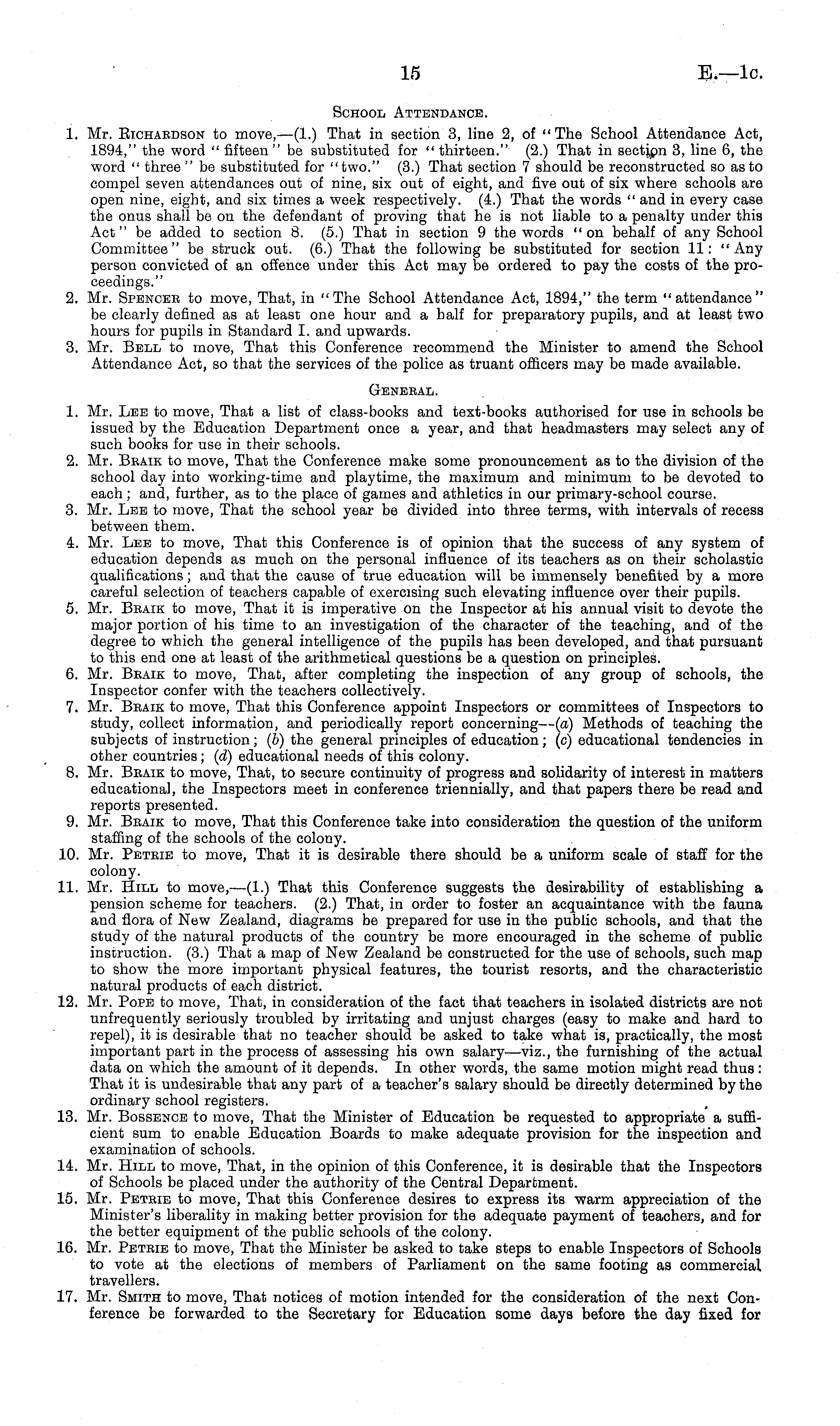 School Attendance. 1. Mr. Richardson to move, —(1.) That in section 3, line 2, of " The School Attendance Act, 1894," the word " fifteen" be substituted for " thirteen." (2.) That in sectipn 3, line 6, the word " three "be substituted for "two." (3.) That section 7 should be reconstructed so as to compel seven attendances out of nine, six out of eight, and five out of six where schools are open nine, eight, and six times a week respectively. (4.) That the words " and in every case the onus shall be on the defendant of proving that he is not liable to a penalty under this Act" be added to section 8. (5.) That in section 9 the words "on behalf of any School Committee" be struck out. (6.) That the following be substituted for section 11: " Any person convicted of an offence under this Act may be ordered to pay the costs of the proceedings." 2. Mr. Spencer to move, That, in "The School Attendance Act, 1894," the term "attendance" be clearly defined as at least one hour and a half for preparatory pupils, and at least two hours for pupils in Standard I. and upwards. 3. Mr. Bell to move, That this Conference recommend the Minister to amend the School Attendance Act, so that the services of the police as truant officers may be made available. General. 1. Mr. Lee to move, That a list of class-books and text-books authorised for use in schools be issued by the Education Department once a year, and that headmasters may select any of such books for use in their schools. 2. Mr. Braik to move, That the Conference make some pronouncement as to the division of the school day into working-time and playtime, the maximum and minimum to be devoted to each; and, further, as to the place of games and athletics in our primary-school course. 3. Mr. Lee to move, That the school year be divided into three terms, with intervals of recess between them. 4. Mr. Lee to move, That this Conference is of opinion that the success of any system of education depends as much on the personal influence of its teachers as on their scholastic qualifications; and that the cause of true education will be immensely benefited by a more careful selection of teachers capable of exercising such elevating influence over their pupils. 5. Mr. Braik to move, That it is imperative on the Inspector at his annual visit to devote the major portion of his time to an investigation of the character of the teaching, and of the degree to which the general intelligence of the pupils has been developed, and that pursuant to this end one at least of the arithmetical questions be a question on principles. 6. Mr. Braik to move, That, after completing the inspection of any group of schools, the Inspector confer with the teachers collectively. 7. Mr. Braik to move, That this Conference appoint Inspectors or committees of Inspectors to study, collect information, and periodically report concerning— (a) Methods of teaching the subjects of instruction; (b) the general principles of education; (c) educational tendencies in other countries; (d) educational needs of this colony. 8. Mr. Braik to move, That, to secure continuity of progress and solidarity of interest in matters educational, the Inspectors meet in conference triennially, and that papers there be read and reports presented. 9. Mr. Braik to move, That this Conference take into consideration the question of the uniform staffing of the schools of the colony. 10. Mr. Petrie to move, That it is desirable there should be a uniform scale of staff for the colony. 11. Mr. Hill to move, —(1.) That this Conference suggests the desirability of establishing a pension scheme for teachers. (2.) That, in order to foster an acquaintance with the fauna and flora of New Zealand, diagrams be prepared for use in the public schools, and that the study of the natural products of the country be more encouraged in the scheme of public instruction. (3.) That a map of New Zealand be constructed for the use of schools, such map to show the more important physical features, the tourist resorts, and the characteristic natural products of each district. 12. Mr. Pope to move, That, in consideration of the fact that teachers in isolated districts are not unfrequently seriously troubled by irritating and unjust charges (easy to make and hard to repel), it is desirable that no teacher should be asked to take what is, practically, the most important part in the process of assessing his own salary—viz., the furnishing of the actual data on which the amount of it depends. In other word 3, the same motion might read thus : That it is undesirable that any part of a teacher's salary should be directly determined by the ordinary school registers. 13. Mr. Bossence to move, That the Minister of Education be requested to appropriate a sufficient sum to enable Education Boards to make adequate provision for the inspection and examination of schools. 14. Mr. Hill to move, That, in the opinion of this Conference, it is desirable that the Inspectors of Schools be placed under the authority of the Central Department. 15. Mr. Petrie to move, That this Conference desires to express its warm appreciation of the Minister's liberality in making better provision for the adequate payment of teachers, and for the better equipment of the public schools of the colony. 16. Mr. Petrie to move, That the Minister be asked to take steps to enable Inspectors of Schools to vote at the elections of members of Parliament on the same footing as commercial travellers. 17. Mr. Smith to move, That notices of motion intended for the consideration of the next Conference be forwarded to the Secretary for Education some days before the day fixed for